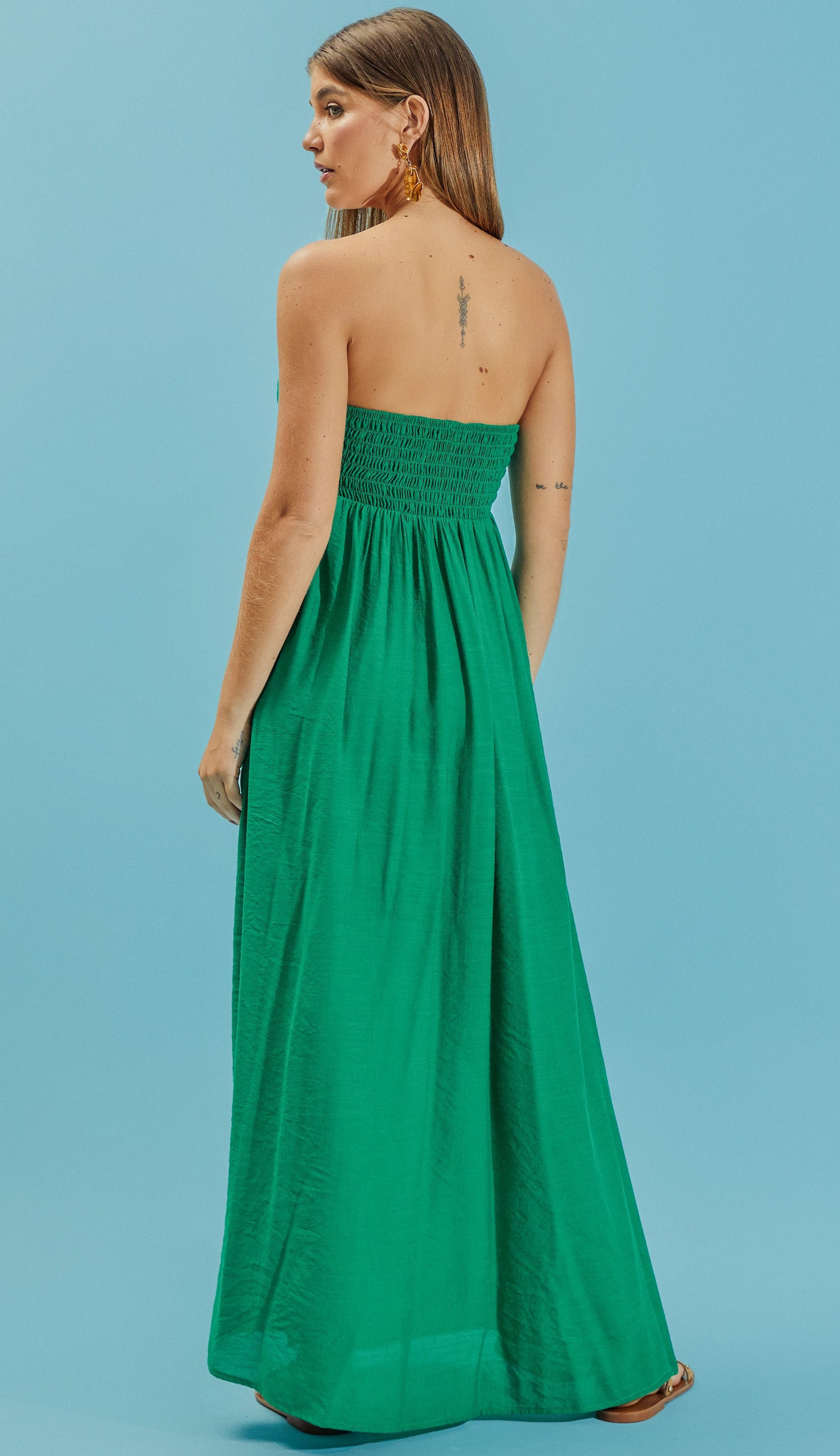 Vestido longo com forro, confeccionado em poliviscose texturizada com aspecto de linho e efeito amassadinho. Possui decote aberto com alças trançadas reguláveis que são embutidas no busto, deixando um detalhe franzido super charmoso. Conta ainda com lastex nas costas para maior conforto e fenda frontal na saia.