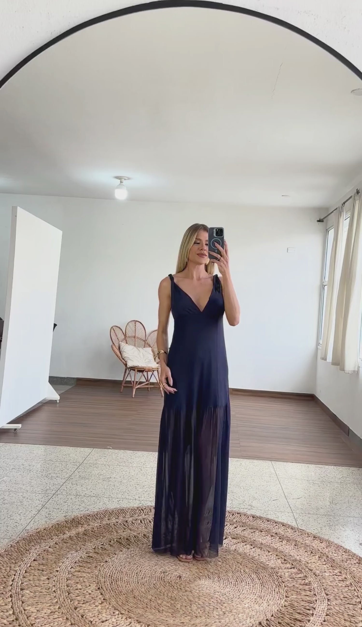 Vestido longo confeccionado em tule com forro. Possui decote em V, alças trançadas com reguladores de metal, fechamento traseiro por zíper invisível e modelagem justinha até a região do quadril, aonde conta com um recorte com franzidinhos na saia, deixando a saia bem soltinha e leve. Essa região da saia não tem forro e fica com uma transparência muito charmosa e delicada, criando um aspecto ainda mais fluido e romântico.