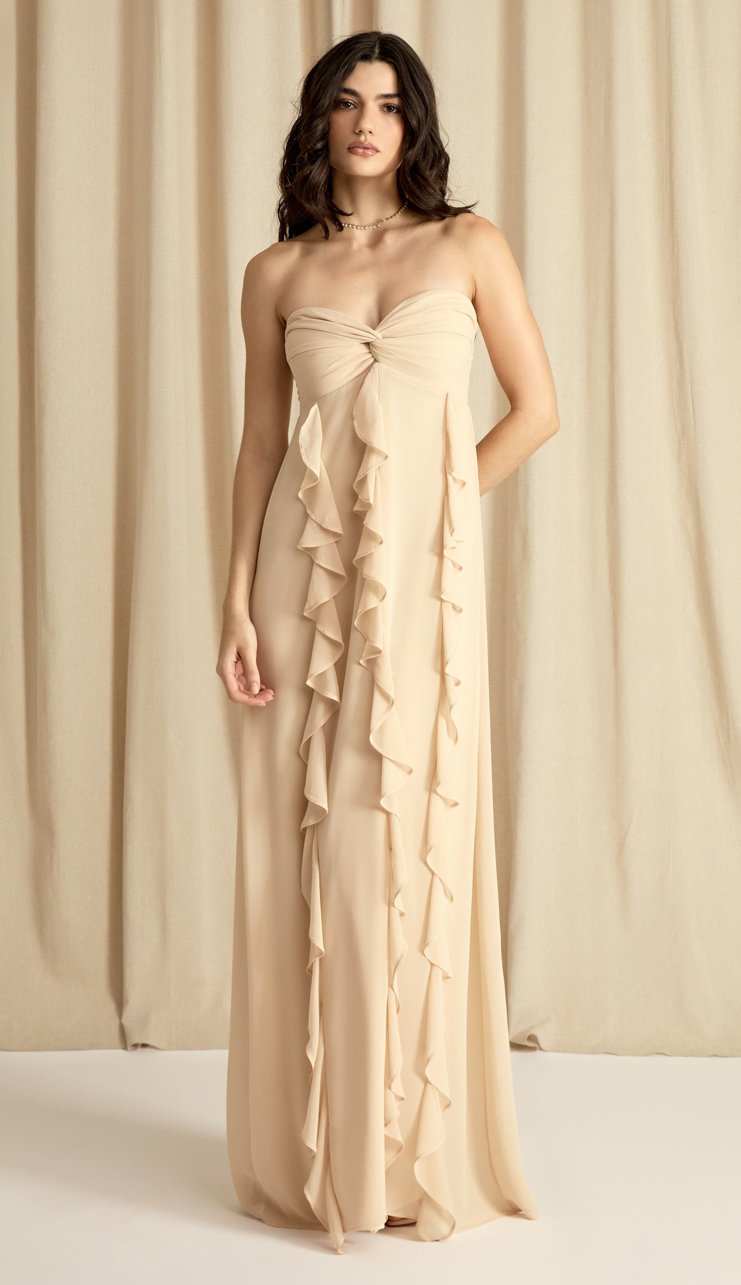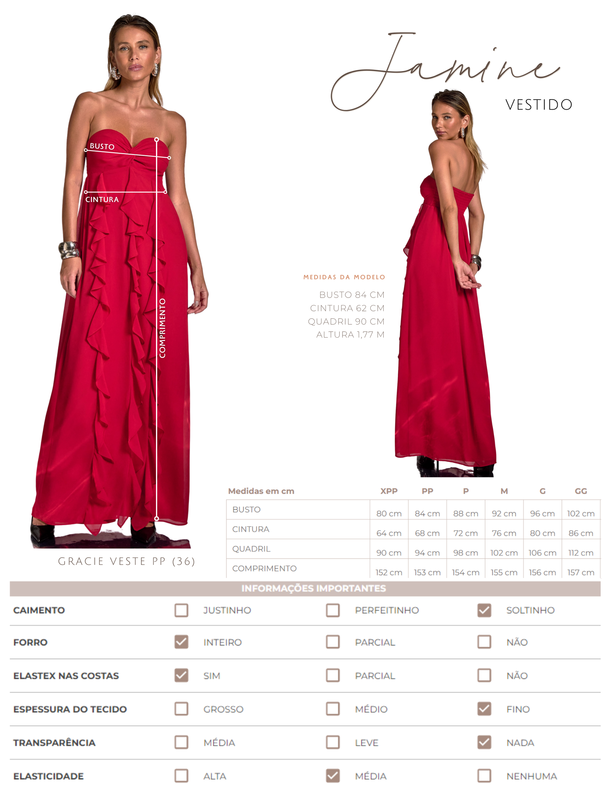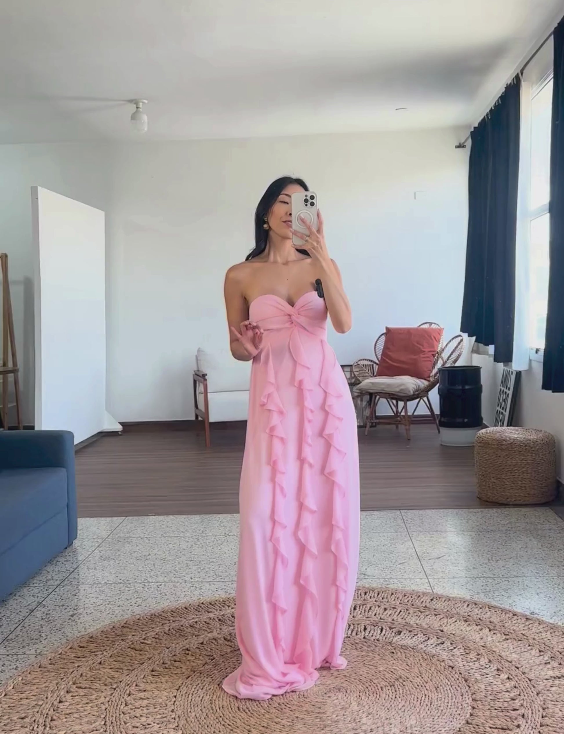 Vestido longo sem mangas confeccionado em crepe com forro. Possui decote coração com nó em transpasse fixo no centro do busto, deixando franzidinho; silicone interno no decote para maior sustentação; modelagem império, com marcação logo abaixo do busto e saia soltinha; recortes frontais com aplicação de babados em todo o comprimento e lastex nas costas para maior conforto.