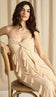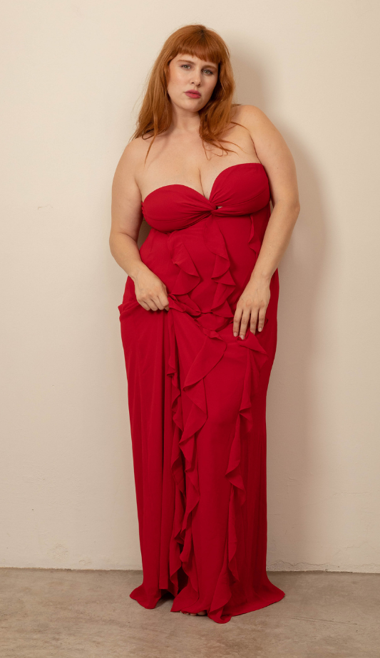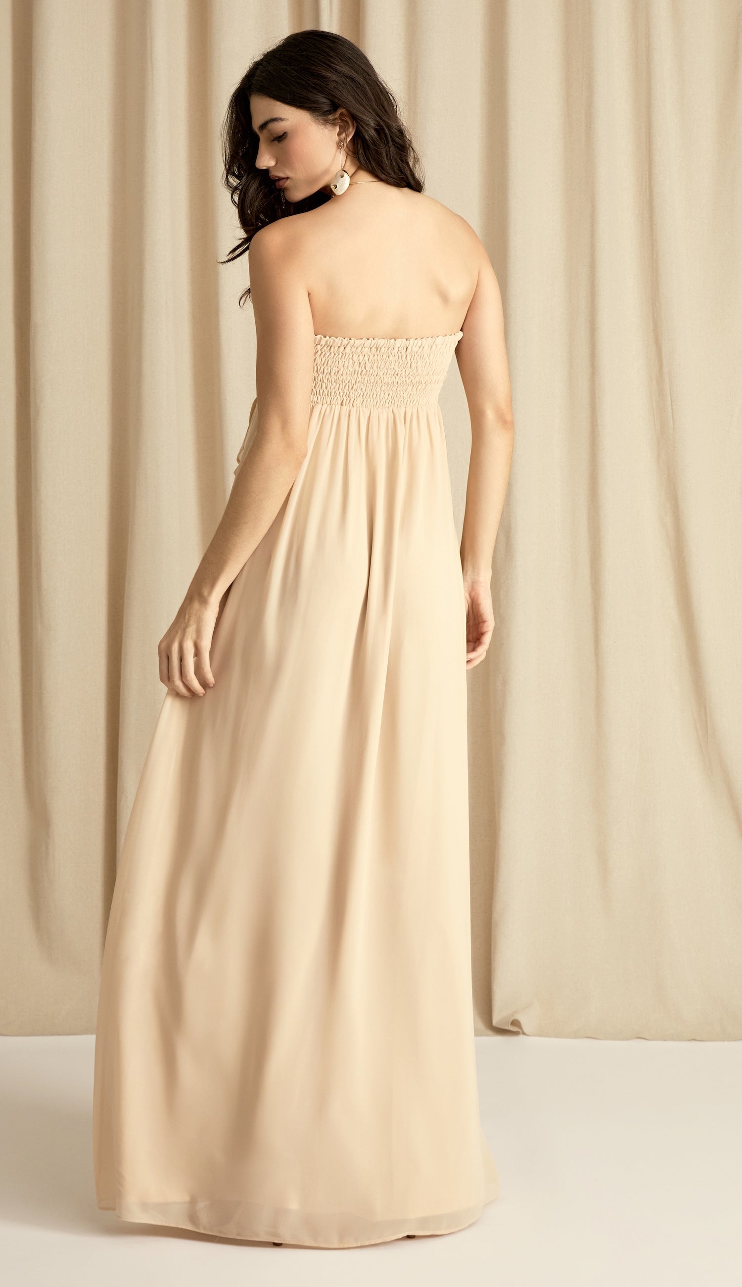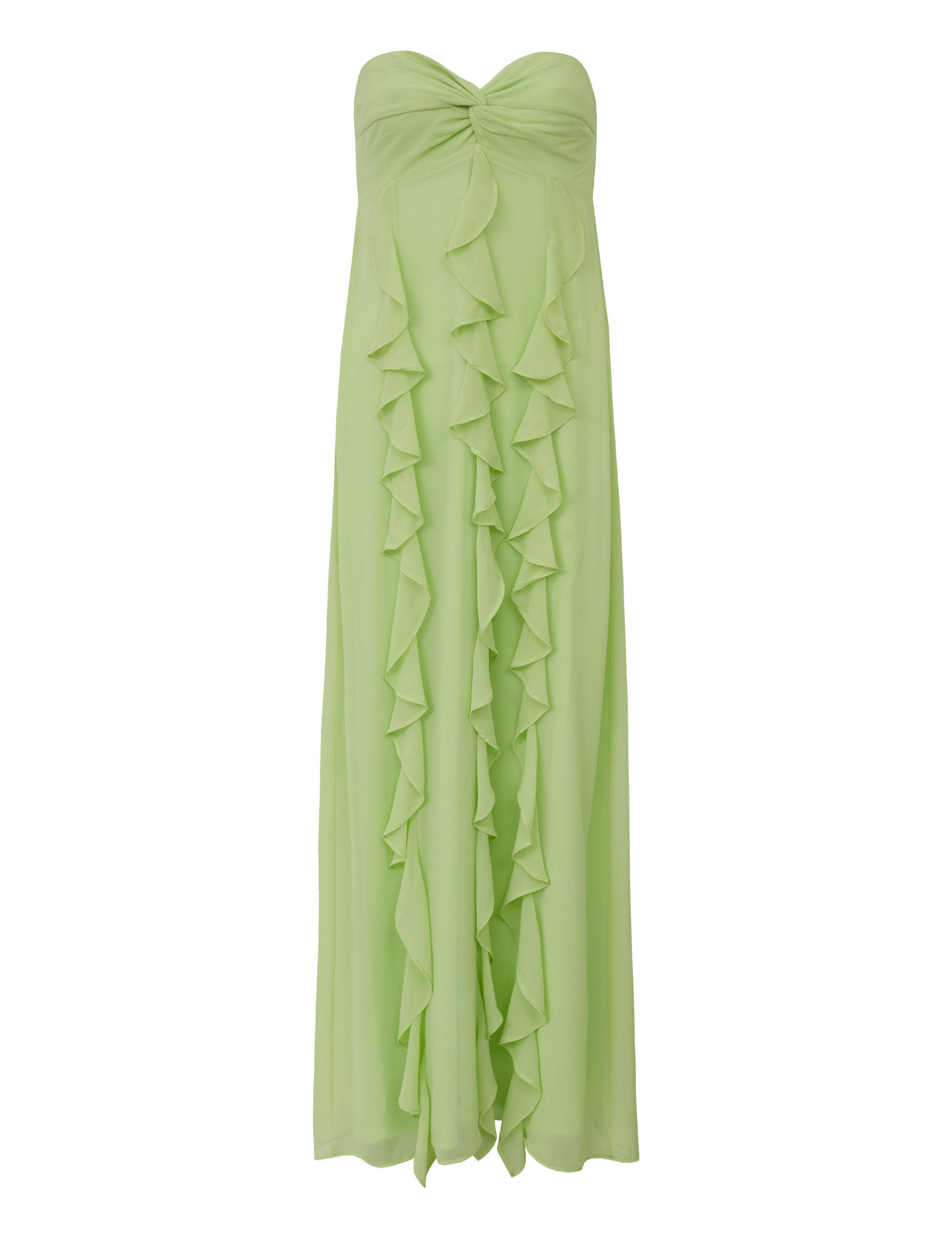 Vestido longo sem mangas confeccionado em crepe com forro. Possui decote coração com nó em transpasse fixo no centro do busto, deixando franzidinho; silicone interno no decote para maior sustentação; modelagem império, com marcação logo abaixo do busto e saia soltinha; recortes frontais com aplicação de babados em todo o comprimento e lastex nas costas para maior conforto.