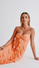 Vestido longo sem mangas confeccionado em crepe com forro. Possui decote coração com nó em transpasse fixo no centro do busto, deixando franzidinho; silicone interno no decote para maior sustentação; modelagem império, com marcação logo abaixo do busto e saia soltinha; recortes frontais com aplicação de babados em todo o comprimento e lastex nas costas para maior conforto.