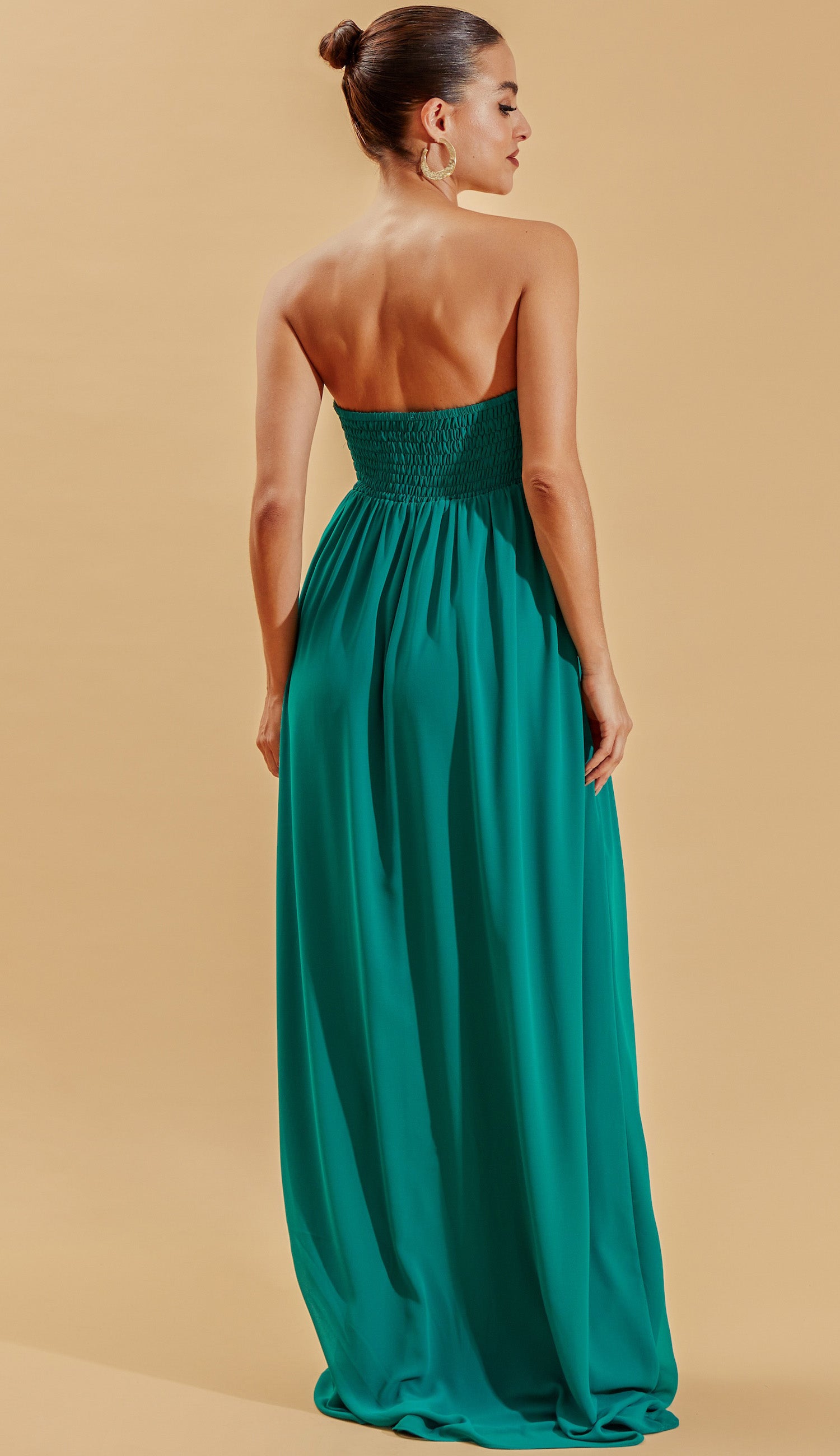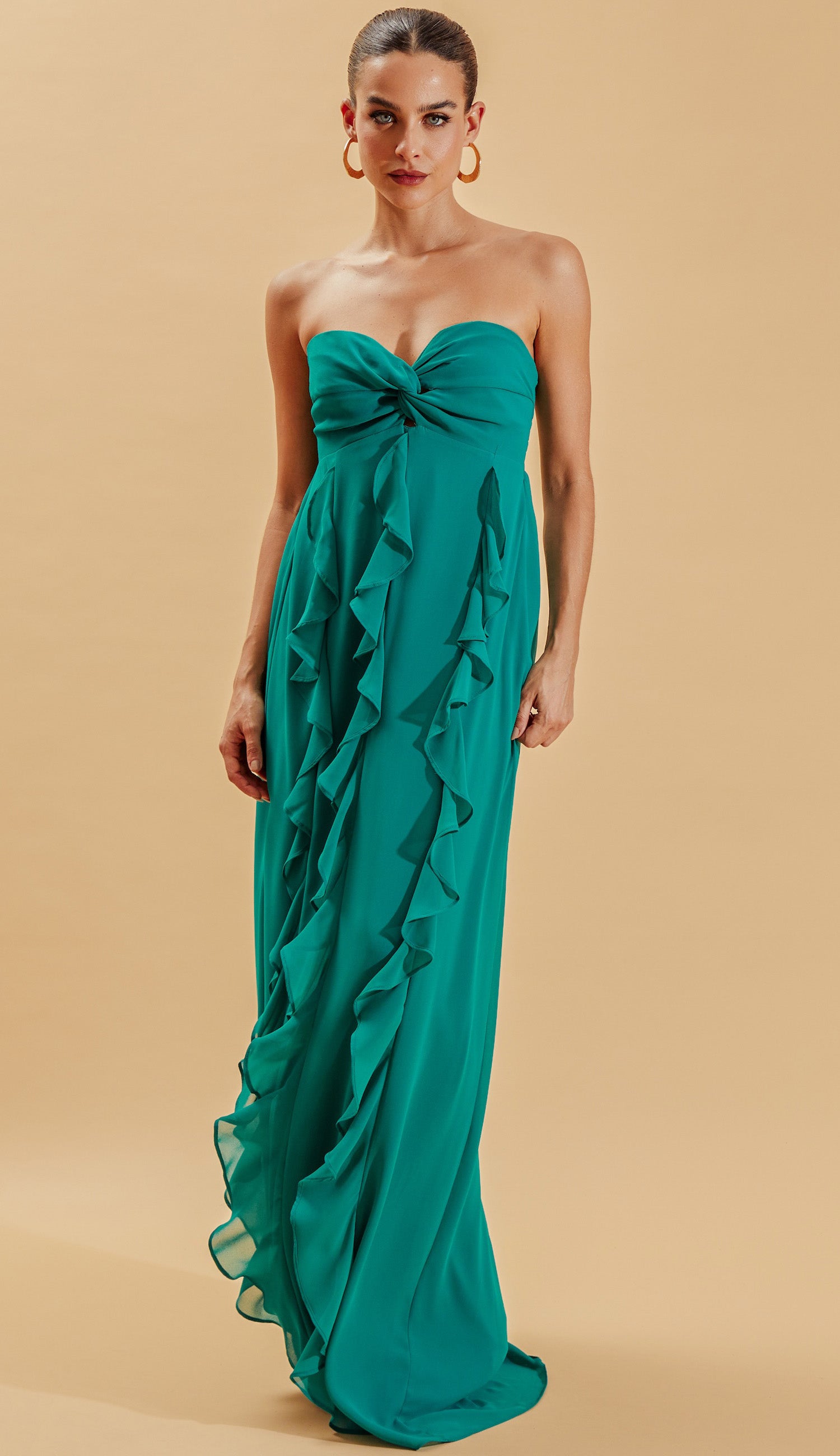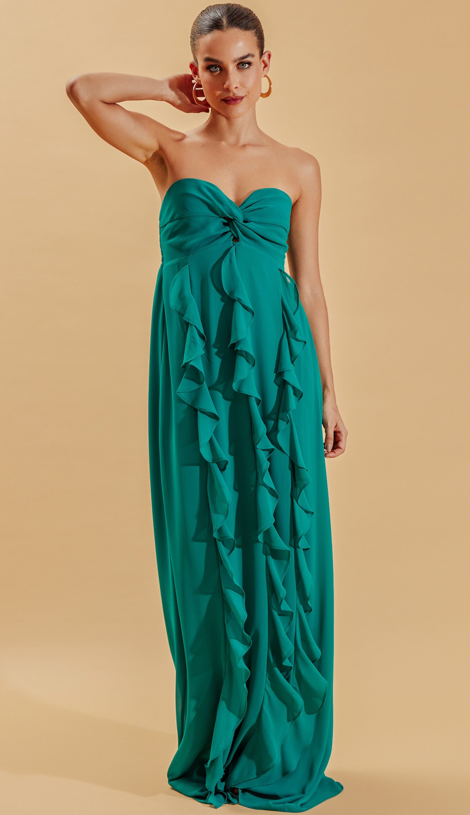 Vestido longo sem mangas confeccionado em crepe com forro. Possui decote coração com nó em transpasse fixo no centro do busto, deixando franzidinho; silicone interno no decote para maior sustentação; modelagem império, com marcação logo abaixo do busto e saia soltinha; recortes frontais com aplicação de babados em todo o comprimento e lastex nas costas para maior conforto.