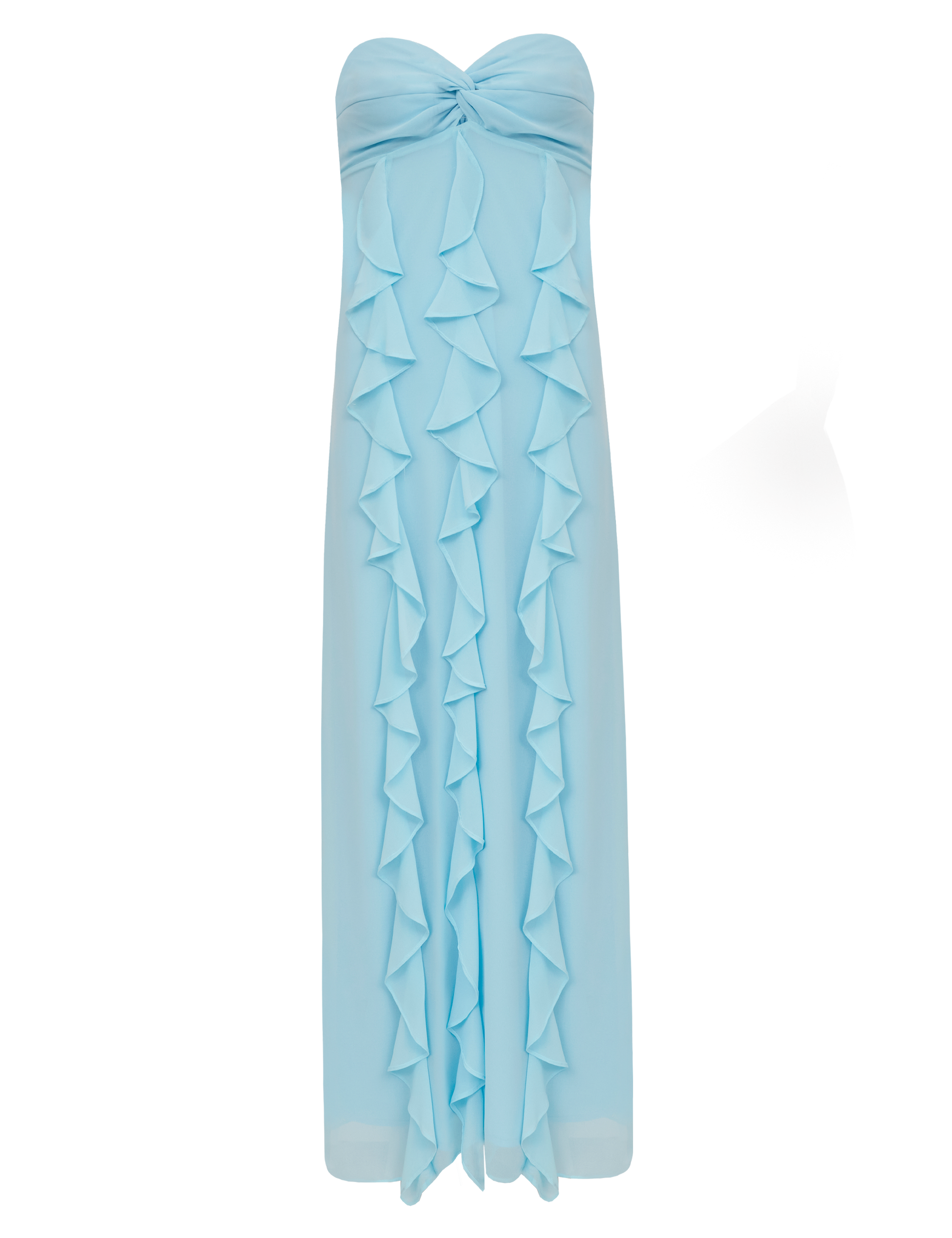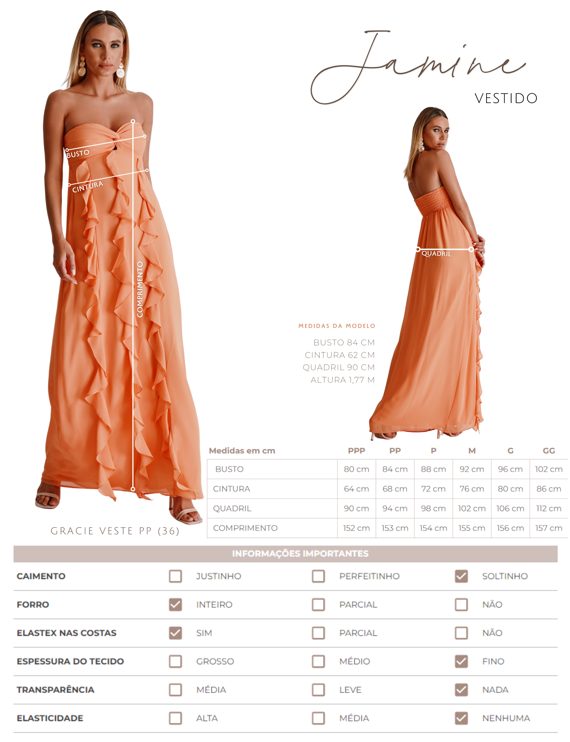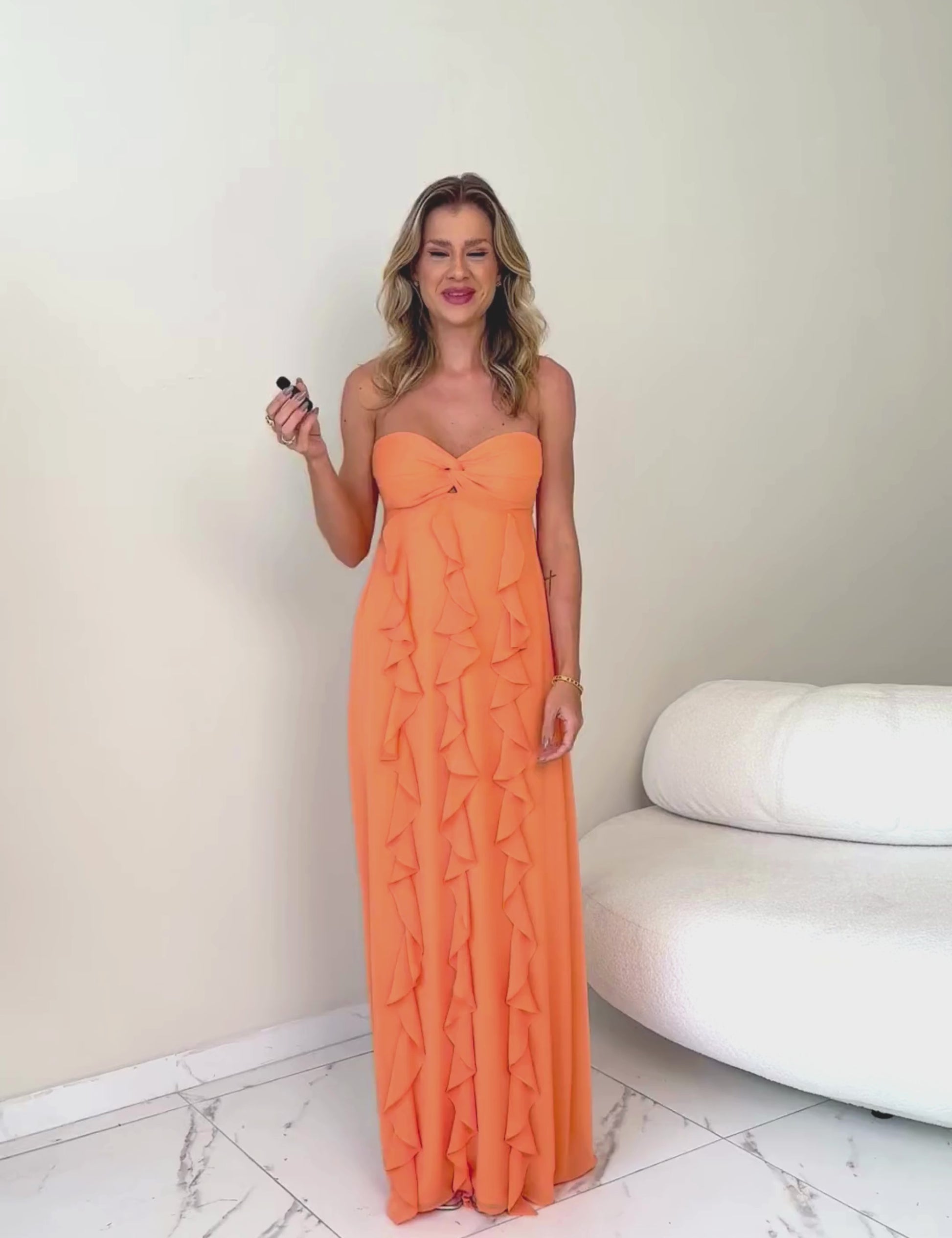 Vestido longo sem mangas confeccionado em crepe com forro. Possui decote coração com nó em transpasse fixo no centro do busto, deixando franzidinho; silicone interno no decote para maior sustentação; modelagem império, com marcação logo abaixo do busto e saia soltinha; recortes frontais com aplicação de babados em todo o comprimento e lastex nas costas para maior conforto.