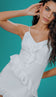 Vestido curto confeccionado em linho com forro. Possui decote em V com babados na frente, alcinhas reguláveis, fechamento lateral por zíper invisível, modelagem ajustada e babados diagonais na saia.