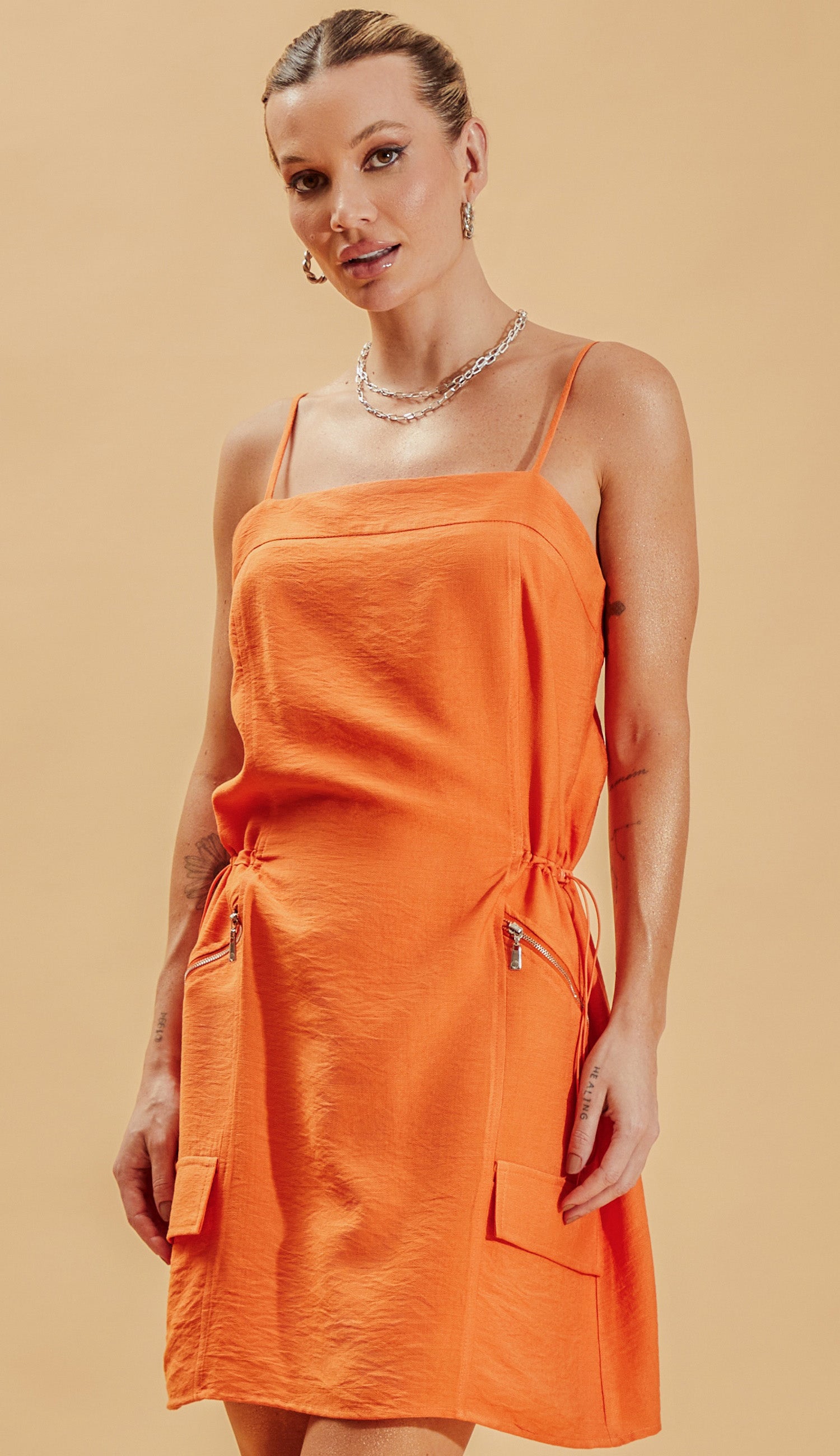 Vestido curto com forro, confeccionado em crepe de poliviscose mais encorpadinho com aspecto de linho e efeito amassadinho. Possui decote reto com pala, alcinhas reguláveis, recortes frontais e traseiros, modelagem soltinha, detalhe de elástico embutido com reguladores nas laterais da cintura para ajustar a silhueta, zíper de metal de enfeite nas laterais em diagonal e bolsos laterais próximos à barra com lapela.