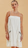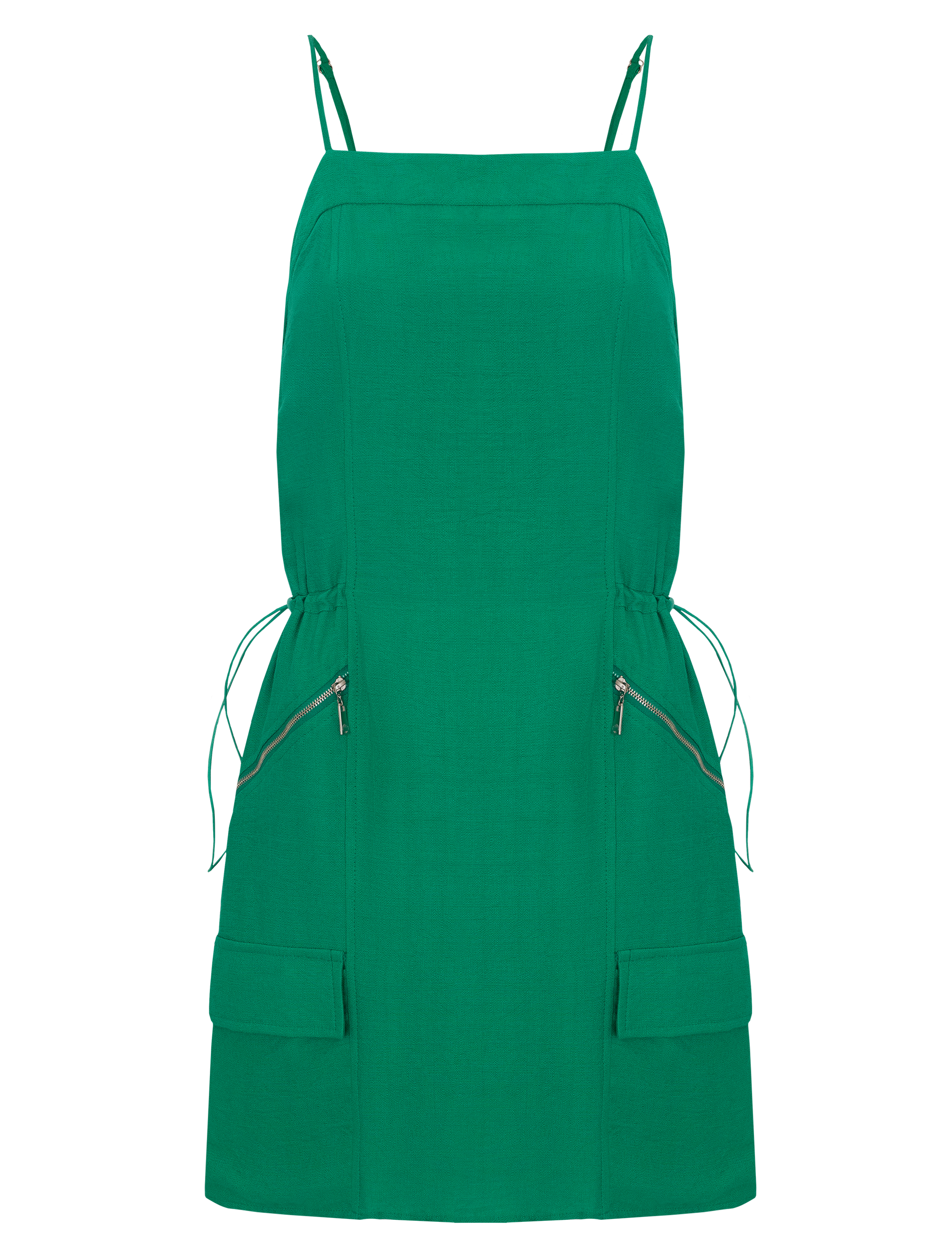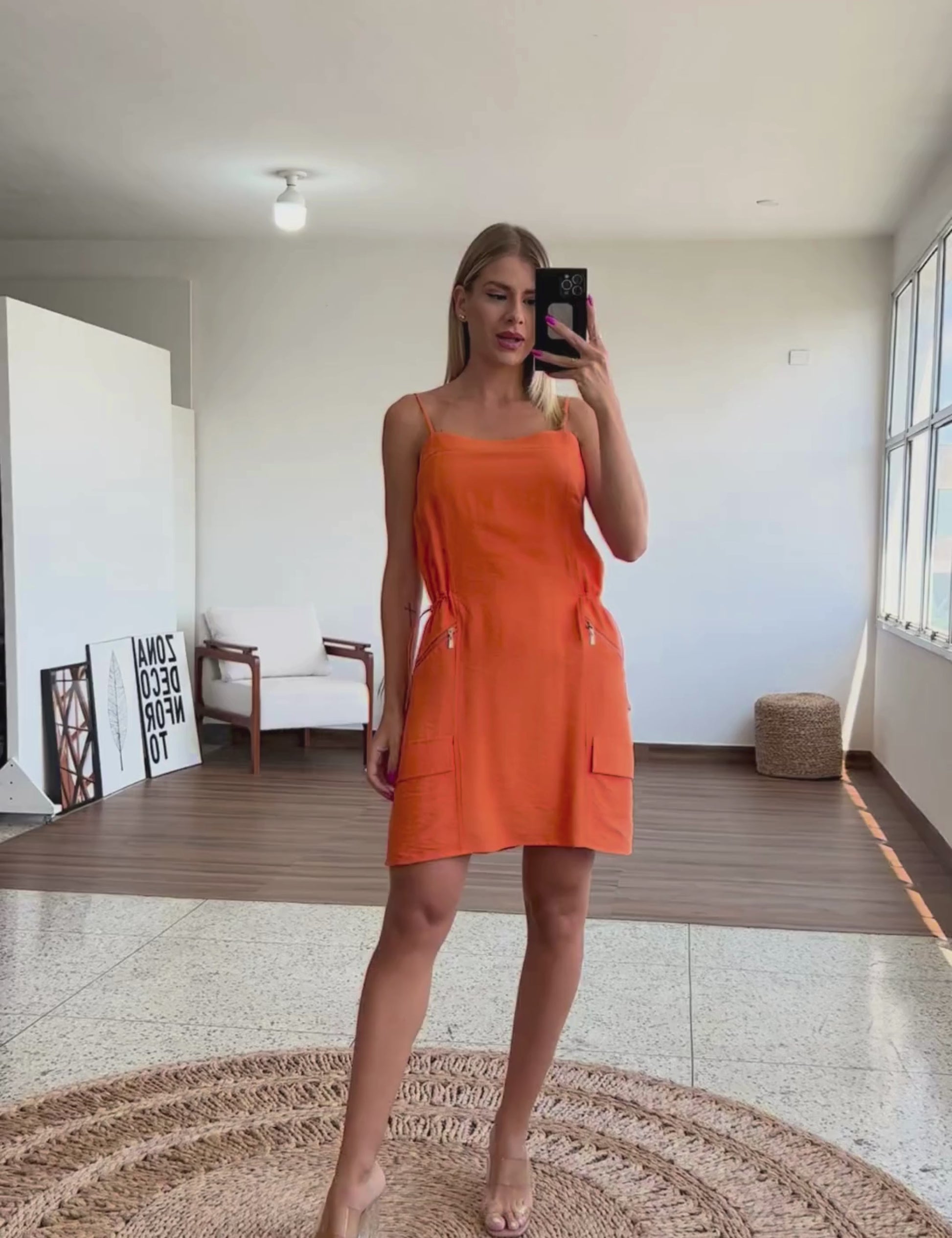 Vestido curto com forro, confeccionado em crepe de poliviscose mais encorpadinho com aspecto de linho e efeito amassadinho. Possui decote reto com pala, alcinhas reguláveis, recortes frontais e traseiros, modelagem soltinha, detalhe de elástico embutido com reguladores nas laterais da cintura para ajustar a silhueta, zíper de metal de enfeite nas laterais em diagonal e bolsos laterais próximos à barra com lapela.