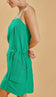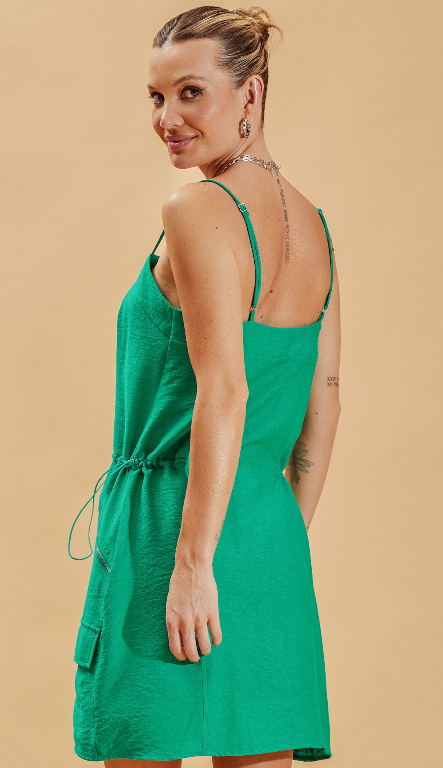 Vestido curto com forro, confeccionado em crepe de poliviscose mais encorpadinho com aspecto de linho e efeito amassadinho. Possui decote reto com pala, alcinhas reguláveis, recortes frontais e traseiros, modelagem soltinha, detalhe de elástico embutido com reguladores nas laterais da cintura para ajustar a silhueta, zíper de metal de enfeite nas laterais em diagonal e bolsos laterais próximos à barra com lapela.