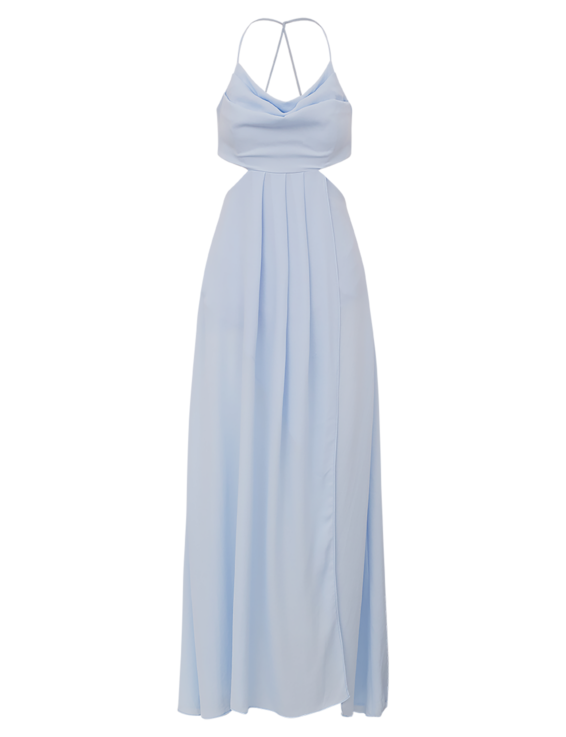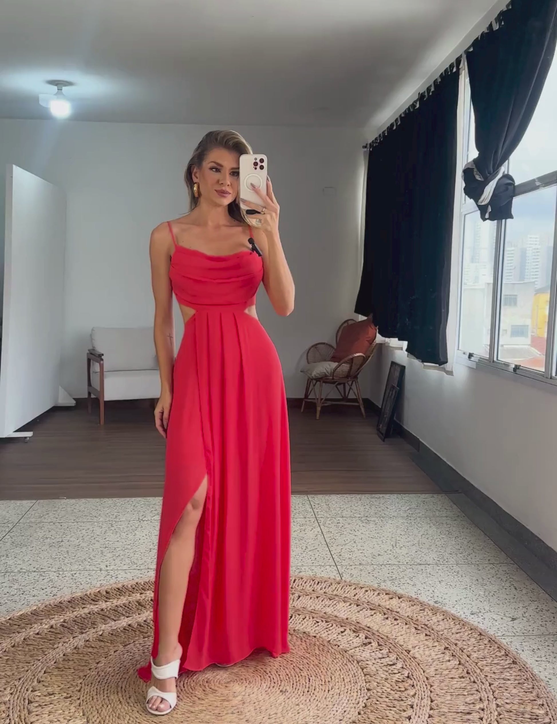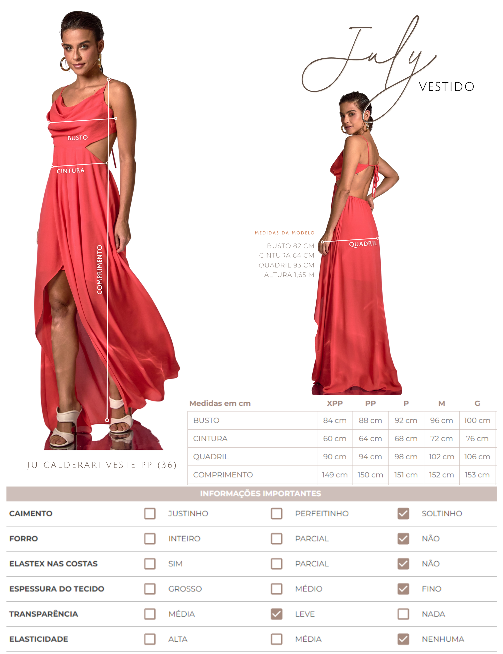 Vestido longo confeccionado em crepe com forro. Possui decote degagê, alcinhas compridas para amarração cruzada nas costas, busto fixo à saia somente por recorte frontal, deixando toda a região da cintura à mostra. As costas são abertas, em um lindo decote e a saia possui elástico franzido para melhor ajuste ao corpo, pregas frontais e transpasse frontal deixando um detalhe assimétrico e uma fenda super elegante.