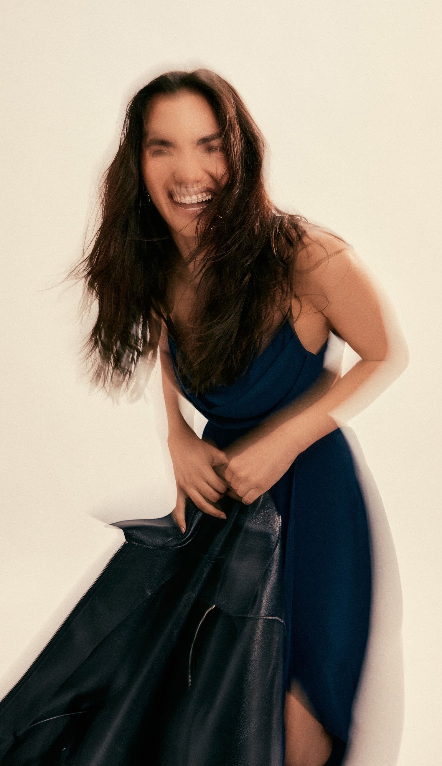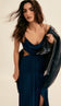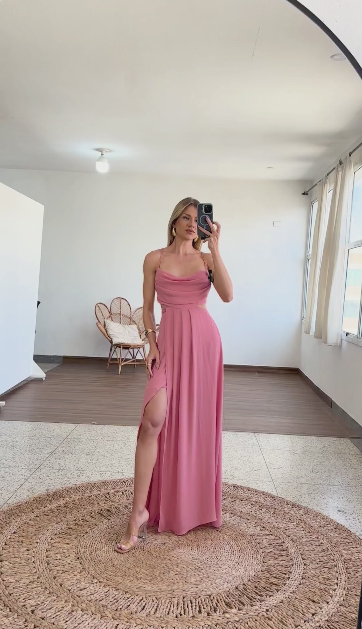 Vestido longo confeccionado em crepe. Possui tecido duplo no busto e forro do mesmo tecido na saia para não ficar transparente; decote degagê, alcinhas compridas para amarração cruzada nas costas, busto fixo à saia somente por recorte frontal, deixando toda a região da cintura à mostra. As costas são abertas, em um lindo decote e a saia possui elástico franzido para melhor ajuste ao corpo, pregas frontais e transpasse frontal deixando um detalhe assimétrico e uma fenda super elegante.