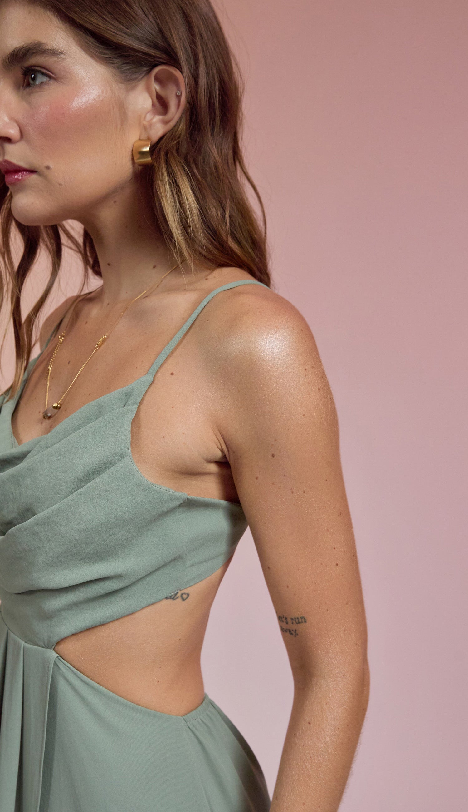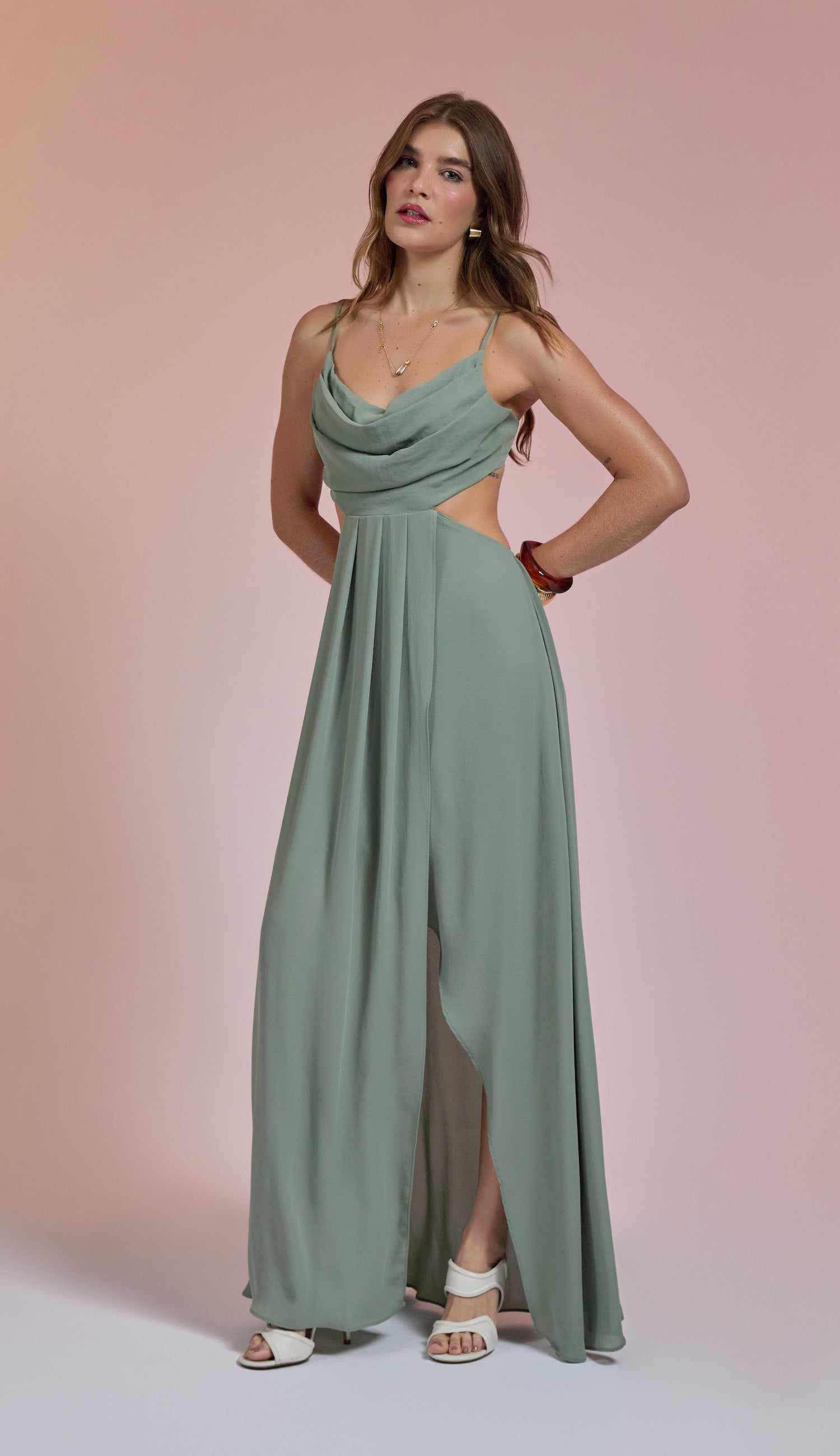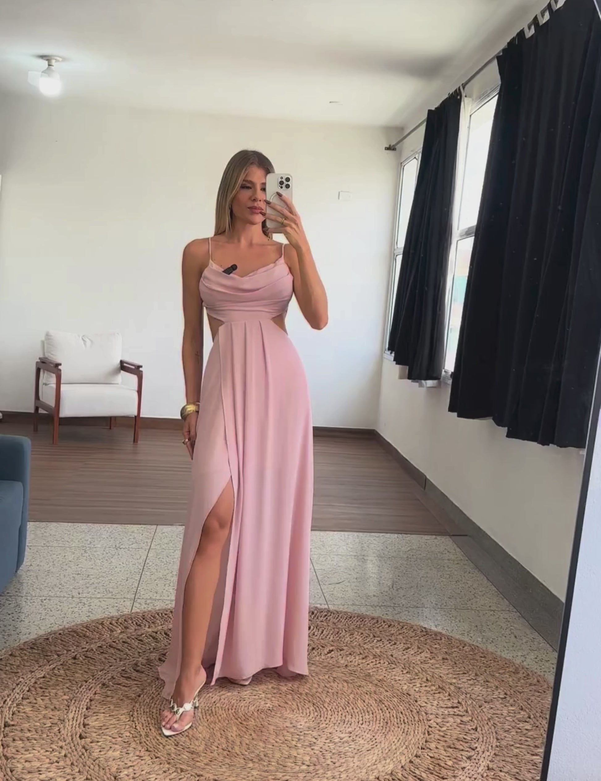 Vestido longo confeccionado em crepe. Possui tecido duplo no busto e forro do mesmo tecido na saia para não ficar transparente; decote degagê, alcinhas compridas para amarração cruzada nas costas, busto fixo à saia somente por recorte frontal, deixando toda a região da cintura à mostra. As costas são abertas, em um lindo decote e a saia possui elástico franzido para melhor ajuste ao corpo, pregas frontais e transpasse frontal deixando um detalhe assimétrico e uma fenda super elegante.