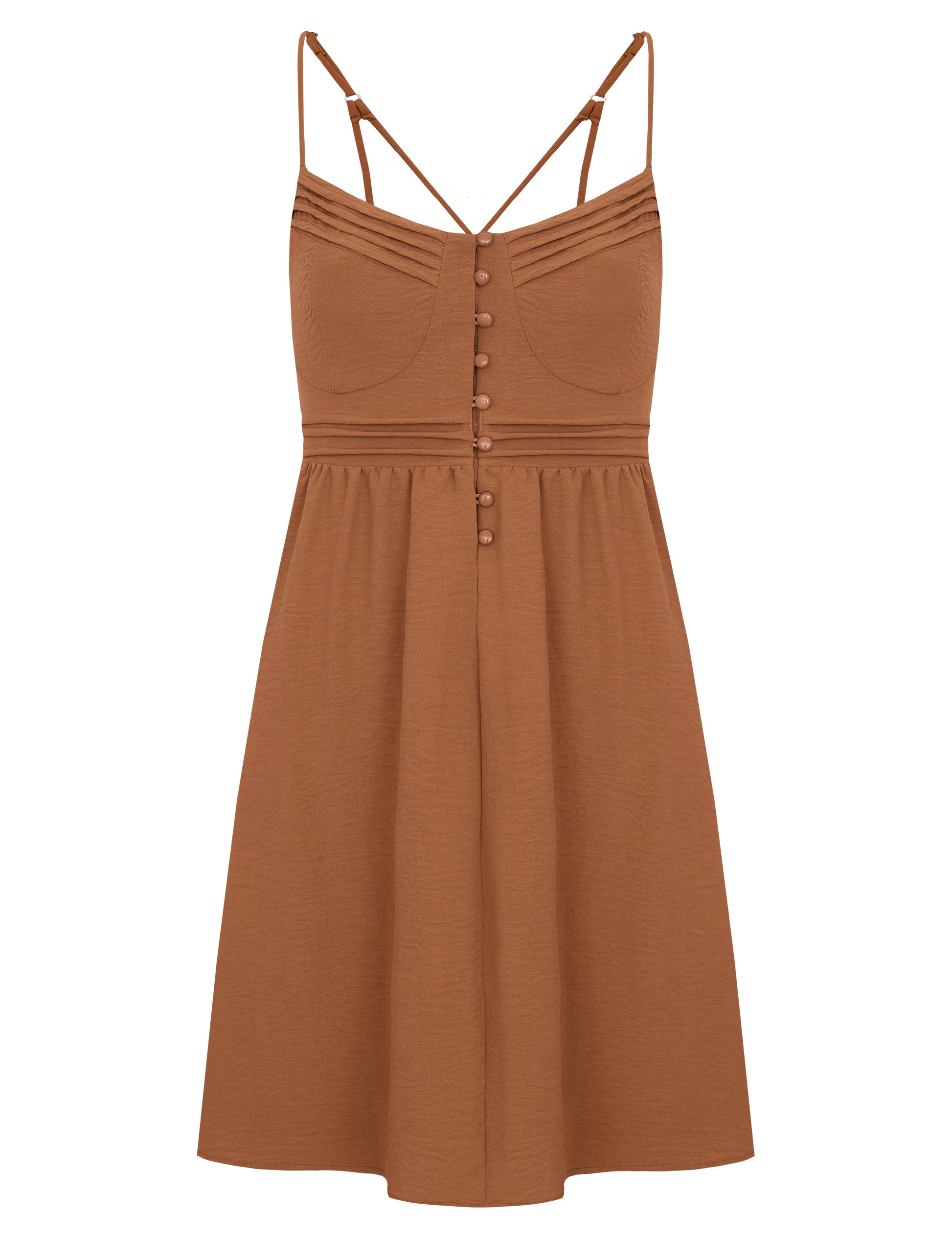 Vestido curto com forro, confeccionado em crepe texturizado com efeito amassadinho. Possui modelagem império com marcação logo abaixo do busto e saia soltinha; decote princesa com recortes que modelam a peça e detalhe de preguinhas na pala do busto e da cintura, onde é franzidinho. Conta com fechamento frontal por botões esmaltados, alcinhas reguláveis com detalhe duplo nas costas cruzado e elástico interno também nas costas para melhor ajuste ao corpo.