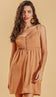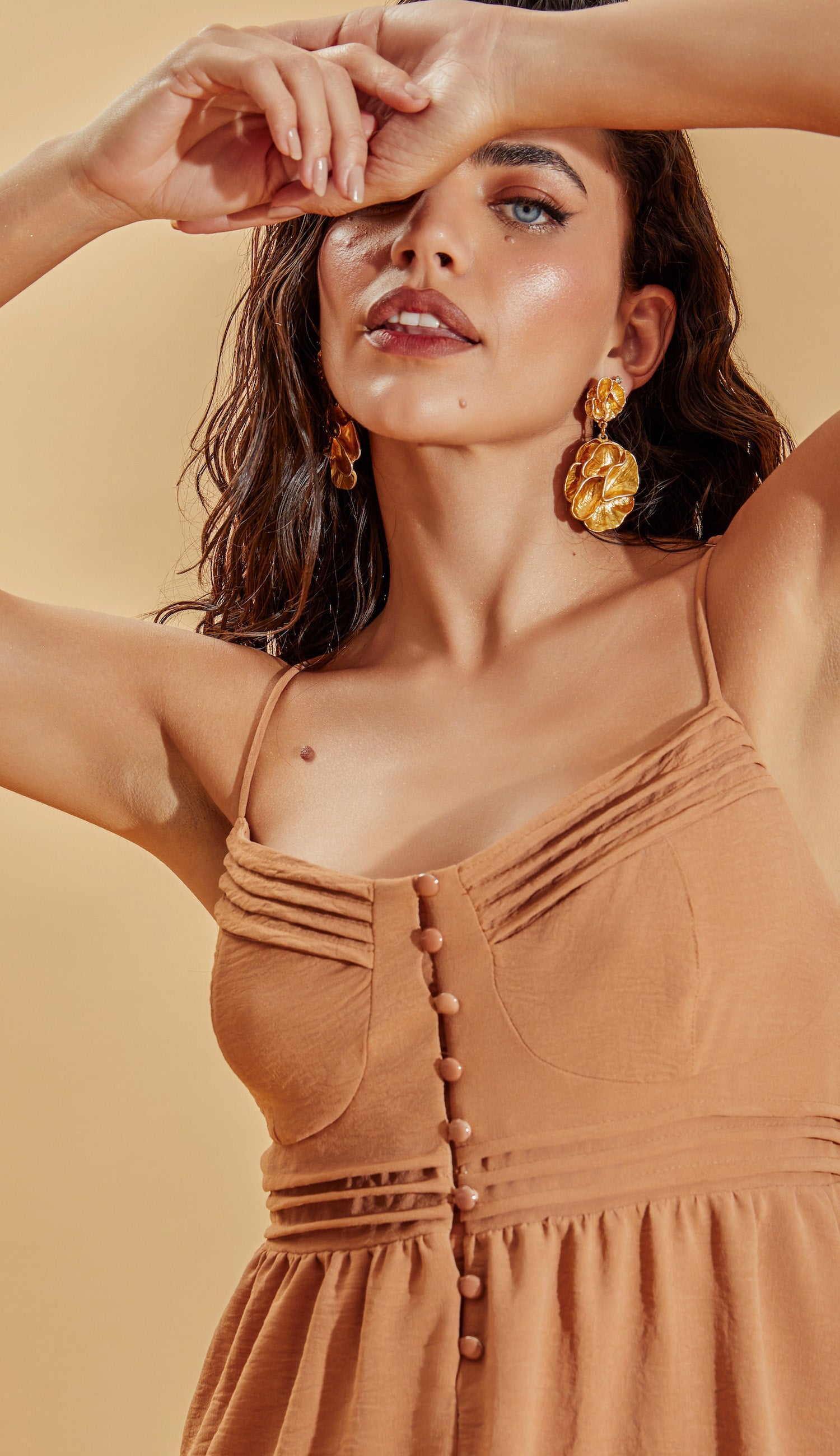 Vestido curto com forro, confeccionado em crepe texturizado com efeito amassadinho. Possui modelagem império com marcação logo abaixo do busto e saia soltinha; decote princesa com recortes que modelam a peça e detalhe de preguinhas na pala do busto e da cintura, onde é franzidinho. Conta com fechamento frontal por botões esmaltados, alcinhas reguláveis com detalhe duplo nas costas cruzado e elástico interno também nas costas para melhor ajuste ao corpo.