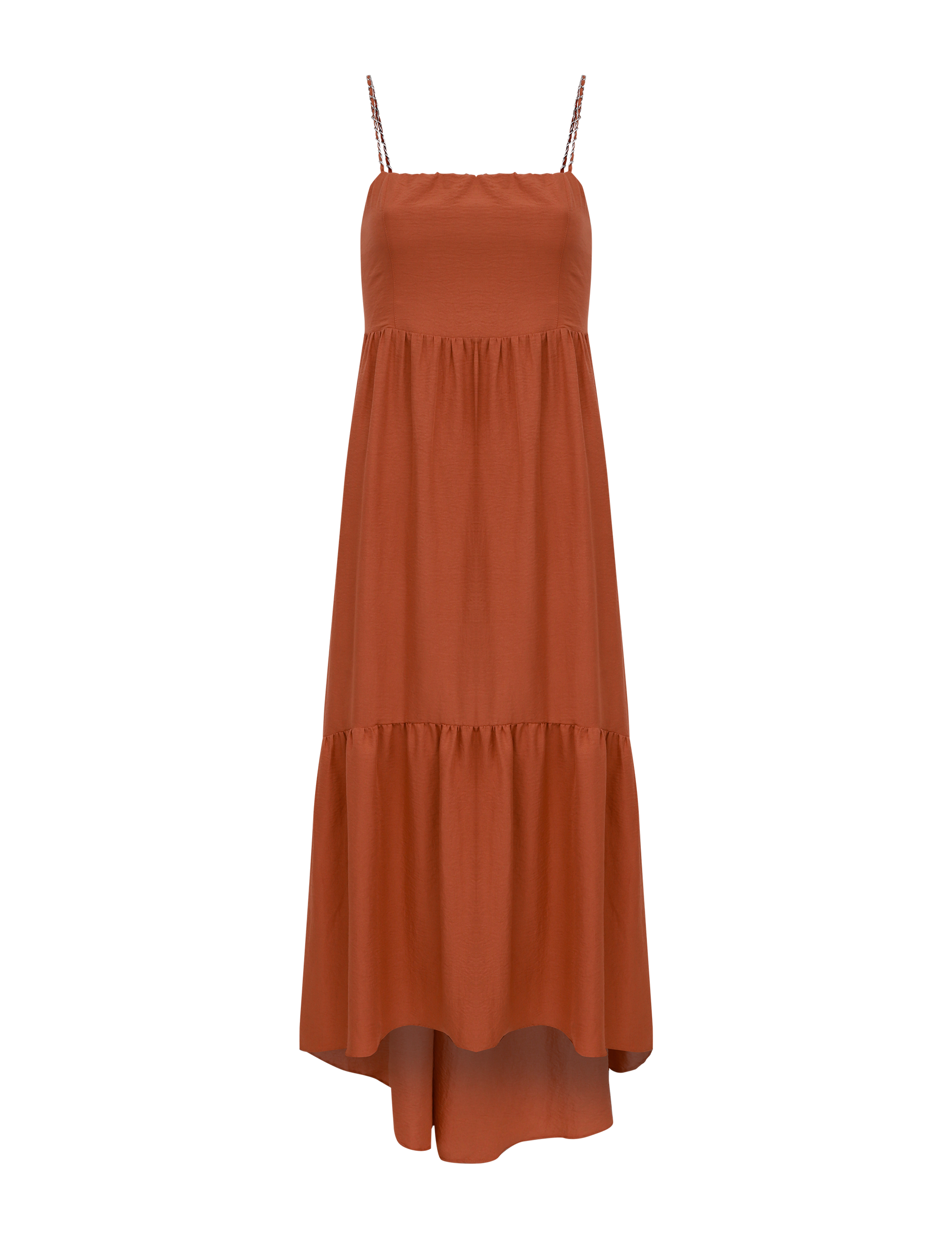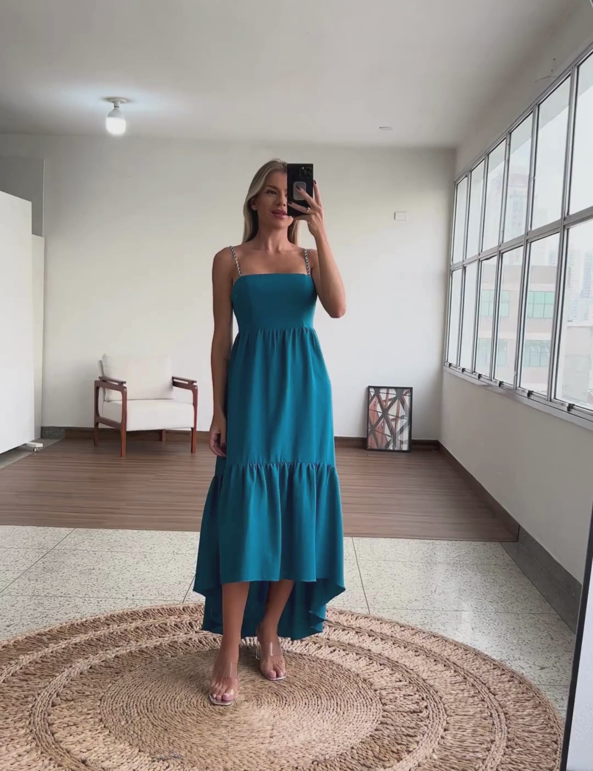 Vestido longo mullet com forro, confeccionado em poliéster com aspecto de liocel e efeito amassadinho. Possui decote reto com elástico interno, alcinhas reguláveis com aplicação de correntinha de metal, lastex franzido nas costas para melhor ajuste ao corpo, modelagem império com marcação franzidinha logo abaixo do busto e saia solta com recorte franzido na barra. O tecido garante praticidade e elegância, pois, devido à sua composição, não amassa facilmente e o aspecto de 'tecido nobre' dá um ar sofisticado ao look.