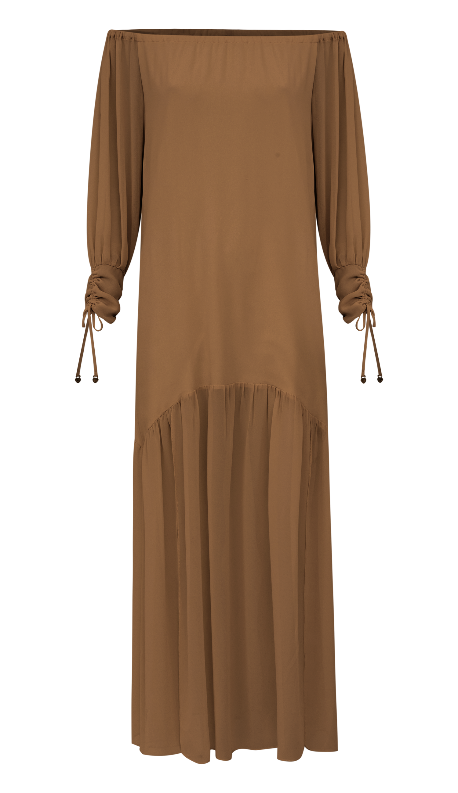 Vestido longo confeccionado em crepe leve com forro até o recorte do quadril. Possui decote ciganinha com elástico franzido no ombro, mangas longas bufantes, punhos larguinhos com tirinha embutida para franzir e amarrar que tem ponteiras de metal em formato de conchinha e recorte franzidinho assimétrico na altura do quadril seguido de saia soltinha sem forro nela, o que cria uma aparência levemente transparente bem charmosa.