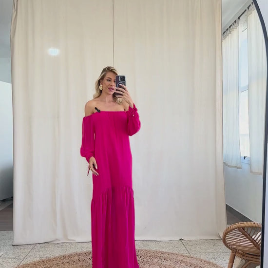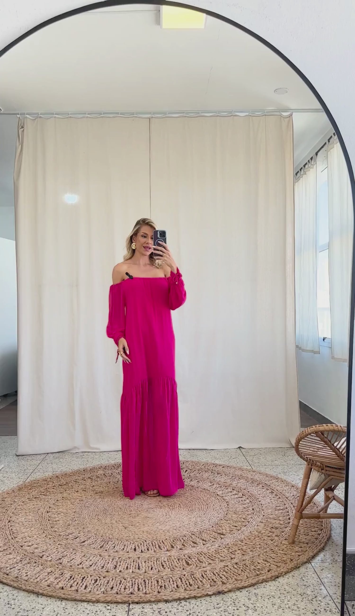 Vestido longo confeccionado em crepe leve com forro até o recorte do quadril. Possui decote ciganinha com elástico franzido no ombro, mangas longas bufantes, punhos larguinhos com tirinha embutida para franzir e amarrar que tem ponteiras de metal em formato de conchinha e recorte franzidinho assimétrico na altura do quadril seguido de saia soltinha sem forro nela, o que cria uma aparência levemente transparente bem charmosa.