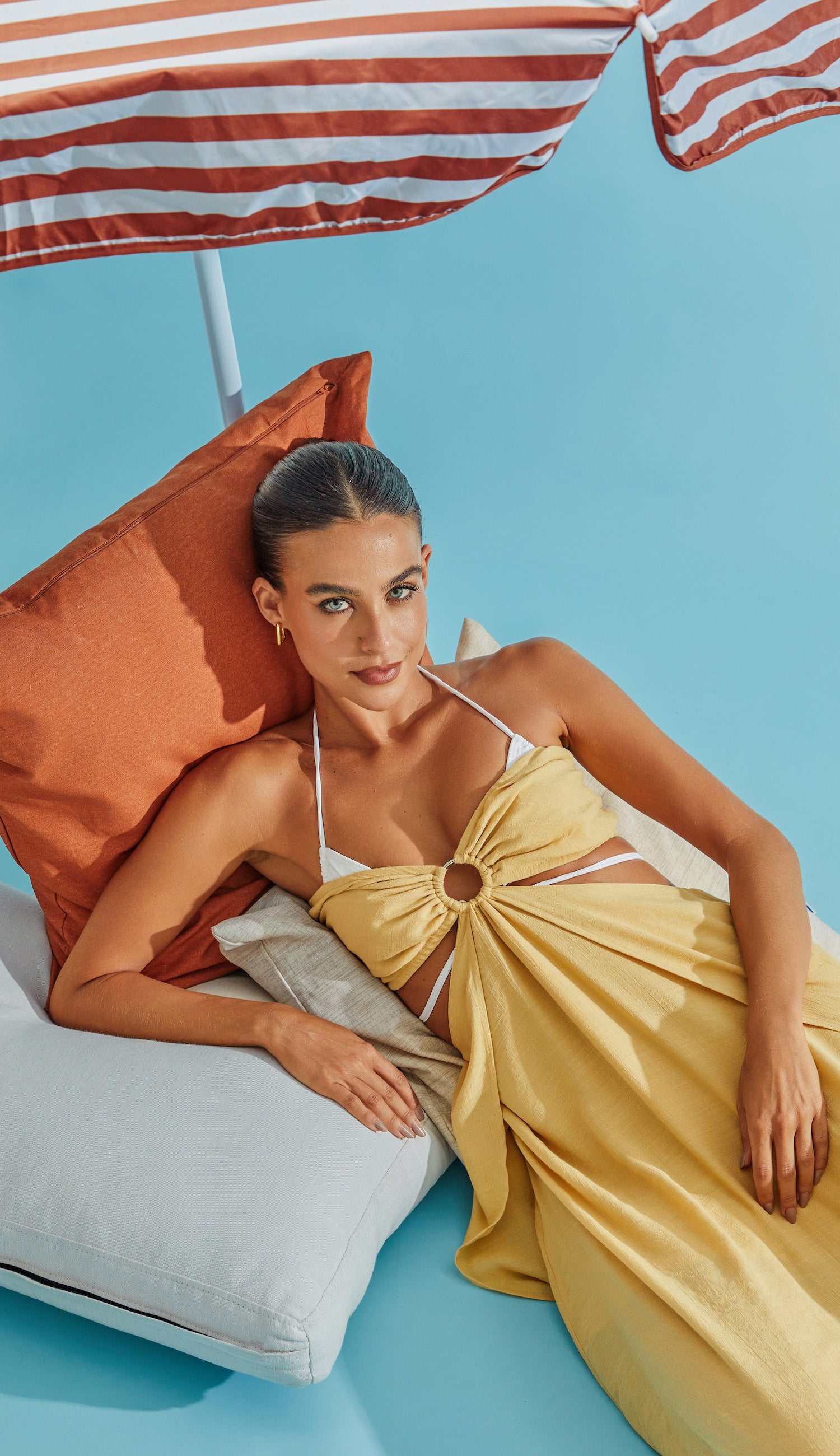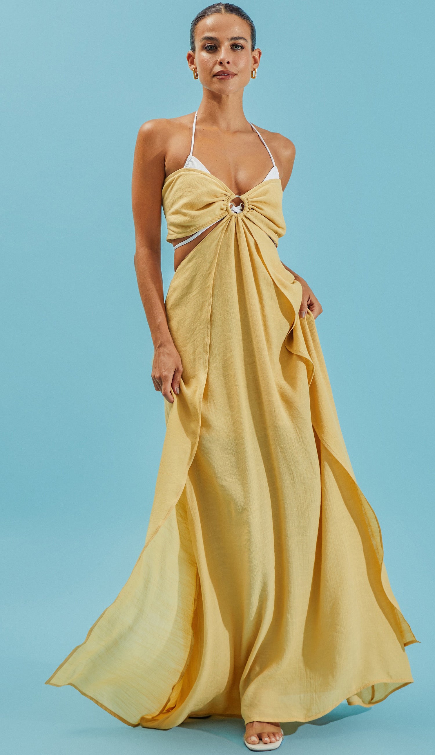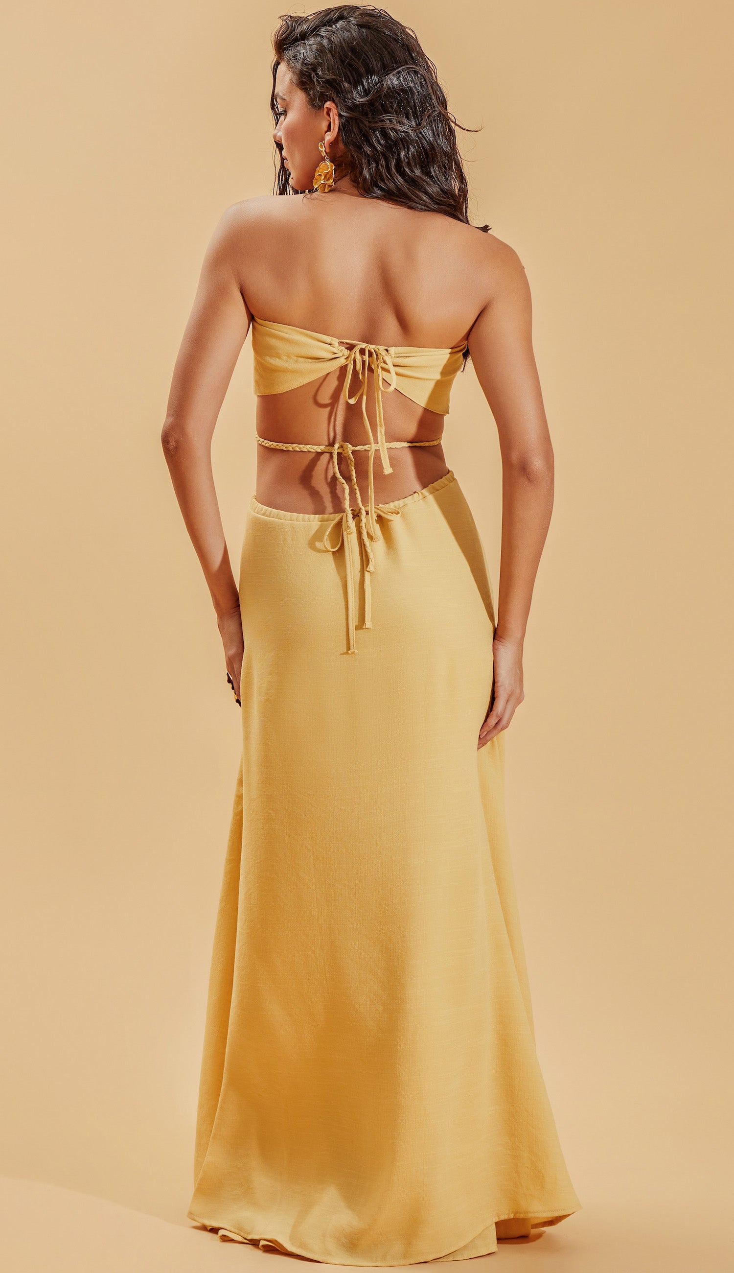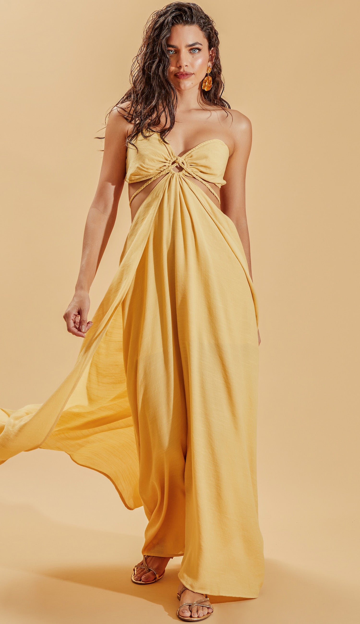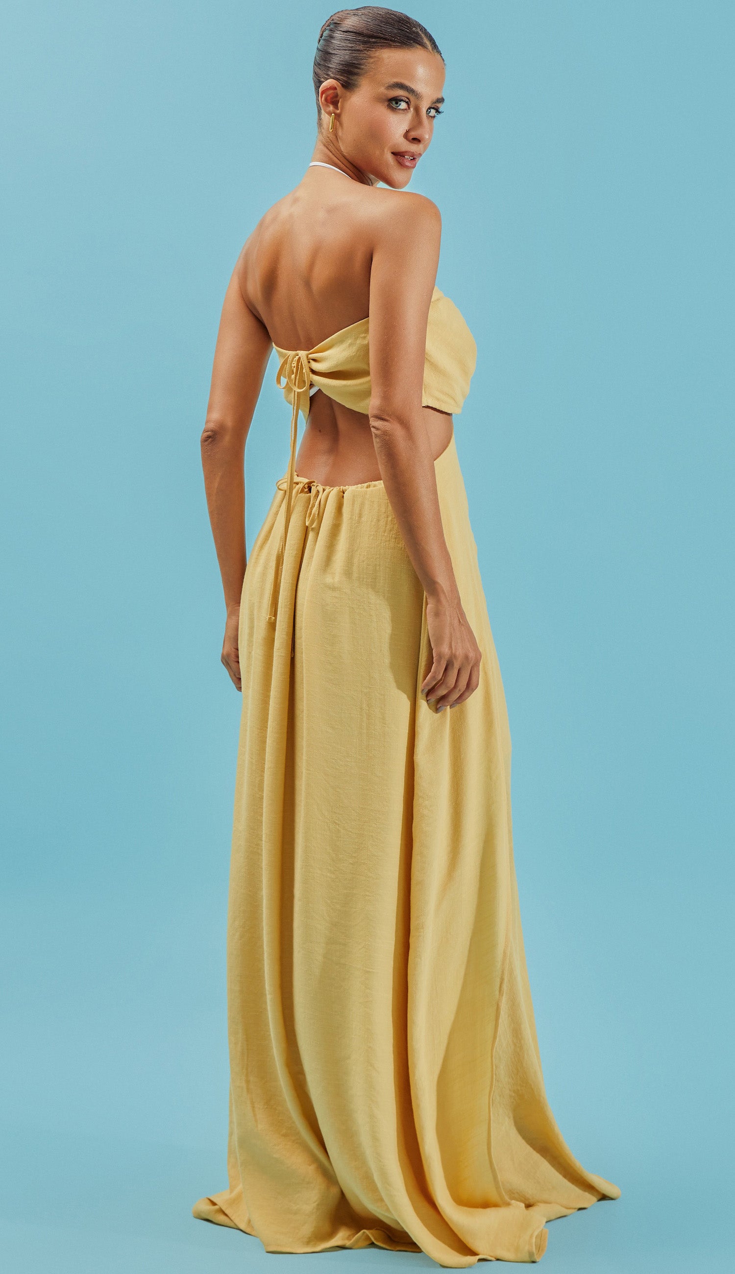 Vestido longo com forro; confeccionado em poliviscose texturizado com aspecto de linho e efeito amassadinho. A modelagem é frente única com a parte busto fixo à saia apenas na frente, deixando toda a região da cintura à mostra; fechamento do busto nas costas por tirinhas para ajuste e amarração; decote coração com argola no centro de onde saem tirinhas trançadas para amarrar no pescoço e elástico interno para melhor ajuste ao corpo. A saia possui tirinha embutida nas costas para ajuste e amarração e sobreposição de tecido em camada na frente, que dá um lindo movimento à peça.