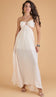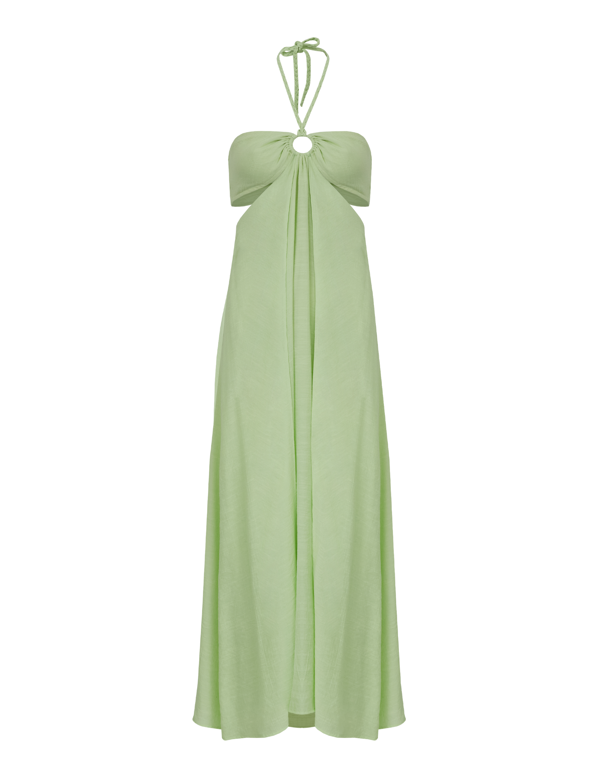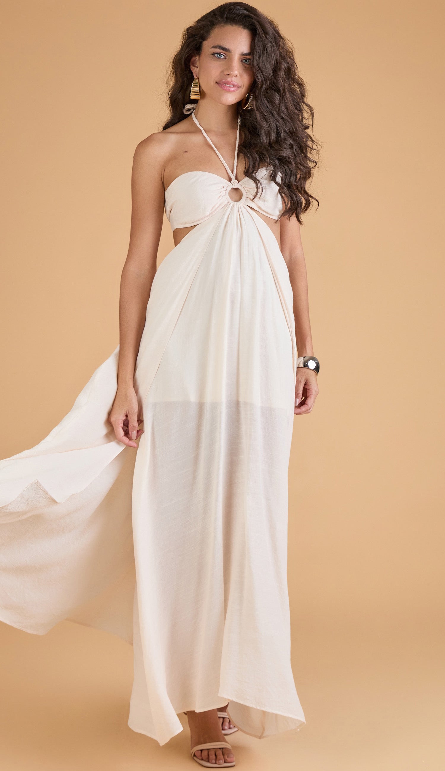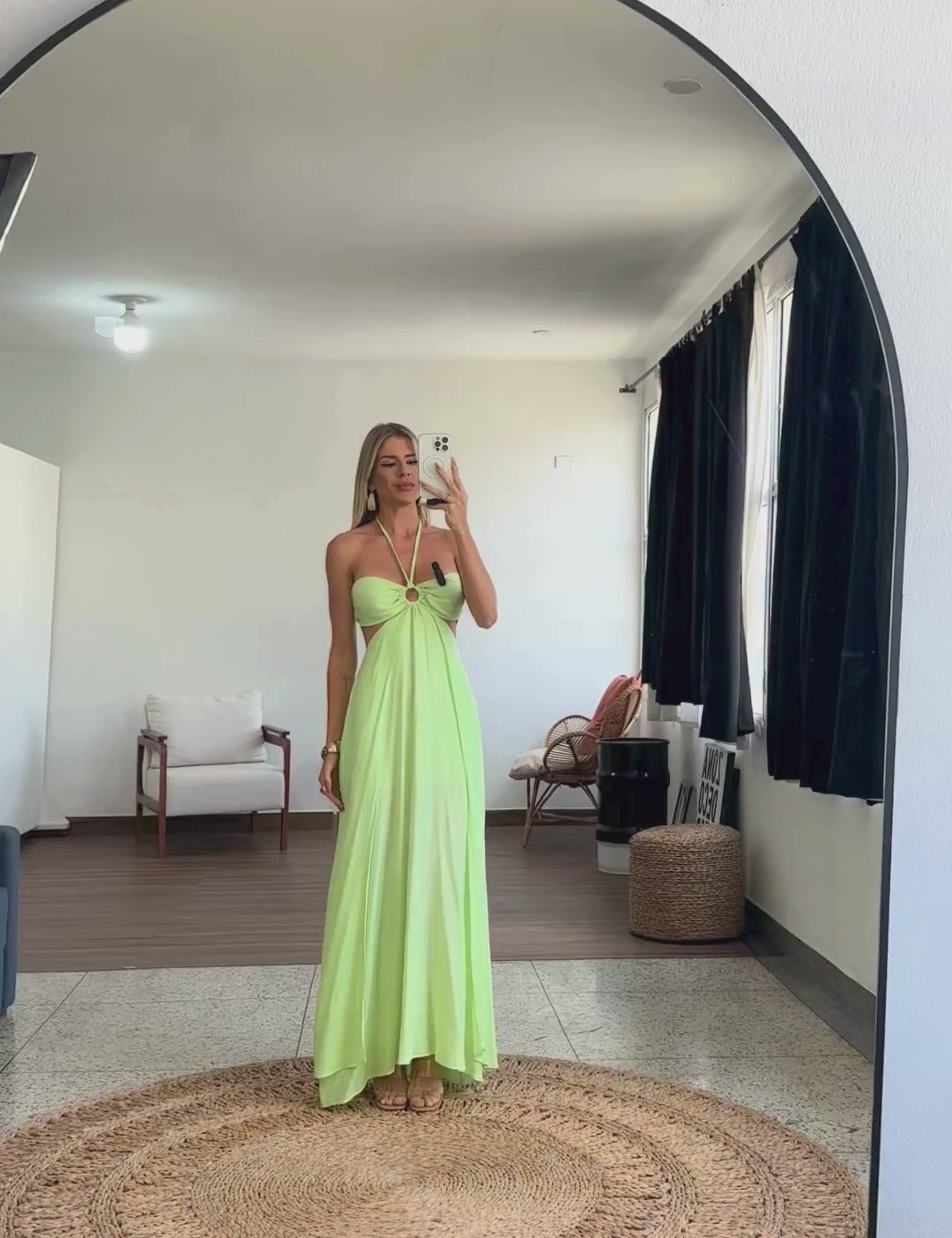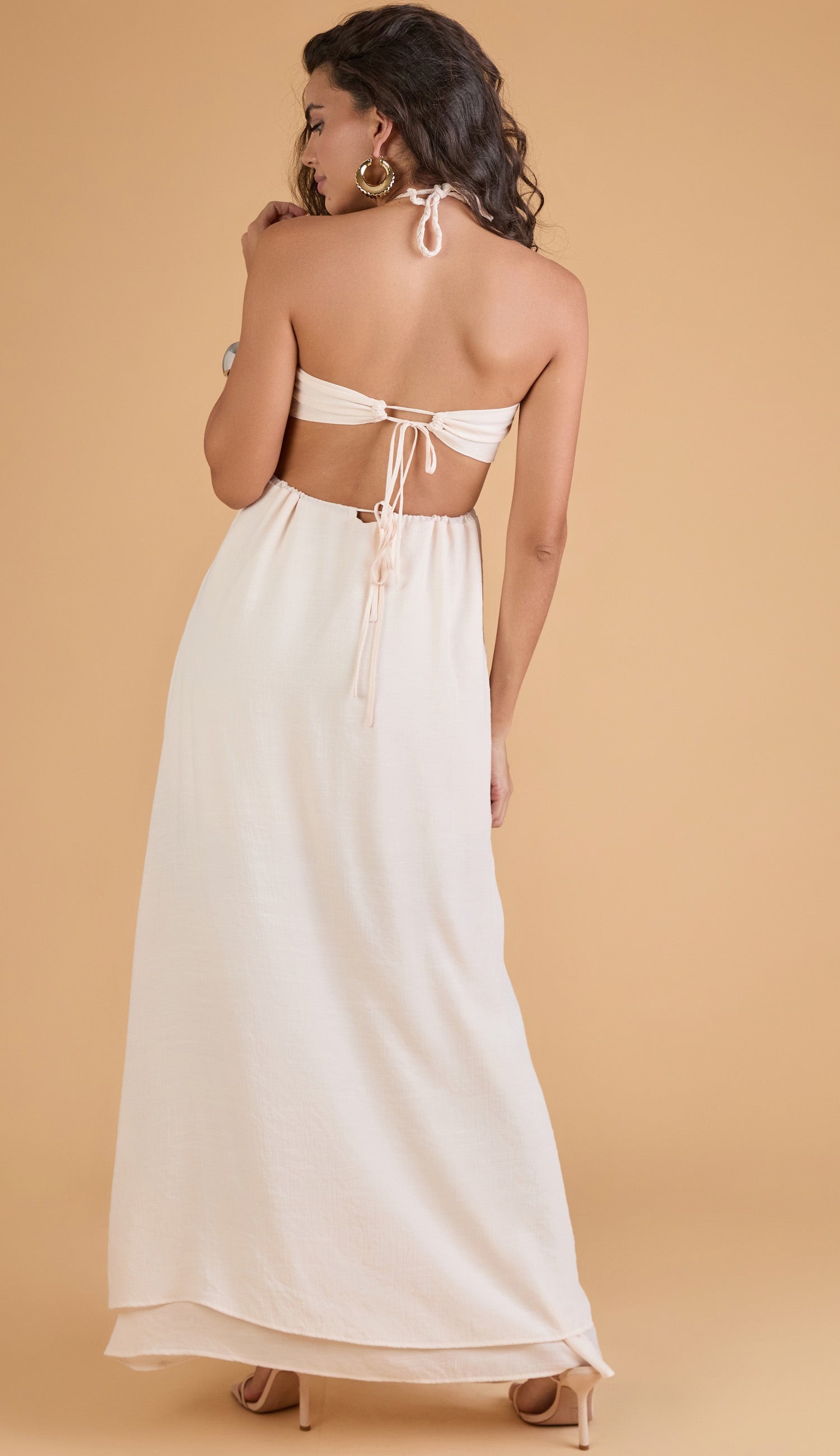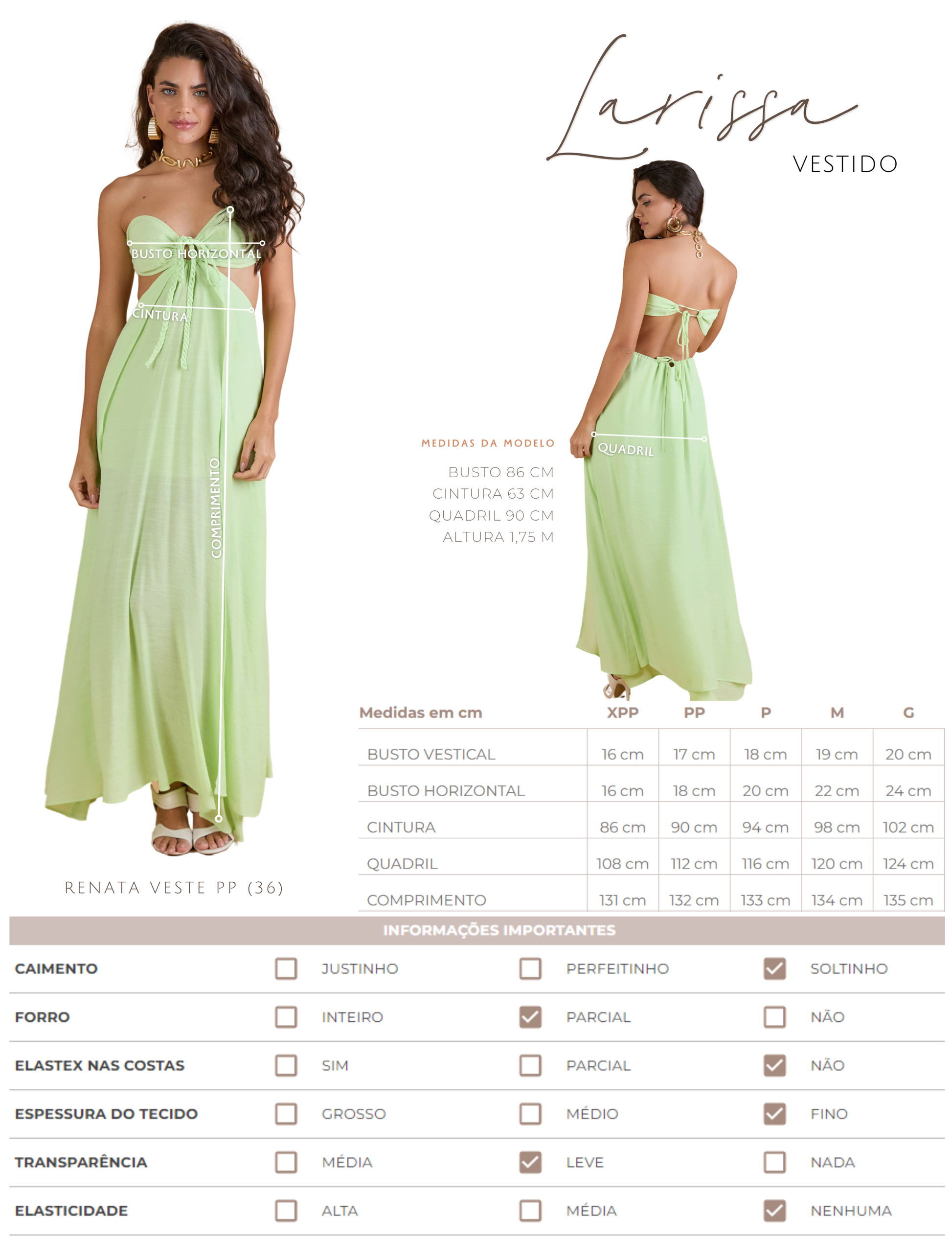 Vestido longo com forro; confeccionado em poliviscose texturizado com aspecto de linho e efeito amassadinho. A modelagem é frente única com a parte busto fixo à saia apenas na frente, deixando toda a região da cintura à mostra; fechamento do busto nas costas por tirinhas para ajuste e amarração; decote coração com argola no centro de onde saem tirinhas trançadas para amarrar no pescoço e elástico interno para melhor ajuste ao corpo. A saia possui tirinha embutida nas costas para ajuste e amarração e sobreposição de tecido em camada na frente, que dá um lindo movimento à peça.