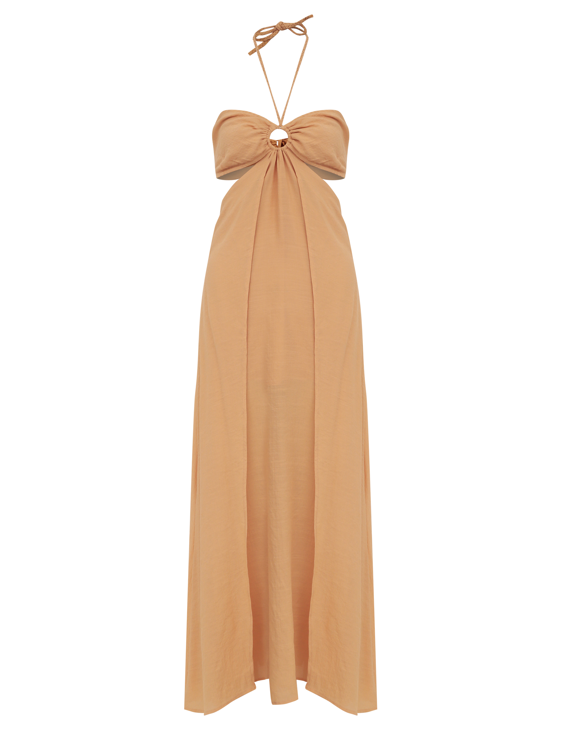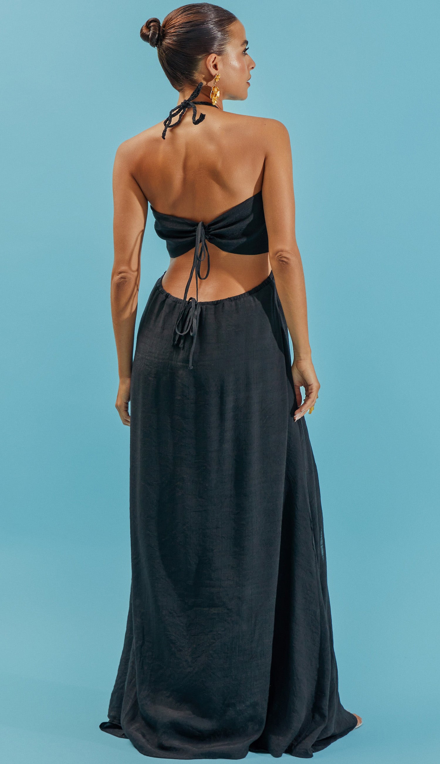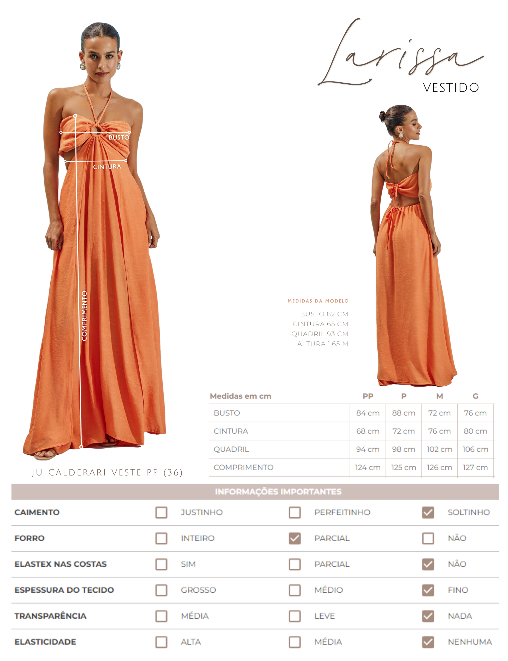 Vestido longo com forro; confeccionado em poliviscose texturizado com aspecto de linho e efeito amassadinho. A modelagem é frente única com a parte busto fixo à saia apenas na frente, deixando toda a região da cintura à mostra; fechamento do busto nas costas por tirinhas para ajuste e amarração; decote coração com argola no centro de onde saem tirinhas trançadas para amarrar no pescoço e elástico interno para melhor ajuste ao corpo. A saia possui tirinha embutida nas costas para ajuste e amarração e sobreposição de tecido em camada na frente, que dá um lindo movimento à peça.