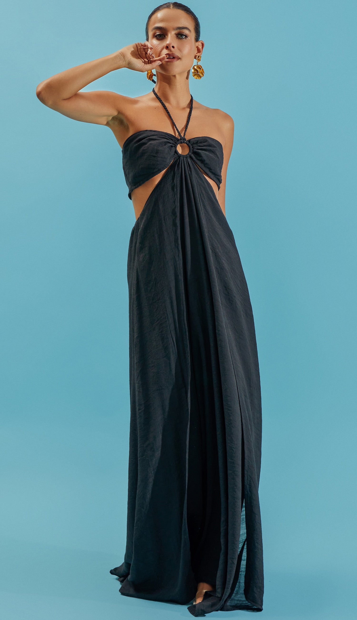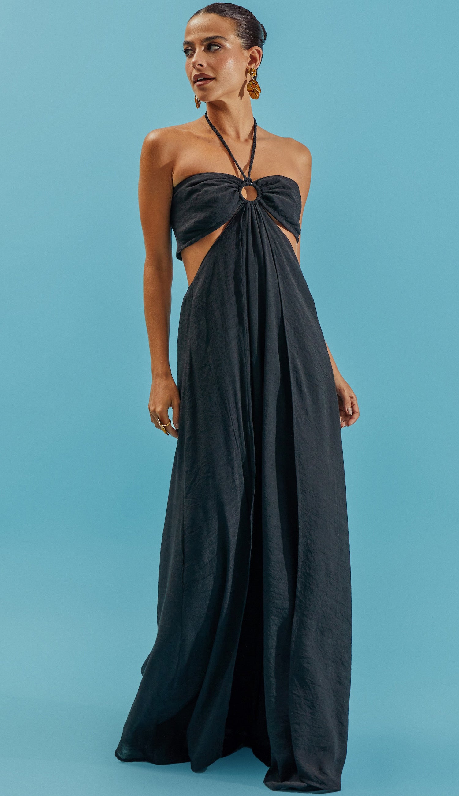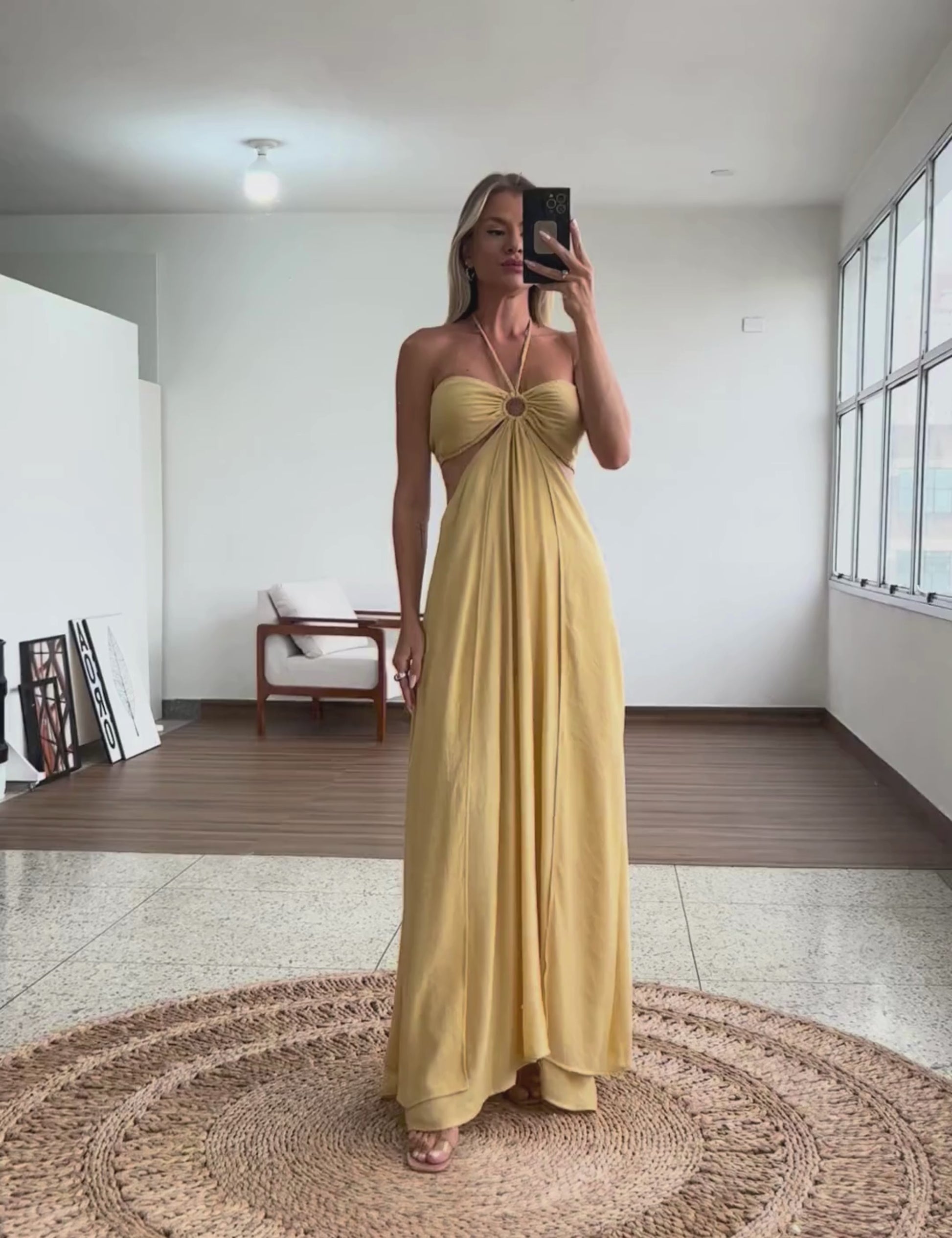 Vestido longo com forro; confeccionado em poliviscose texturizado com aspecto de linho e efeito amassadinho. A modelagem é frente única com a parte busto fixo à saia apenas na frente, deixando toda a região da cintura à mostra; fechamento do busto nas costas por tirinhas para ajuste e amarração; decote coração com argola no centro de onde saem tirinhas trançadas para amarrar no pescoço e elástico interno para melhor ajuste ao corpo. A saia possui tirinha embutida nas costas para ajuste e amarração e sobreposição de tecido em camada na frente, que dá um lindo movimento à peça.