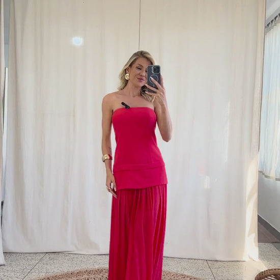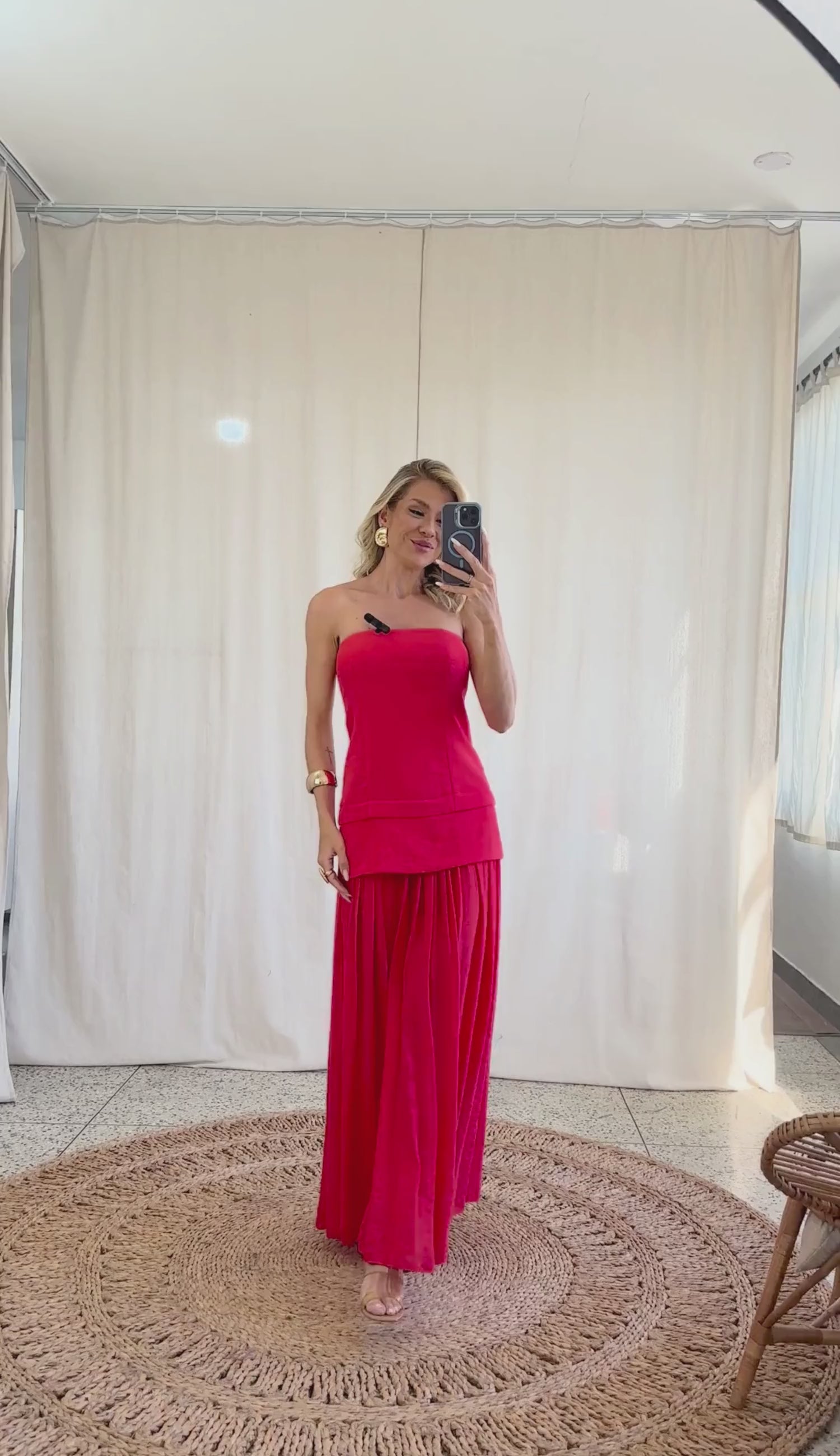 Vestido longo sem mangas e com forro; confeccionado em poliviscose texturizada com aspecto de linho e efeito amassadinho. Possui decote reto com silicone elástico interno para maior segurança, recortes no corpo da peça que modelam a silhueta, sendo bem justinho até a altura do quadril onde conta com recorte e duas palas sobrepostas sendo a última mais larga. Logo abaixo, tem uma saia franzidinha bem soltinha e fluida que dá um frescor ao look e nas costas, possui o fechamento por zíper invisível.