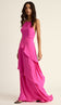 Vestido longo confeccionado em crepe leve com forro. Possui modelagem frente única com decote halter e costas nuas, tirinha para amarrar no pescoço com ponteiras de metal em formato de conchinhas, pala na cintura, fechamento traseiro por zíper de metal com conchinha da laguna gravada no pingente e babados diagonais em 3 camadas ao longo da saia, que é evasê.