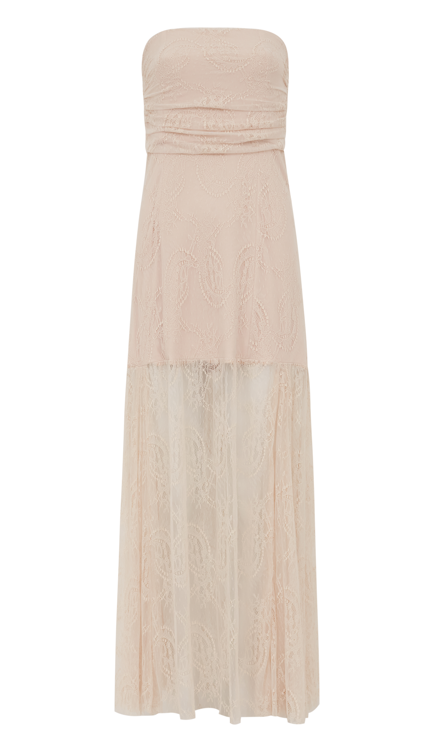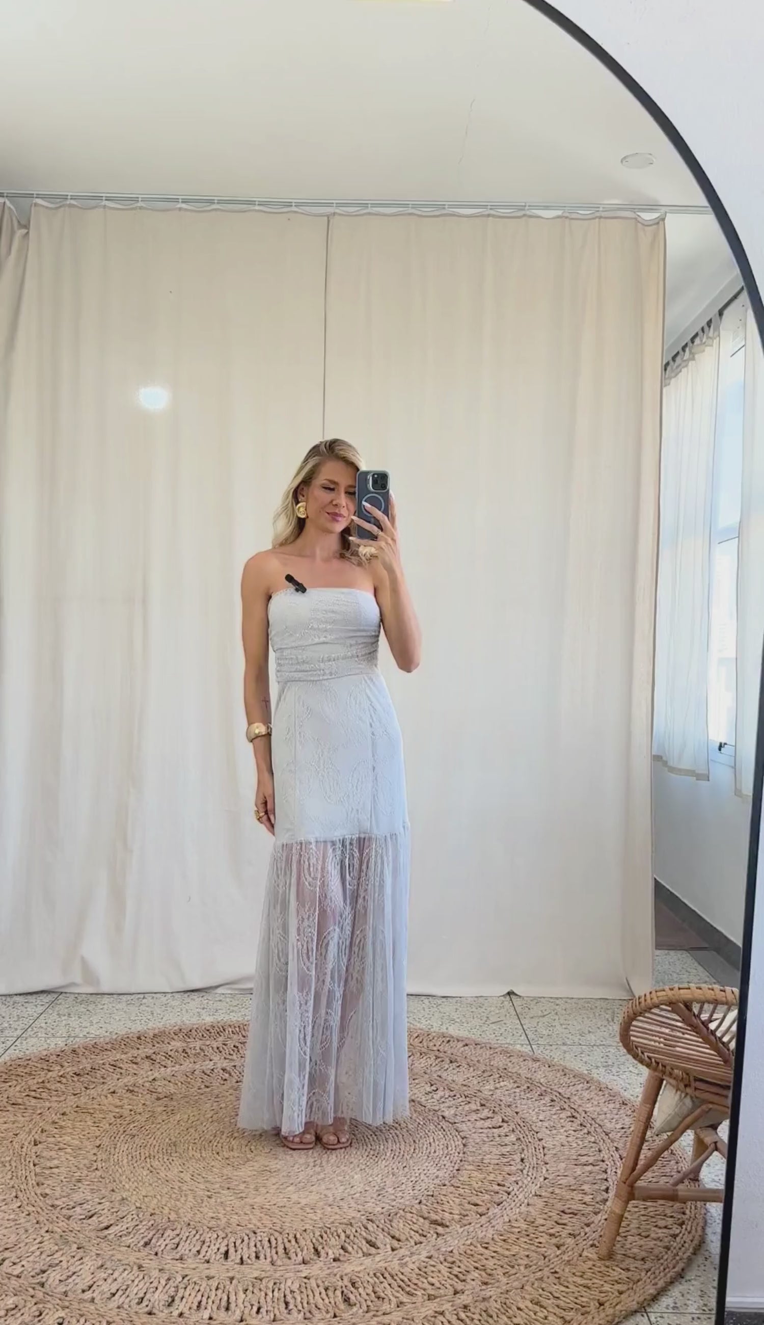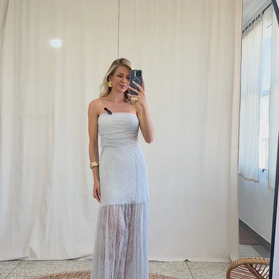 Vestido longo sem mangas confeccionado em renda com forro. Possui decote reto com silicone elástico interno para maior segurança, franzidos nas laterais, dando um charmoso efeito drapeado em todo o busto, elástico interno fino nas costas para melhor ajuste ao corpo, fechamento lateral por zíper invisível, recorte na cintura e modelagem ajustada até o quadril, onde termina o forro e dá lugar a uma saia leve apenas em renda, criando uma transparência romântica e delicada.