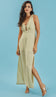 Vestido longo com forro na saia, confeccionado em crepe texturizado mais encorpadinho com aspecto de linho. Possui decote em V profundo na frente com recorte vazado no centro do busto e franzidinhos, pala na cintura logo abaixo, alças largas cruzadas nas costas em um lindo decote, fendas laterais na saia e fechamento lateral por zíper de metal.