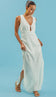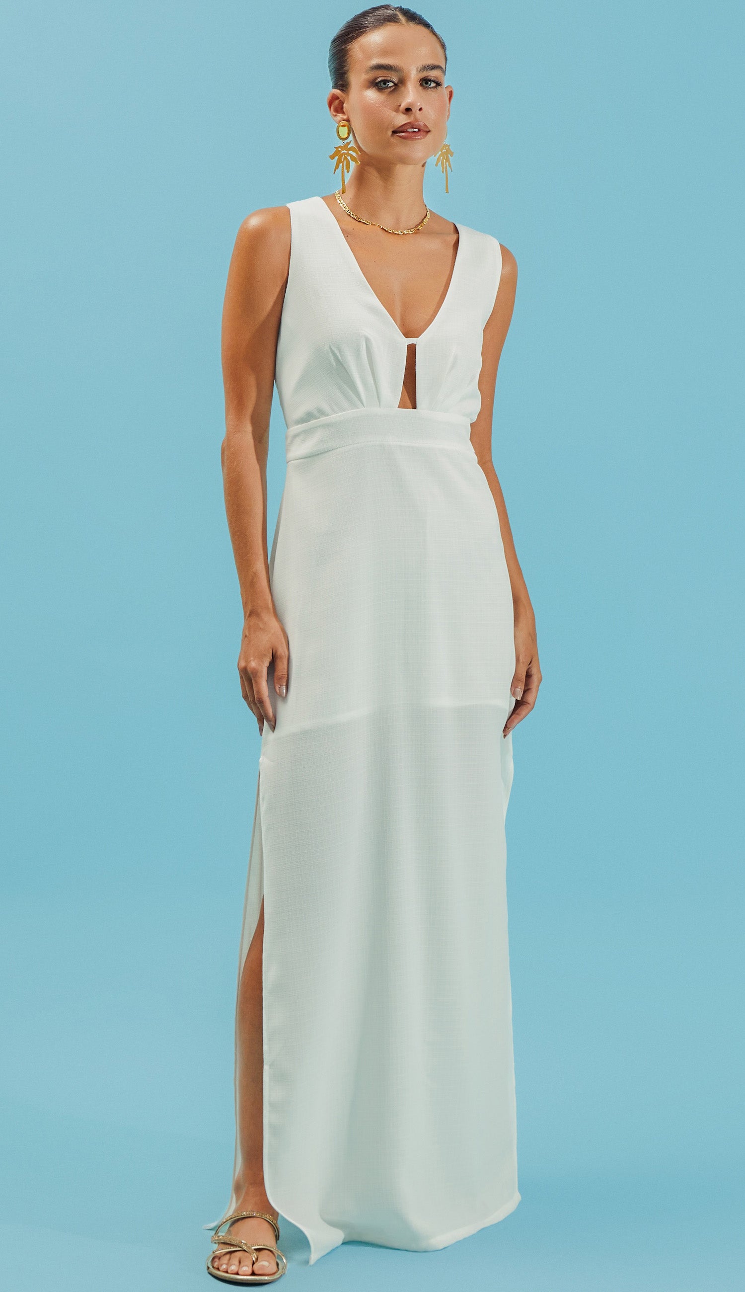 Vestido longo com forro na saia, confeccionado em crepe texturizado mais encorpadinho com aspecto de linho. Possui decote em V profundo na frente com recorte vazado no centro do busto e franzidinhos, pala na cintura logo abaixo, alças largas cruzadas nas costas em um lindo decote, fendas laterais na saia e fechamento lateral por zíper de metal.