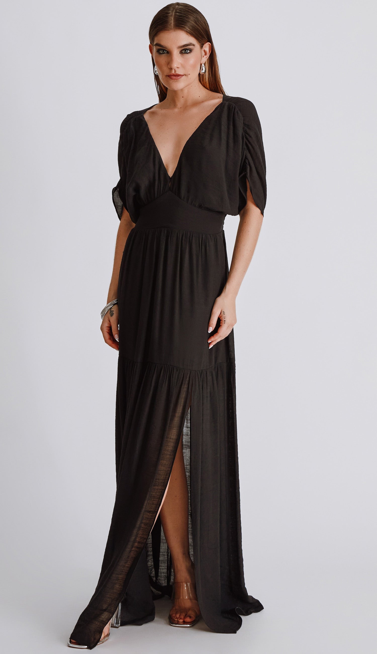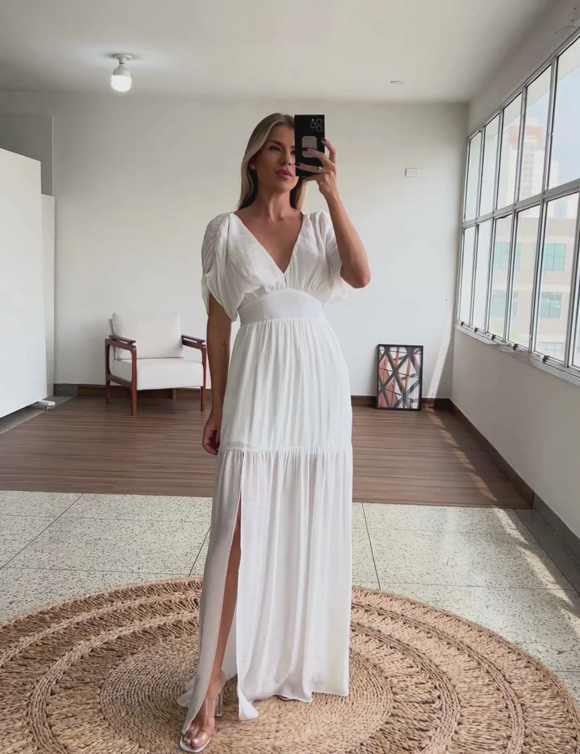 Vestido longo com forro na saia, confeccionado em poliviscose com aparência de linho e efeito amassadinho. Possui decote em V com tecido duplo no busto para não ficar transparente, pala com franzidos na cintura, mangas curtas com detalhe franzido nos ombros, saia com recorte franzido de onde sai uma fenda lateral super charmosa, fechamento traseiro por botão esmaltado na nuca, abertura logo abaixo e lastex franzido na cintura costas, para garantir maior conforto.