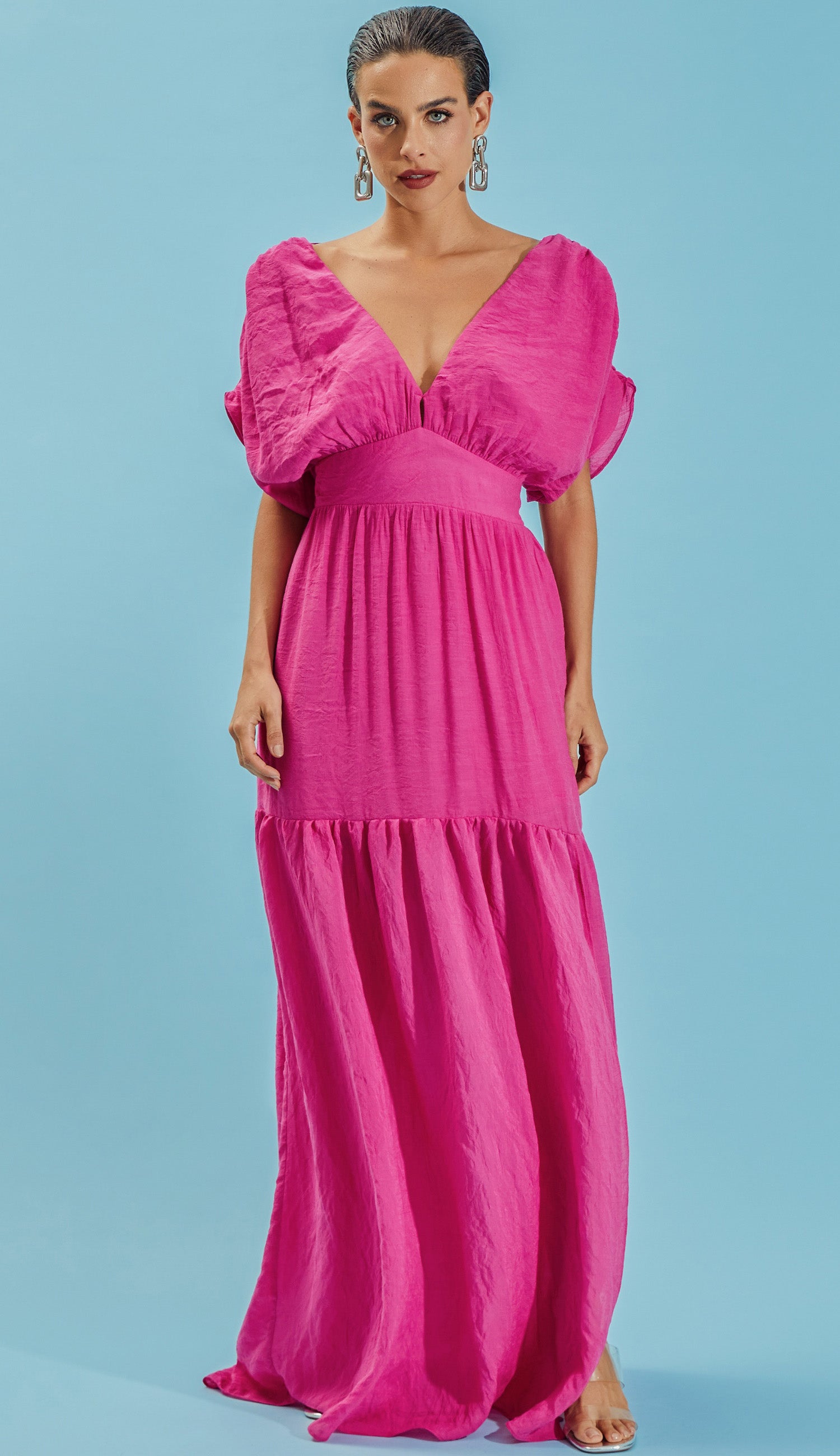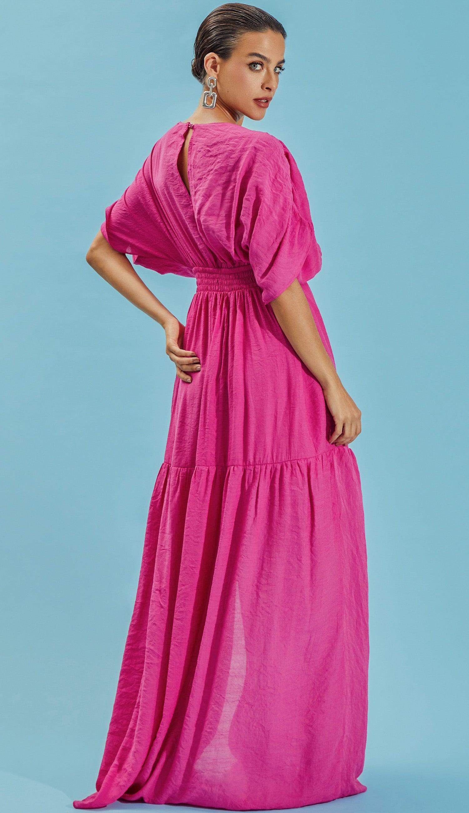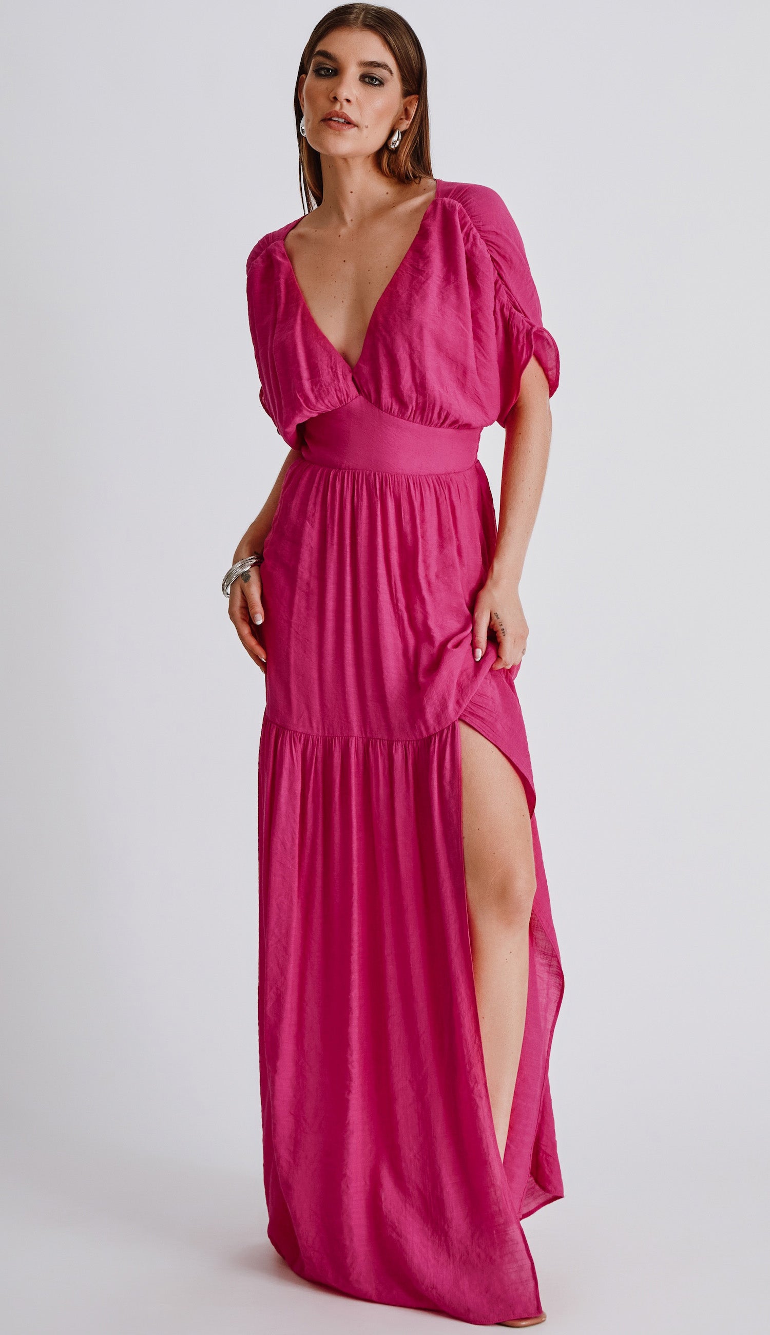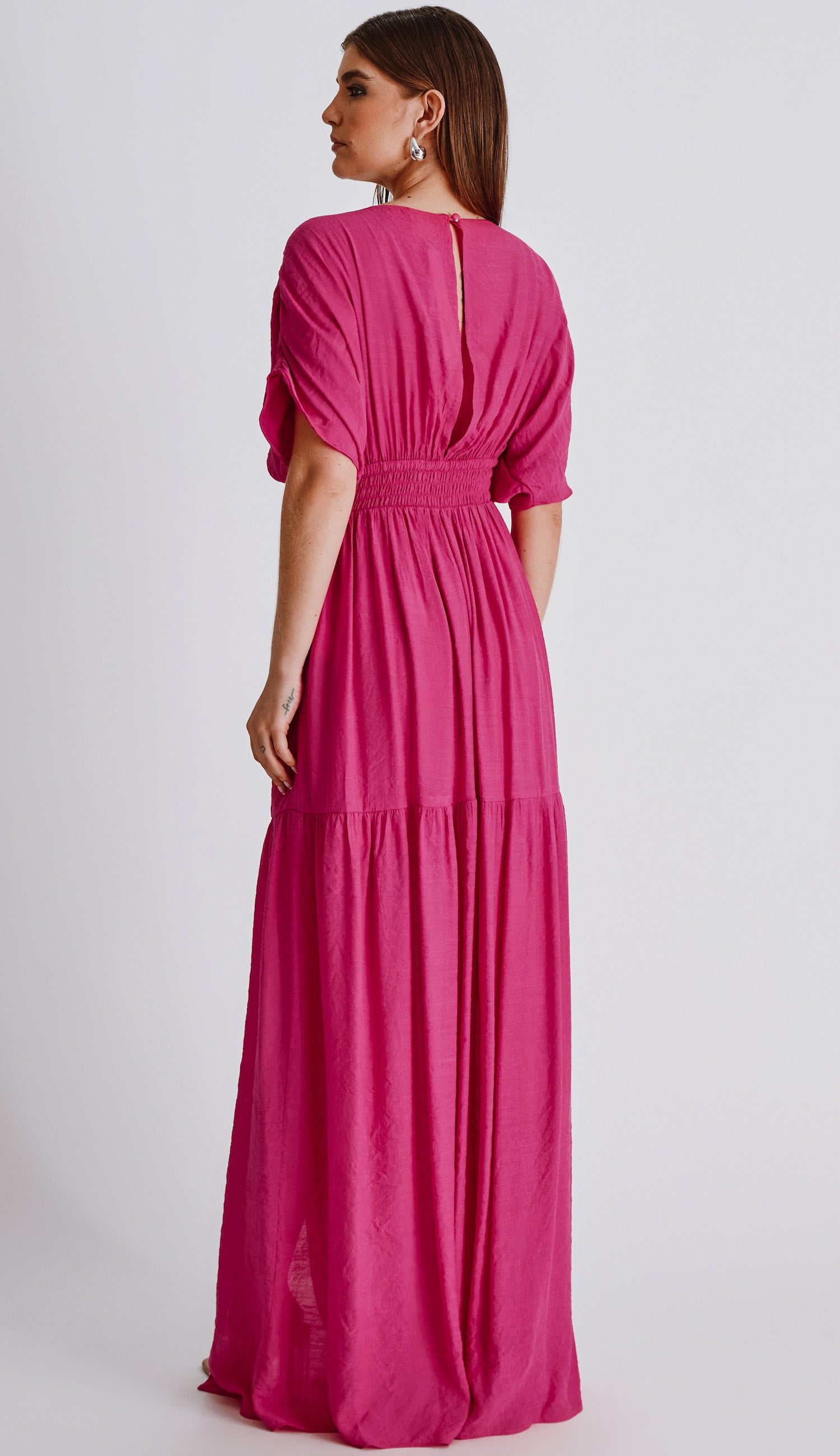 Vestido longo com forro na saia, confeccionado em poliviscose com aspecto de linho e efeito amassadinho. Possui decote em V com tecido duplo no busto para não ficar transparente, pala com franzidos na cintura, mangas morcego curtas com detalhe franzido nos ombros, saia com recorte franzido de onde sai uma fenda lateral super charmosa, fechamento traseiro por botão esmaltado na nuca, abertura logo abaixo e lastex franzido na cintura costas, para garantir maior conforto.