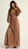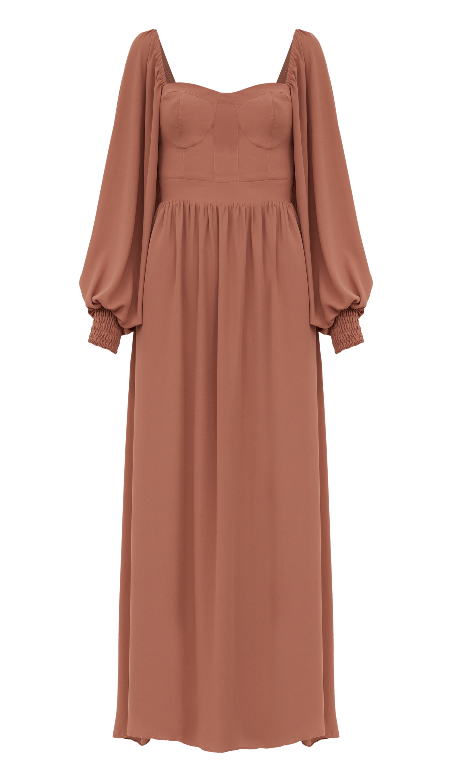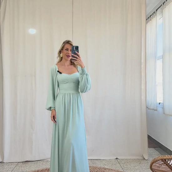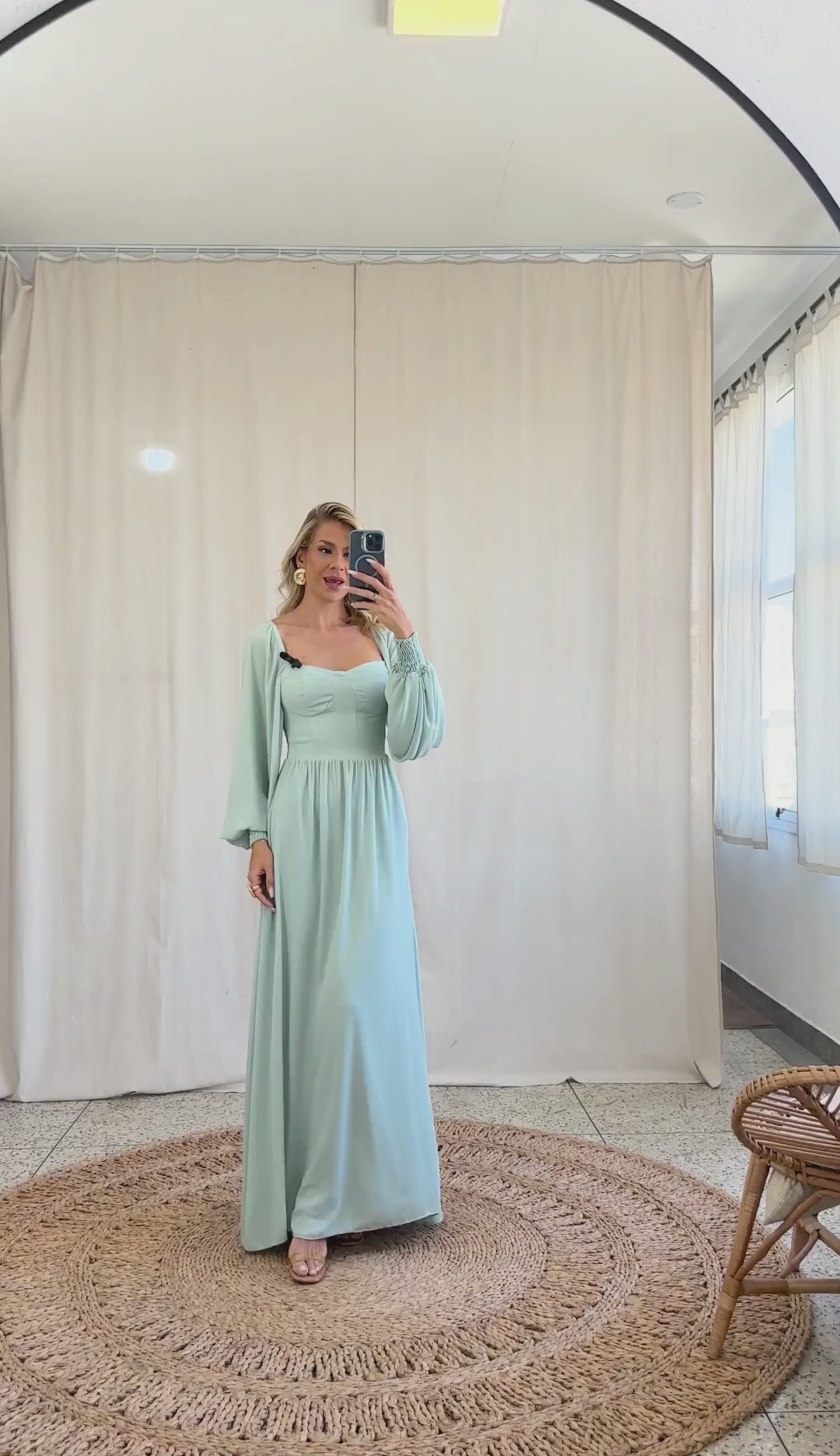 Vestido longo confeccionado em crepe leve com forro. Possui decote coração com pala e recortes que modelam o busto e o corpo; mangas longas bufantes com elástico franzido nos ombros que permite que seja usado no lugar ou abaixado no estilo ciganinha; lastex nos punhos para ajuste do comprimento; lastex também nas costas para melhor ajuste da peça ao corpo e franzidinho na cintura deixando a saia bem soltinha e a silhueta marcada. Uma peça linda e atemporal com estilo bem romântico.