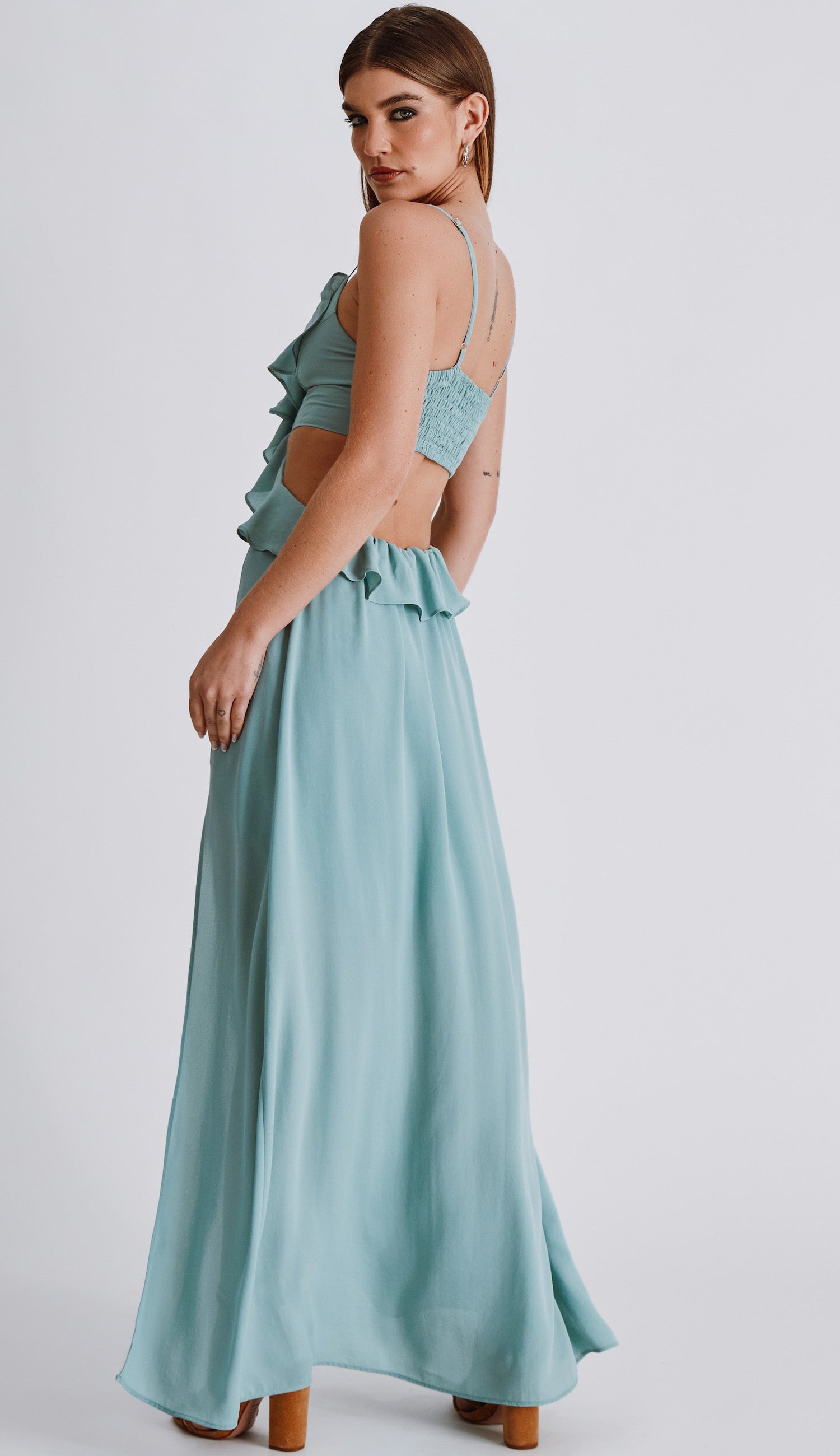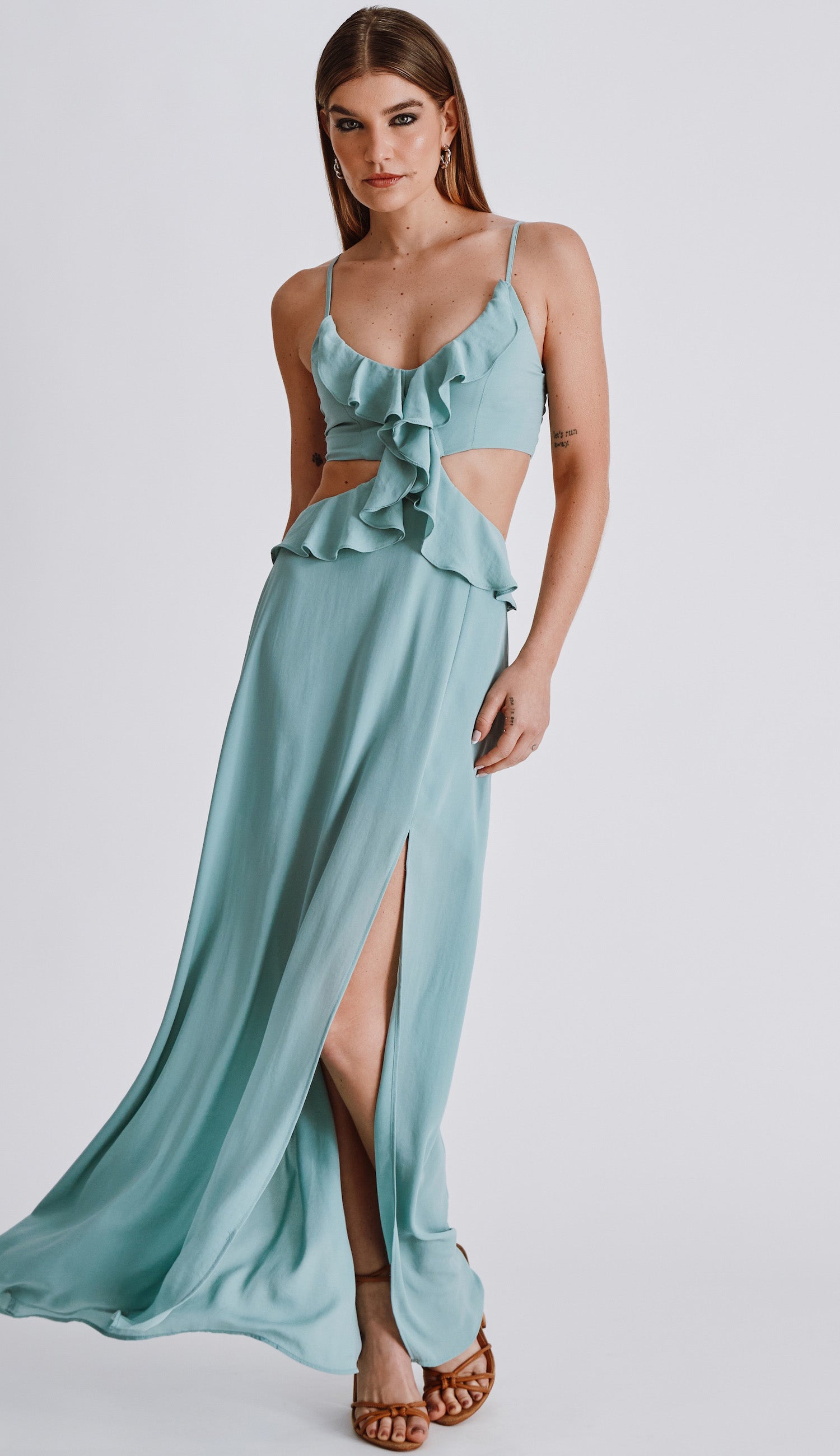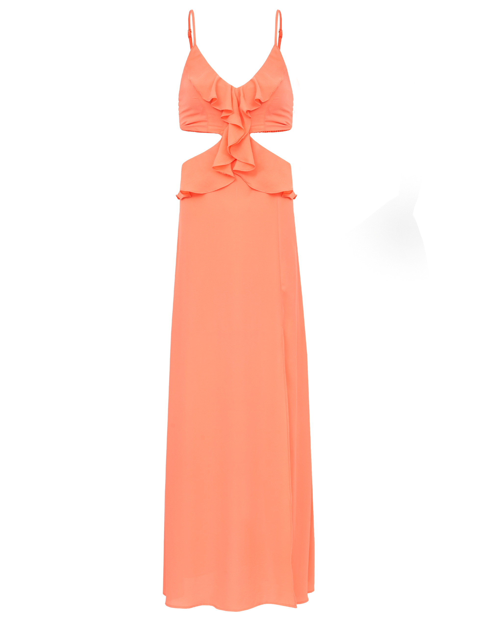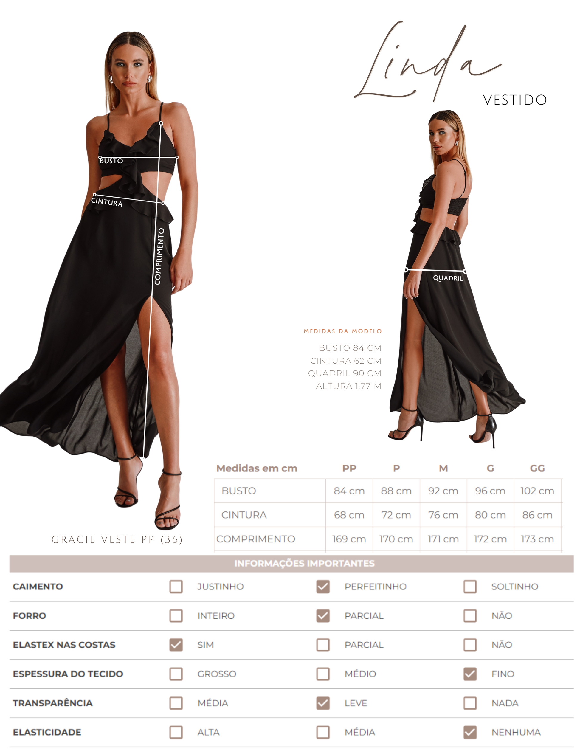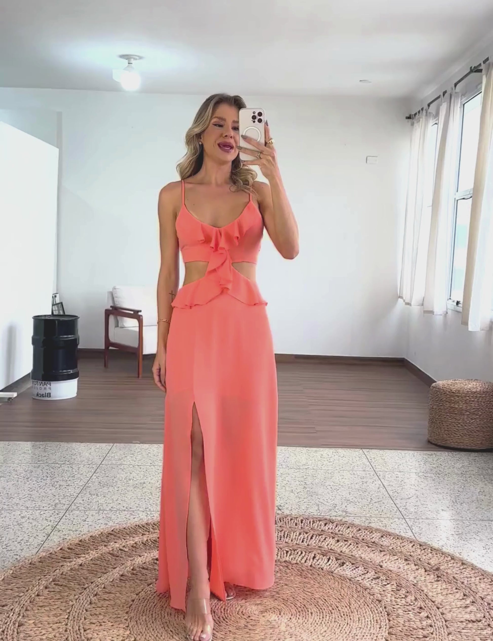 Vestido longo confeccionado em crepe leve com forro. Possui decote em V, alcinhas reguláveis, lastex franzido nas costas para maior conforto, busto fixo à saia apenas por recorte frontal, deixando toda a região da cintura à mostra, aplicação de babados no decote e em todo o recorte da cintura, elástico interno nas costas da saia para um melhor caimento e fenda lateral na saia.