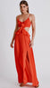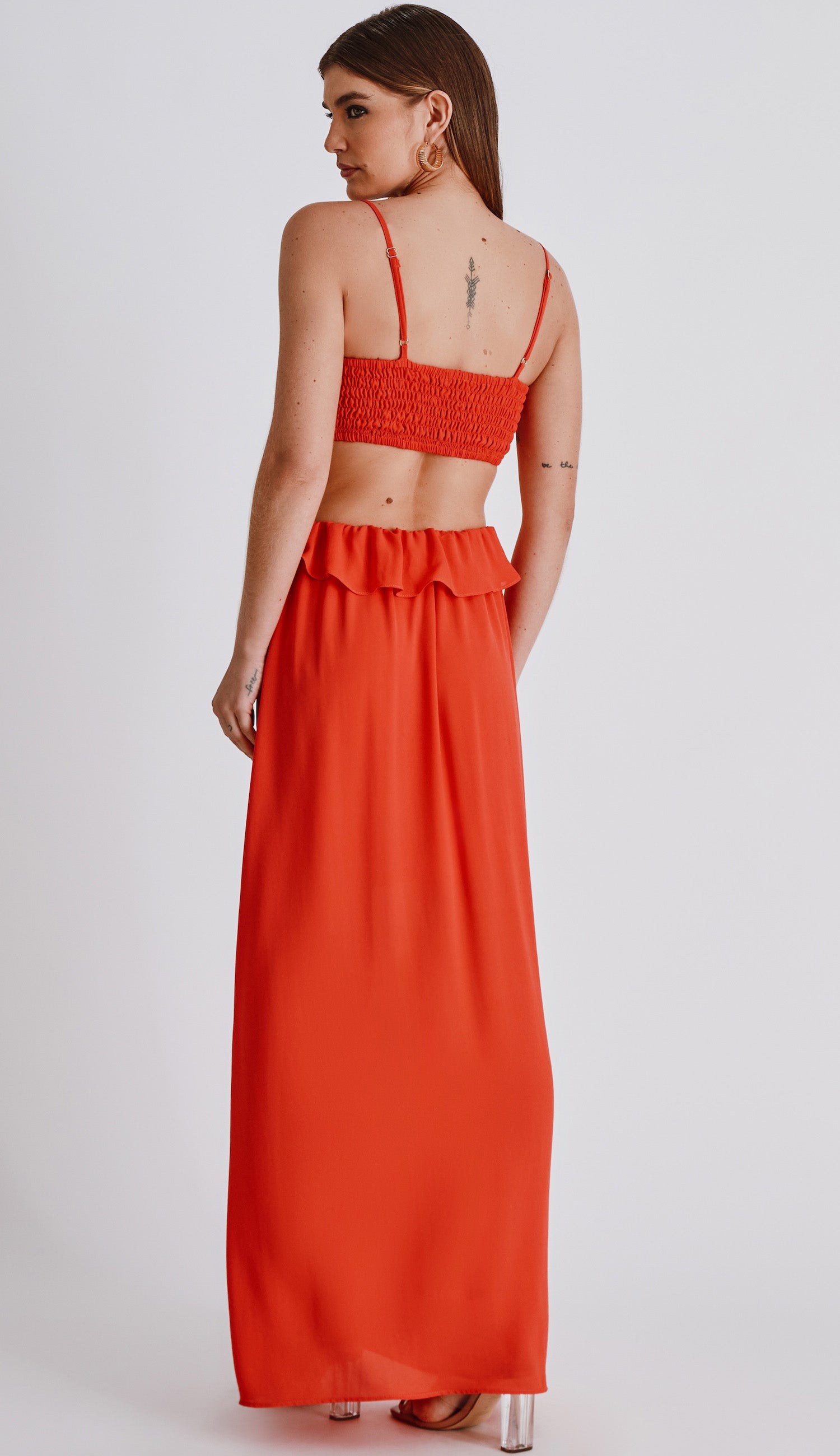 Vestido longo confeccionado em crepe leve com forro. Possui decote em V, alcinhas reguláveis, lastex franzido nas costas para maior conforto, busto fixo à saia apenas por recorte frontal, deixando toda a região da cintura à mostra, aplicação de babados no decote e em todo o recorte da cintura, elástico interno nas costas da saia para um melhor caimento e fenda lateral na saia.