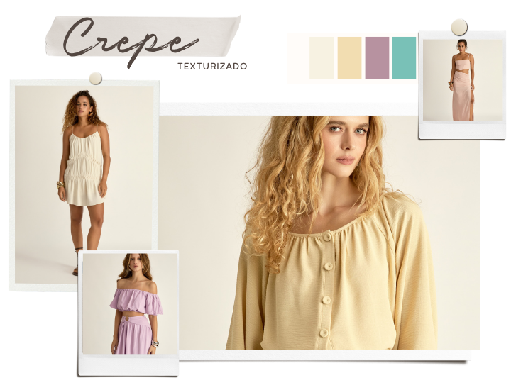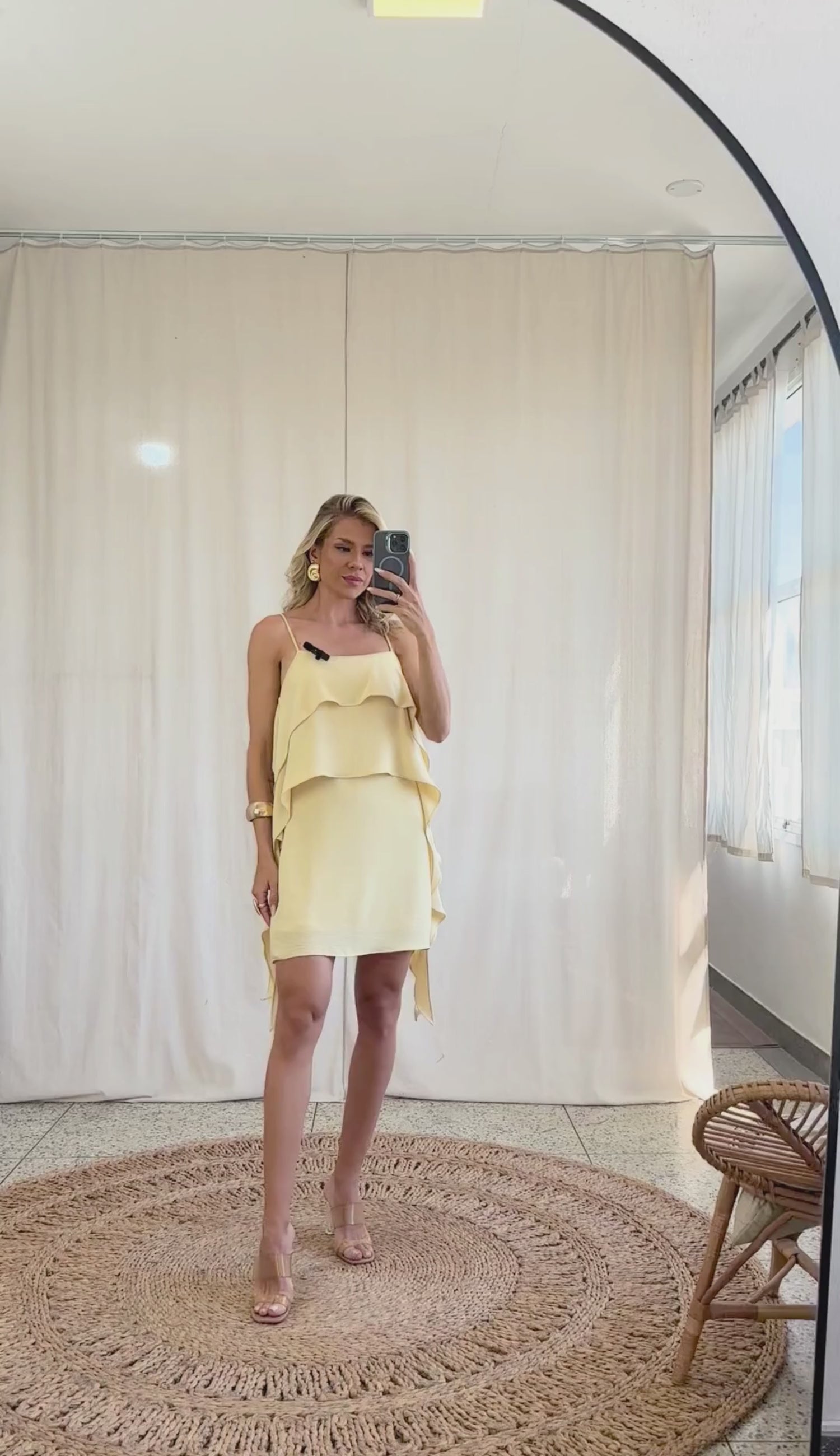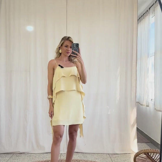 Vestido curto com forro, confeccionado em crepe texturizado mais encorpadinho com aspecto de gaze. Possui decote reto, alcinhas reguláveis, modelagem soltinha, sobreposição de camadas de babados no busto com recorte assimétrico nas laterais e fechamento lateral por zíper invisível.