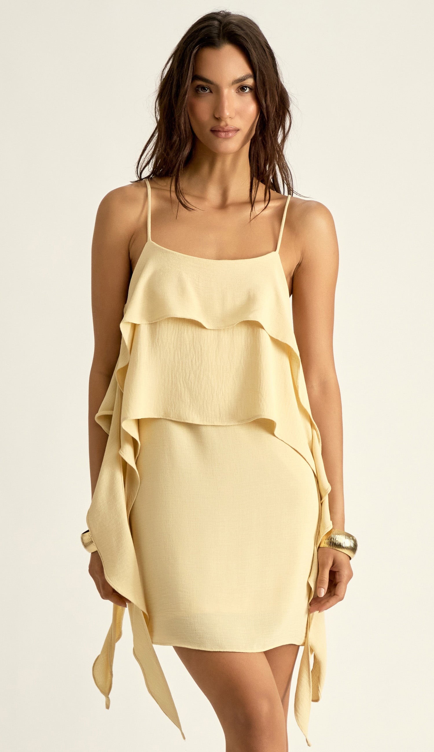 Vestido curto com forro, confeccionado em crepe texturizado mais encorpadinho com aspecto de gaze. Possui decote reto, alcinhas reguláveis, modelagem soltinha, sobreposição de camadas de babados no busto com recorte assimétrico nas laterais e fechamento lateral por zíper invisível.