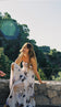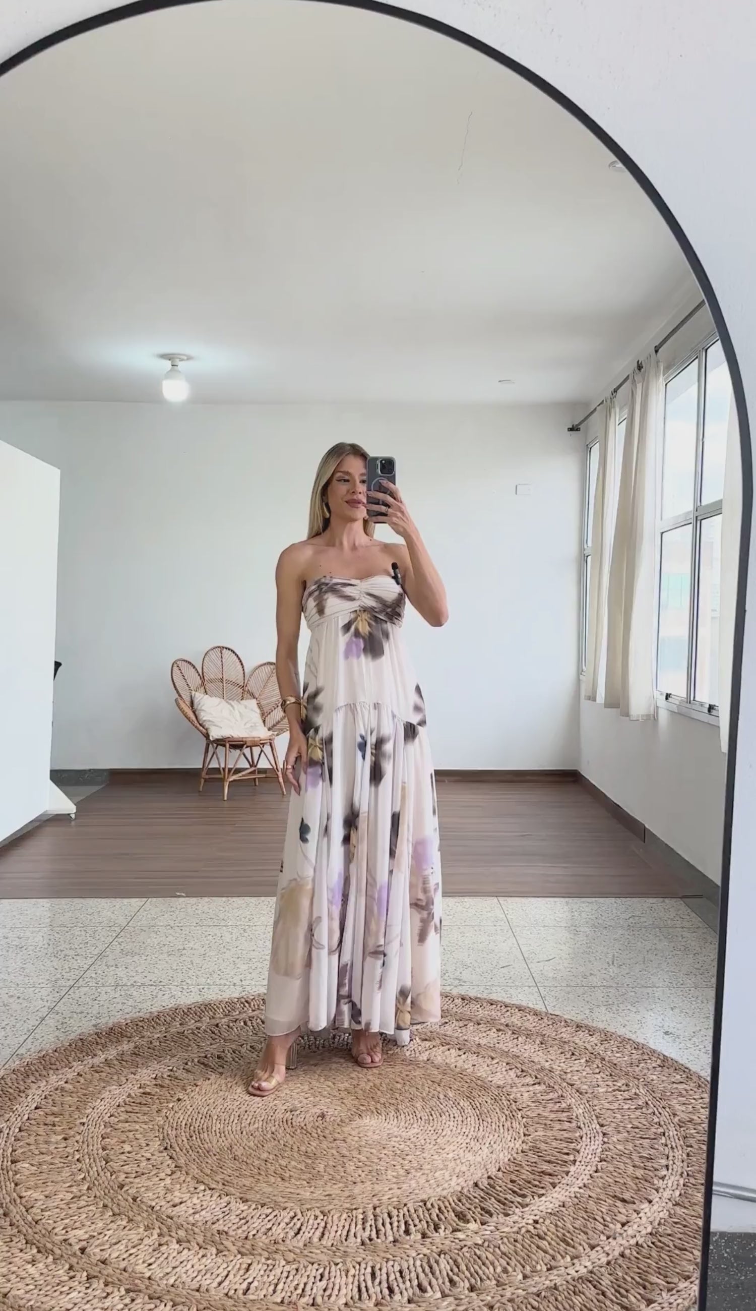 Vestido longo com forro, confeccionado em crepe leve com estampa exclusiva da Laguna em estilo aquarelado. Não possui mangas e conta com decote coração com franzido central, nervuras em todo o busto, que dá um volume sutil bem bonito na região; silicone elástico interno no busto para maior segurança, modelagem império com marcação logo abaixo do busto por elástico franzido em todo o toráx, recorte vazado nas costas com tira de elástico revestida para melhor ajuste ao corpo, saia soltinha com recorte franzido na altura do quadril e nesgas que dão muita fluidez ao look.