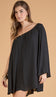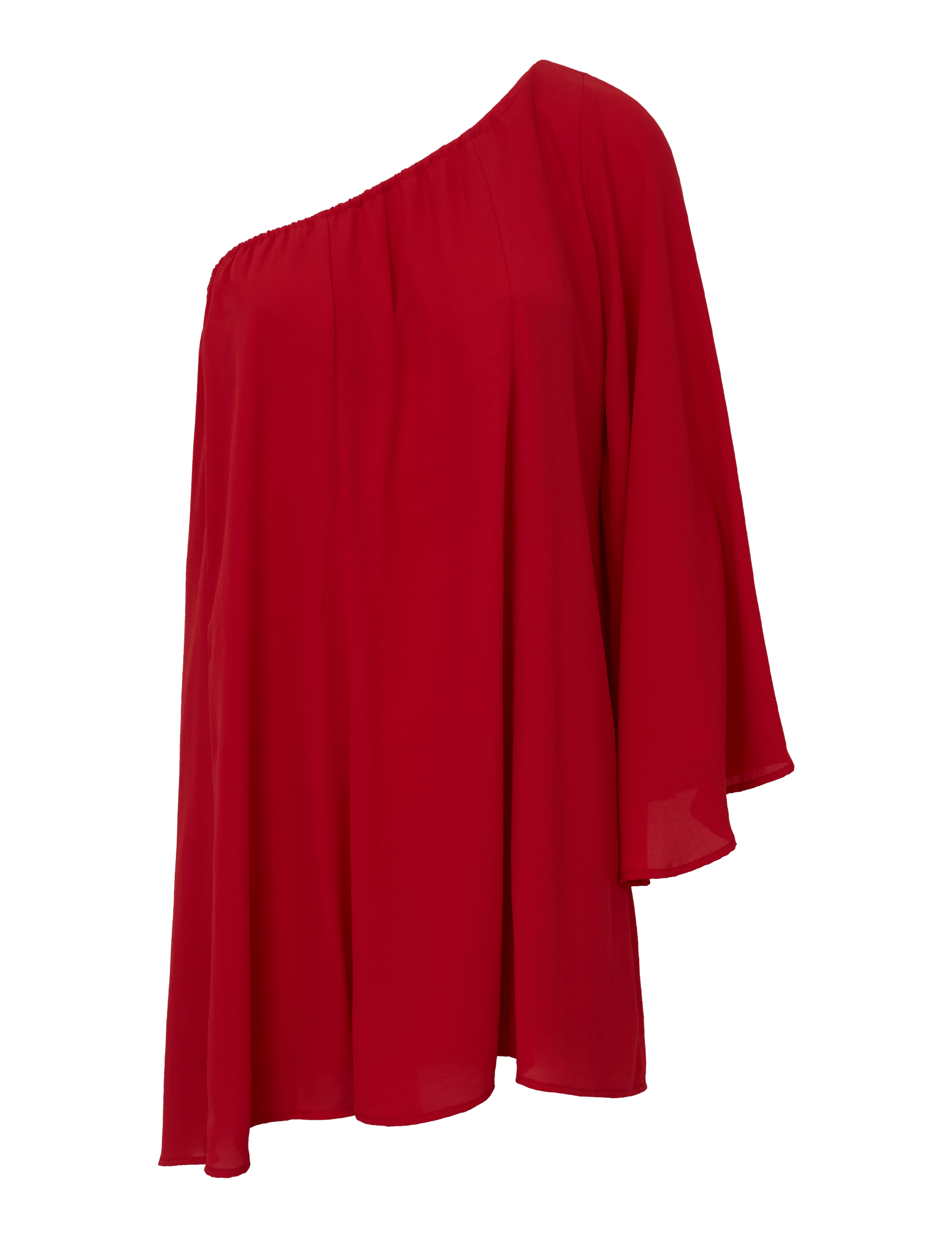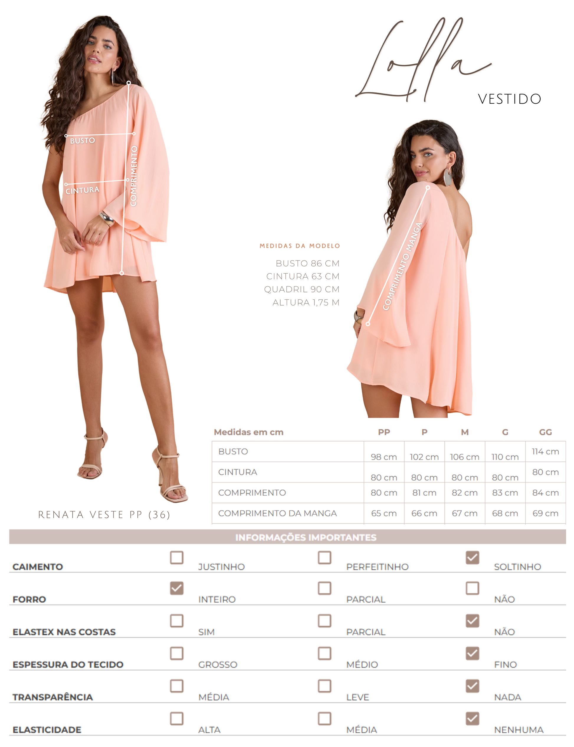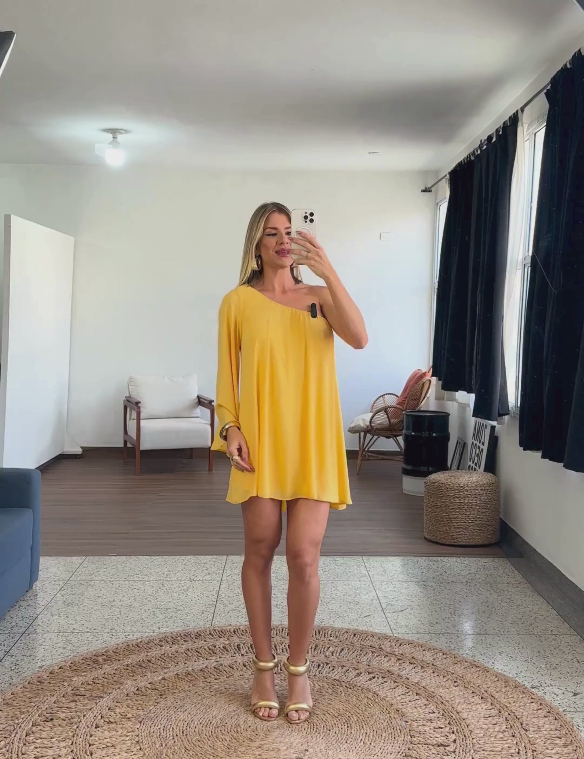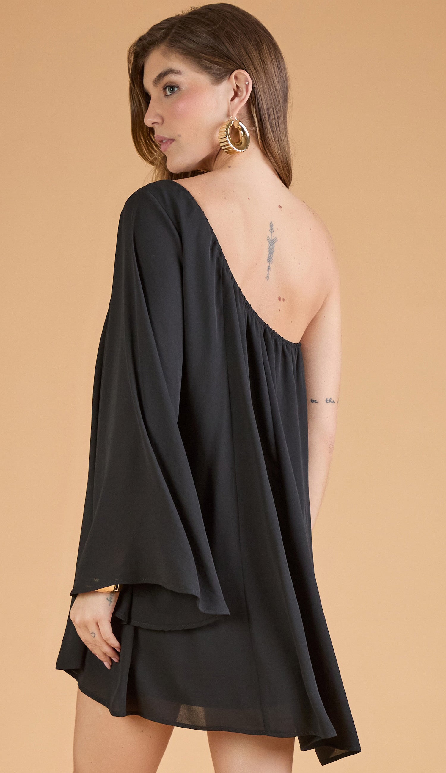 Vestido curto e amplo confeccionado em crepe leve com forro. Possui decote ombro único com elástico fino interno franzido, manga longa sino ampla e nesgas no comprimento da peça, deixando com aspecto bem esvoaçante.