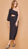 Vestido longo com forro, confeccionado em viscolinho. Possui decote ombro único com elástico fino embutido para melhor ajuste ao corpo, manga longa bufante com lastex no punho. Nas laterais, conta com fechamento por zíper invisível, abertura na região da cintura com elástico e fendas na saia.