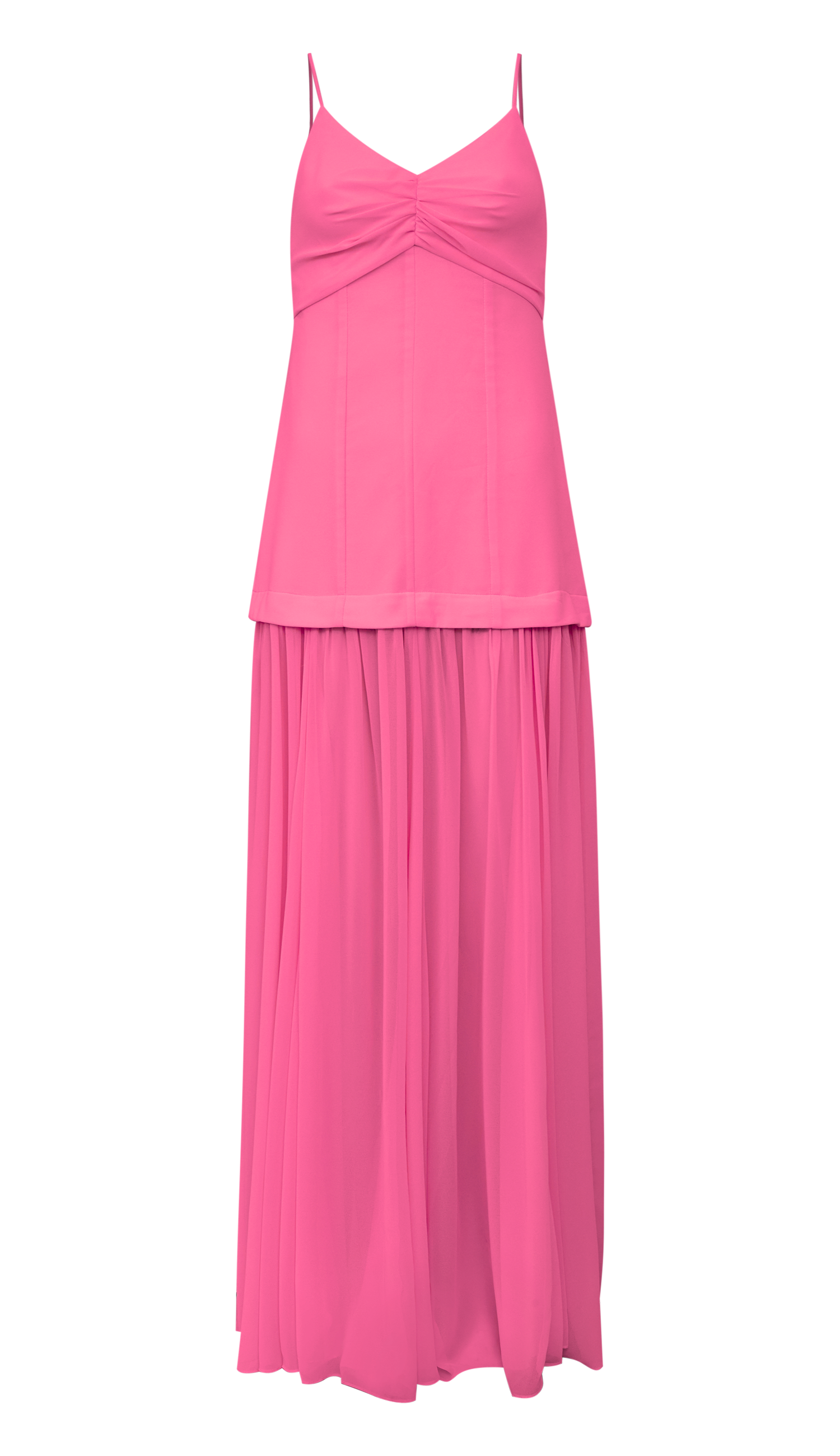 Vestido longo confeccionado em crepe com forro. Possui decote em V com franzidinho no centro do busto que dá um volume charmoso, alcinhas reguláveis, recortes logo abaixo do busto e no corpo da peça que desenham a sillhueta, fechamento traseiro por zíper invisível e forro somente até a altura do quadril, onde conta com um recorte com pala, seguido de saia solta franzidinha e com leve transparência que dá um aspecto bem fluido ao look.