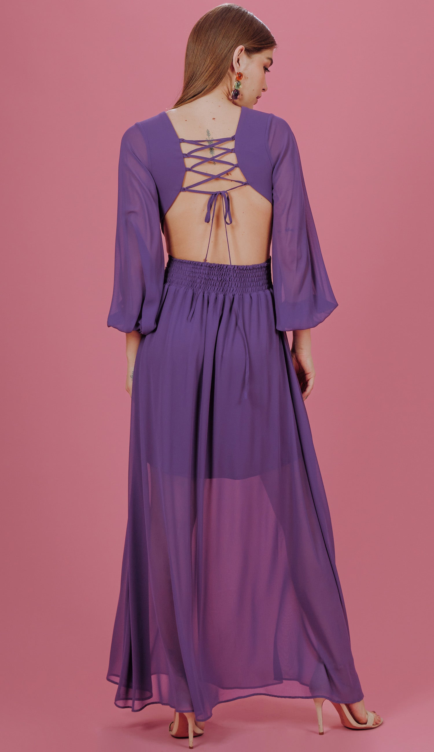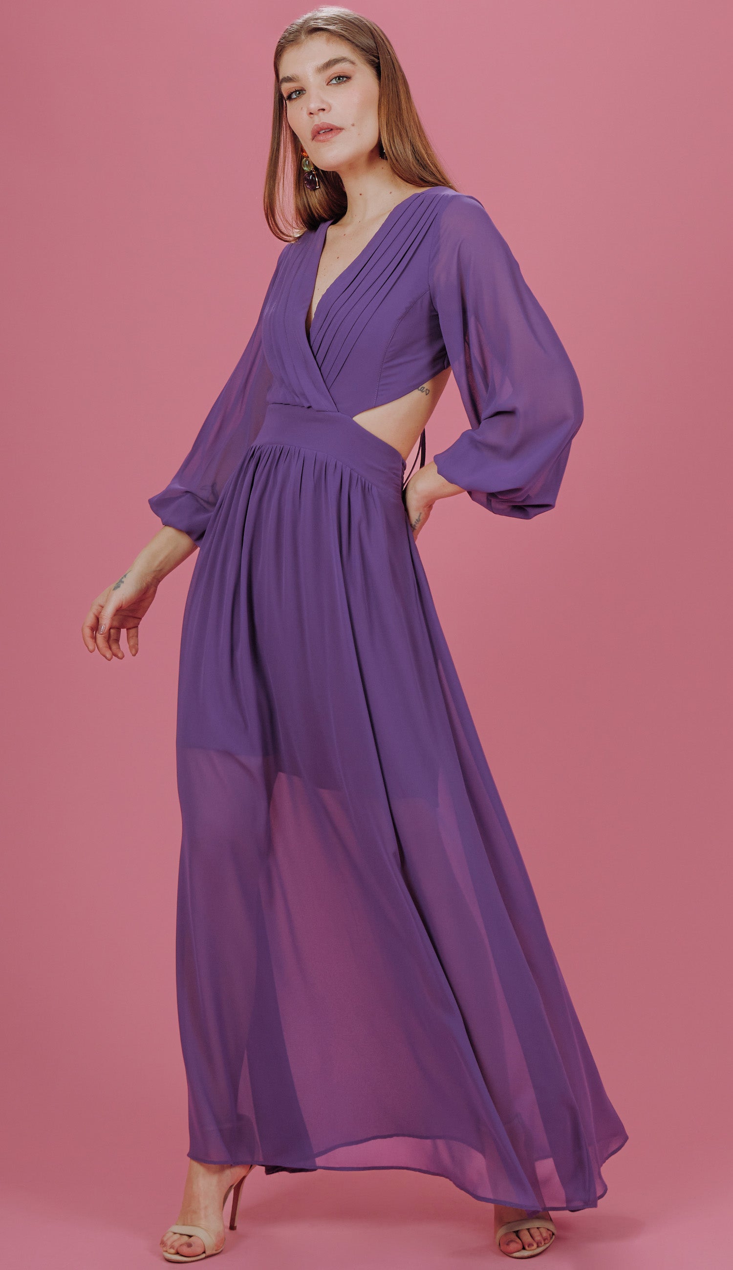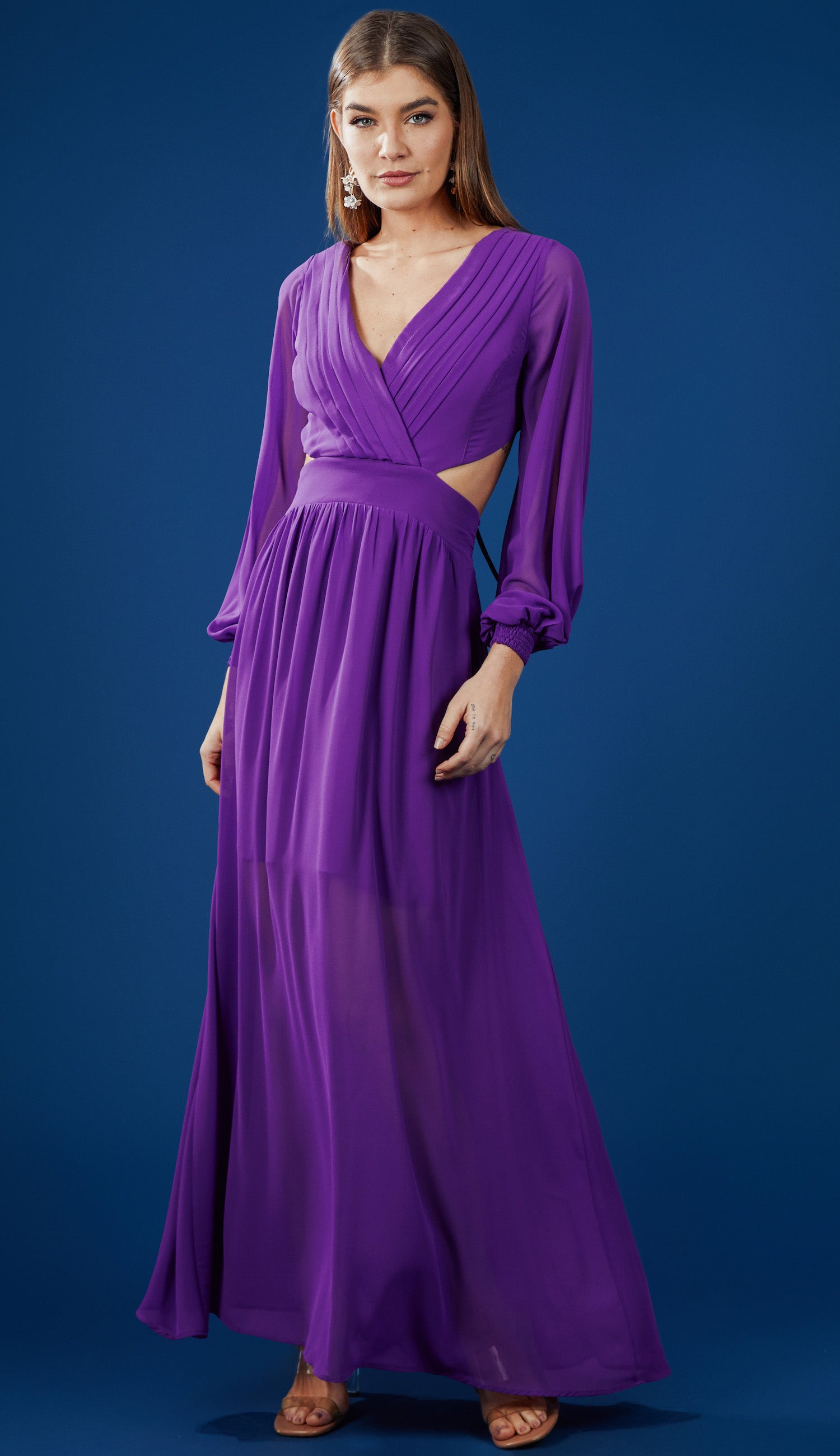 Vestido longo confeccionado em crepe com forro. Possui mangas longas com lastex no punho, decote frontal em V transpassado com detalhe de pregas e nas costas decote nadador com alças finas cruzadas para amarração. O busto é fixo à saia somente por recorte frontal, deixando toda a região da cintura à mostra. A saia possui franzidos e lastex atrás para maior conforto.
