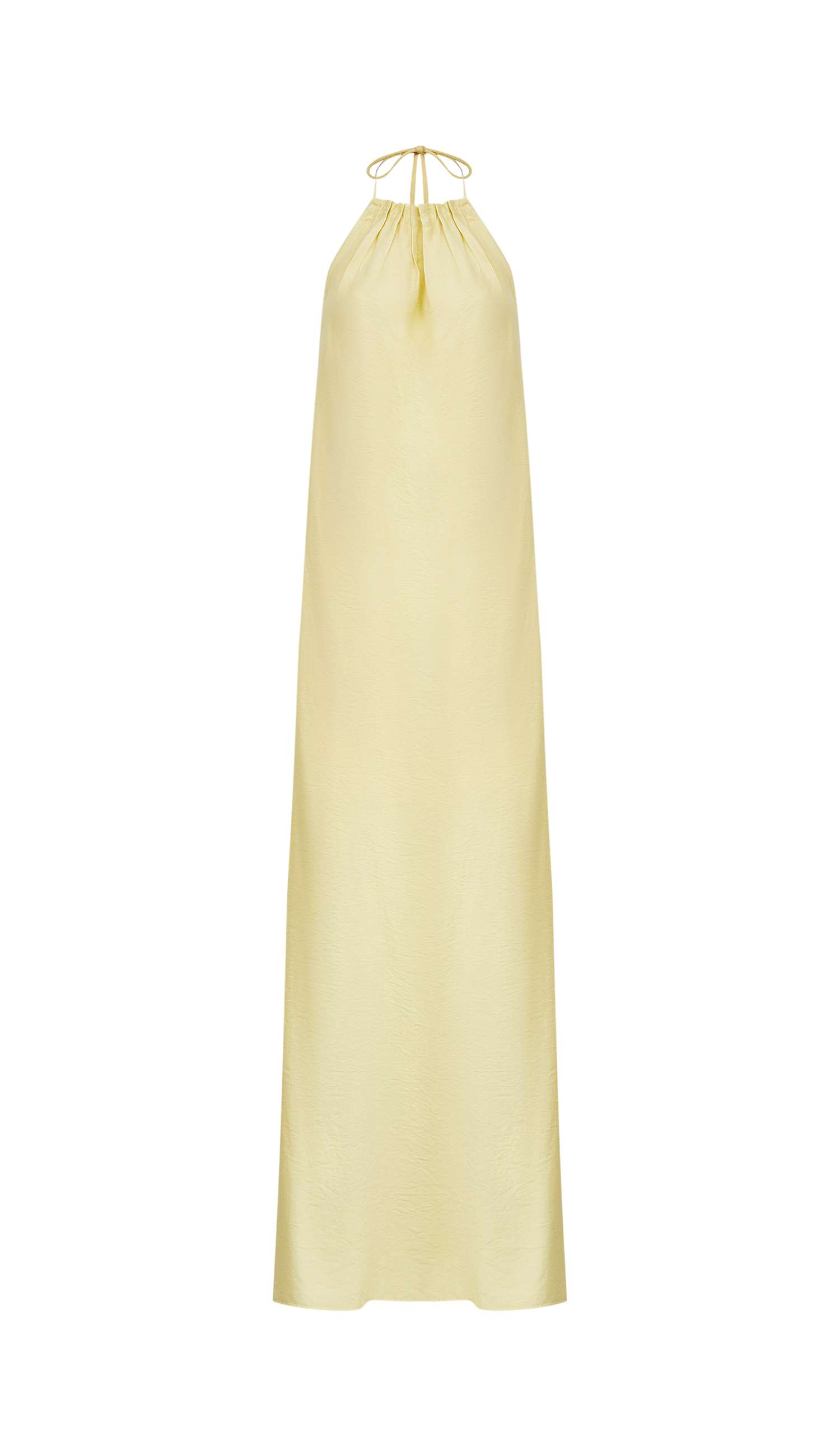 Vestido longo frente única confeccionado em viscolinho texturizado com forro. Possui modelagem soltinha, decote halter com franzidinhos, tirinha embutida com ponteiras de metal em formato de conchinha para amarração na nuca e decote nas costas com tirinha embutida também para ajuste e amarração com as mesmas ponteiras de conchinha.