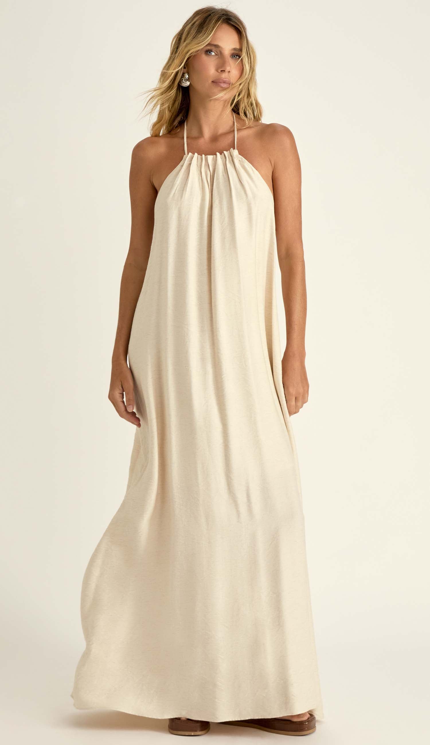 Vestido longo frente única confeccionado em viscolinho texturizado com forro. Possui modelagem soltinha, decote halter com franzidinhos, tirinha embutida com ponteiras de metal em formato de conchinha para amarração na nuca e decote nas costas com tirinha embutida também para ajuste e amarração com as mesmas ponteiras de conchinha.