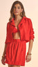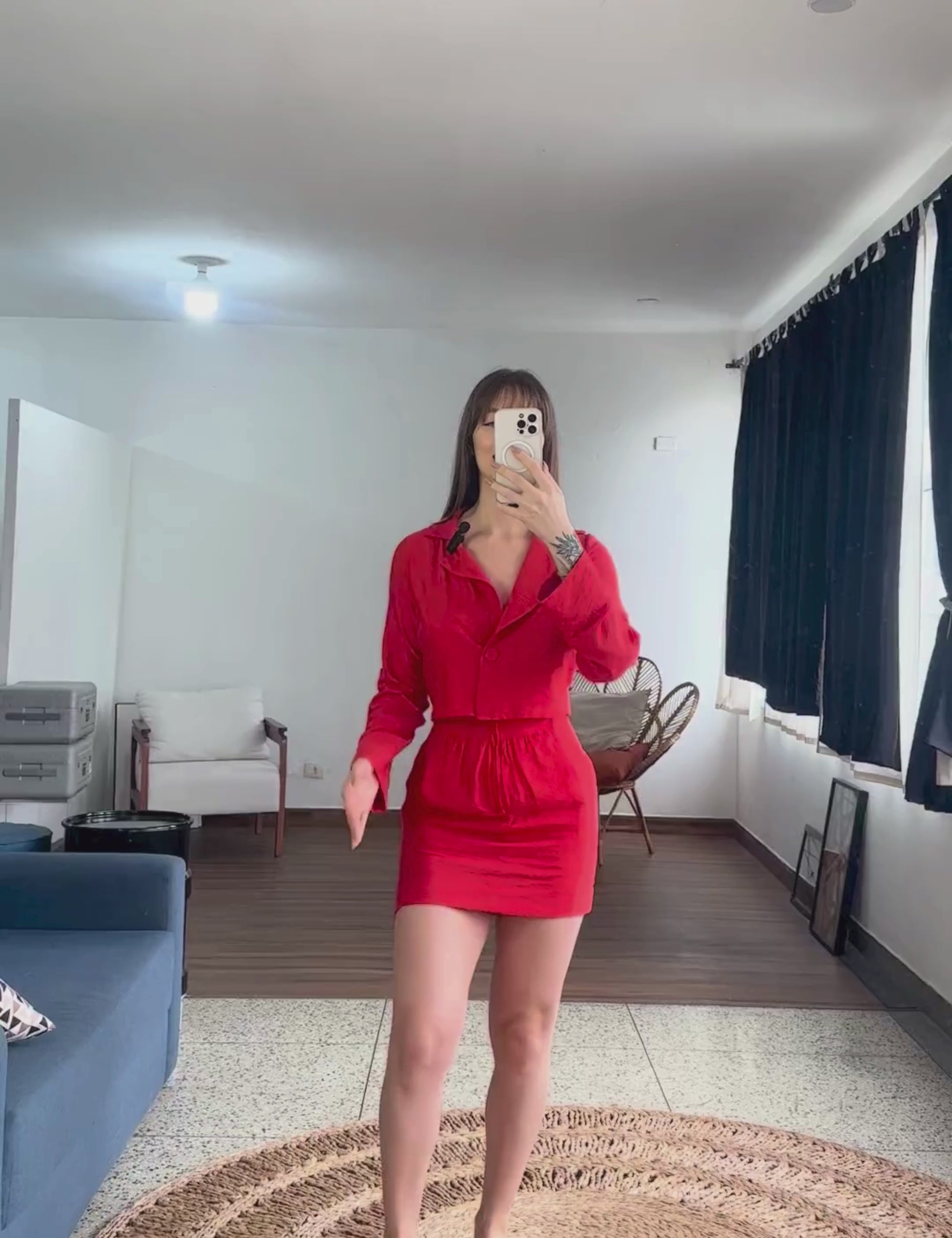 Vestido curto confeccionado em poliviscose texturizado com efeito amassadinho e aparência levemente cintilante. Possui frente aberta com lapelas dobradas, deixando uma aparência de blazer, mangas longas com martingale para ajuste e fechamento por botão forrado. A saia é ajustada, possui forro, fechamento frontal por zíper, detalhe de recorte, franzidinhos e bolsos. O vestido acompanha top de amarrar confeccionado no mesmo tecido com alcinhas reguláveis, parecendo um conjunto.