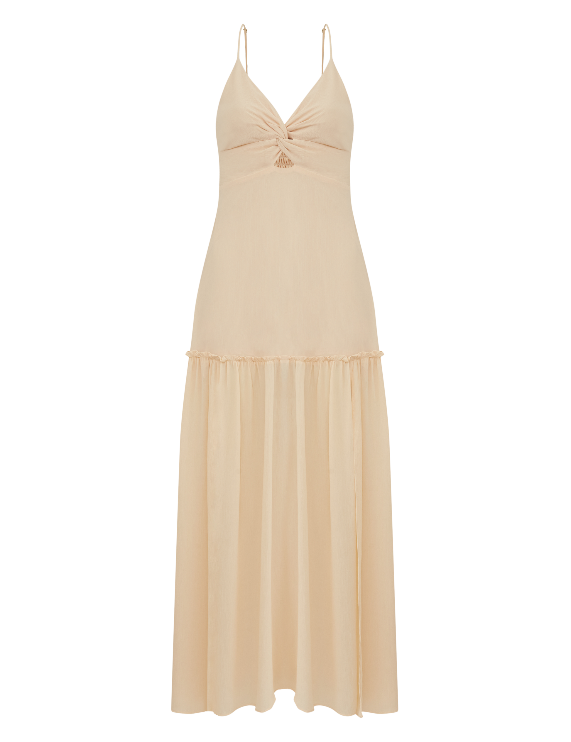 Vestido midi confeccionado em crepe leve texturizado com forro. Possui decote em V com nó transpassado fixo no centro do busto, alcinhas reguláveis, fechamento lateral por zíper invisível, lastex franzido nas costas para melhor ajuste ao corpo e recorte na saia com babadinhos e franzidos, seguido de fenda frontal.