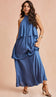 Vestido longo regata amplo com forro, confeccionado em viscose com toque e aspecto de linho. Possui decote halter, fechamento traseiro na gola por botões esmaltados, elástico interno na cava para melhor caimento da peça, detalhe frontal no centro da peça de trança no mesmo tecido aplicada e camadas de babados ao longo do comprimento, que dão muito movimento e leveza.