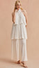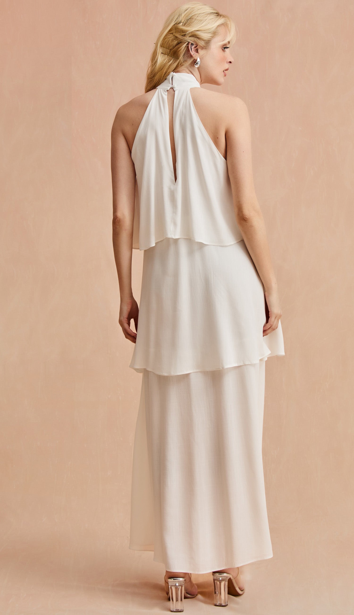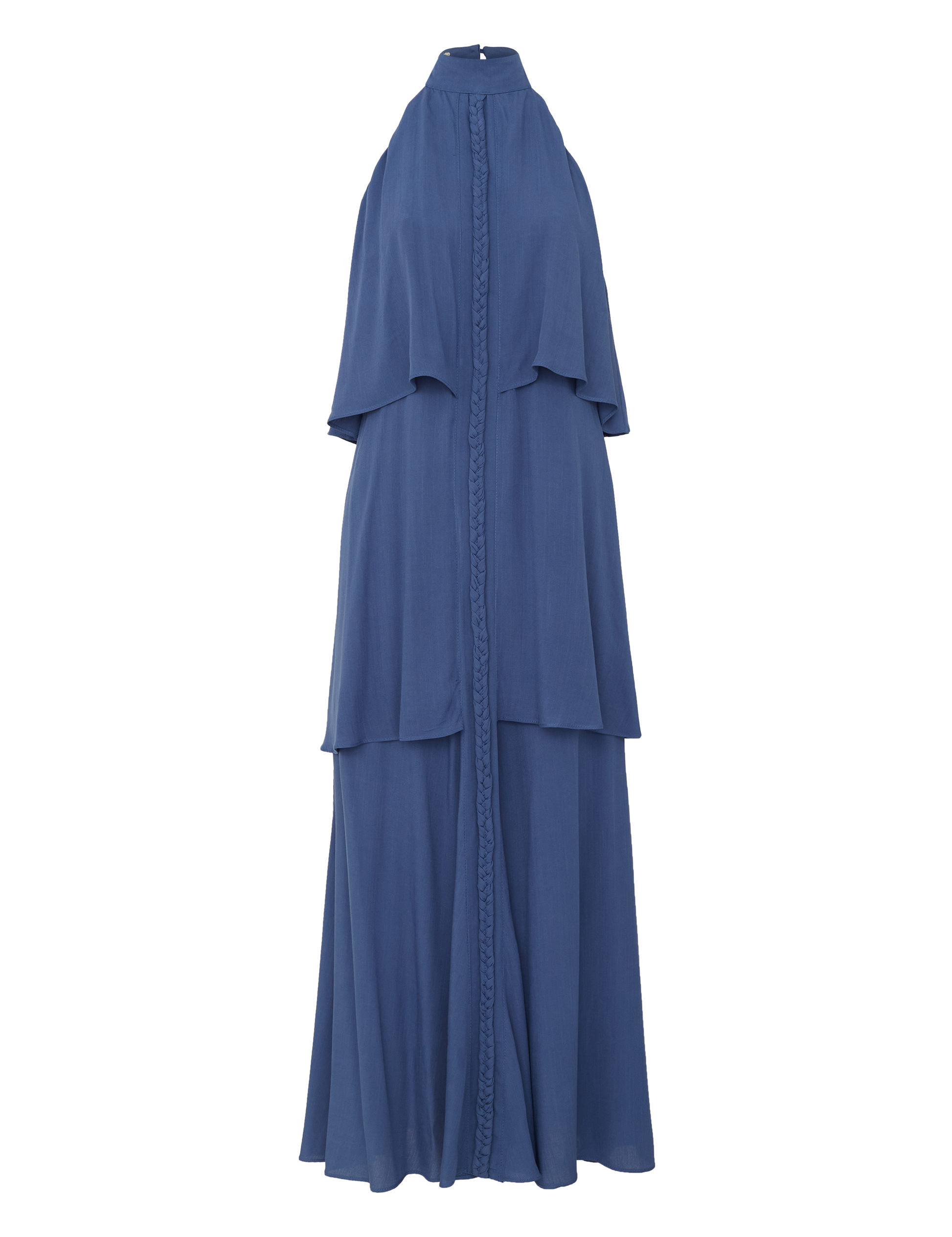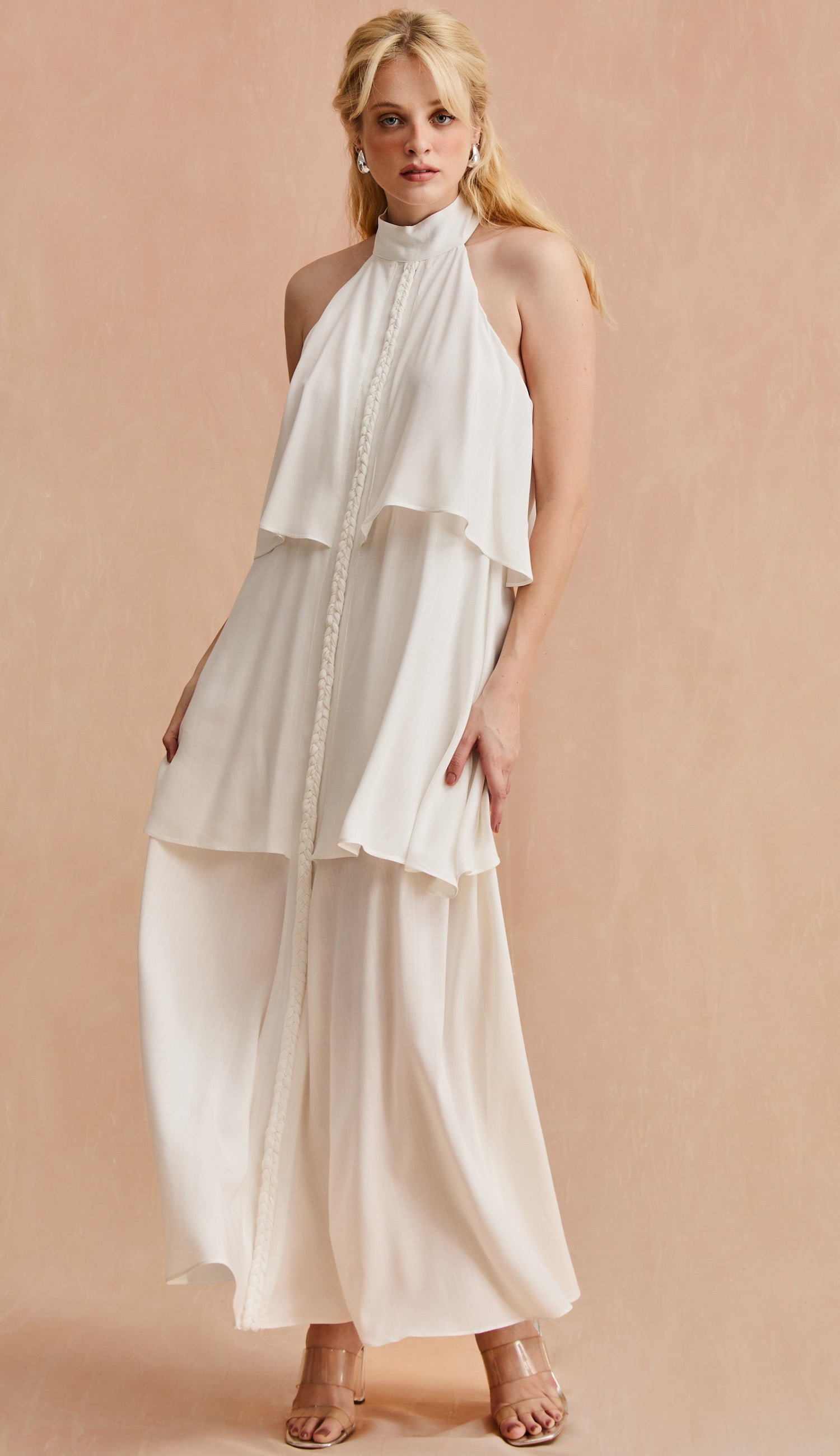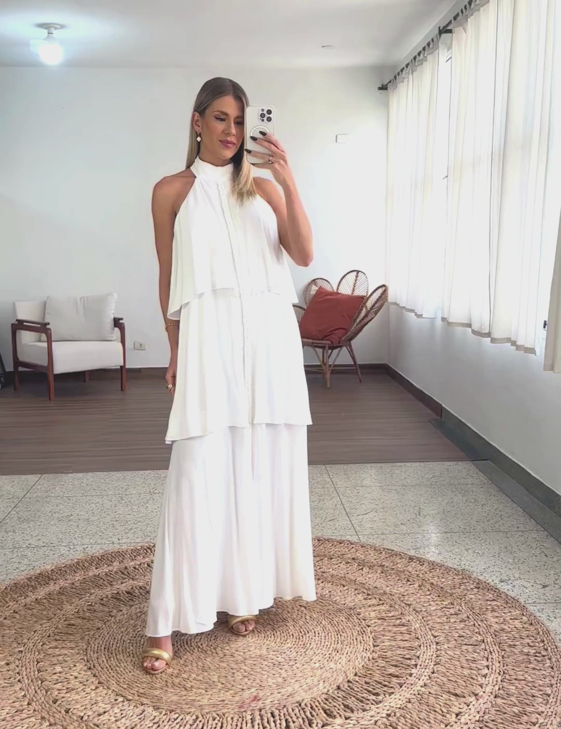 Vestido longo regata amplo com forro, confeccionado em viscose com toque e aspecto de linho. Possui decote halter, fechamento traseiro na gola por botões esmaltados, elástico interno na cava para melhor caimento da peça, detalhe frontal no centro da peça de trança no mesmo tecido aplicada e camadas de babados ao longo do comprimento, que dão muito movimento e leveza.