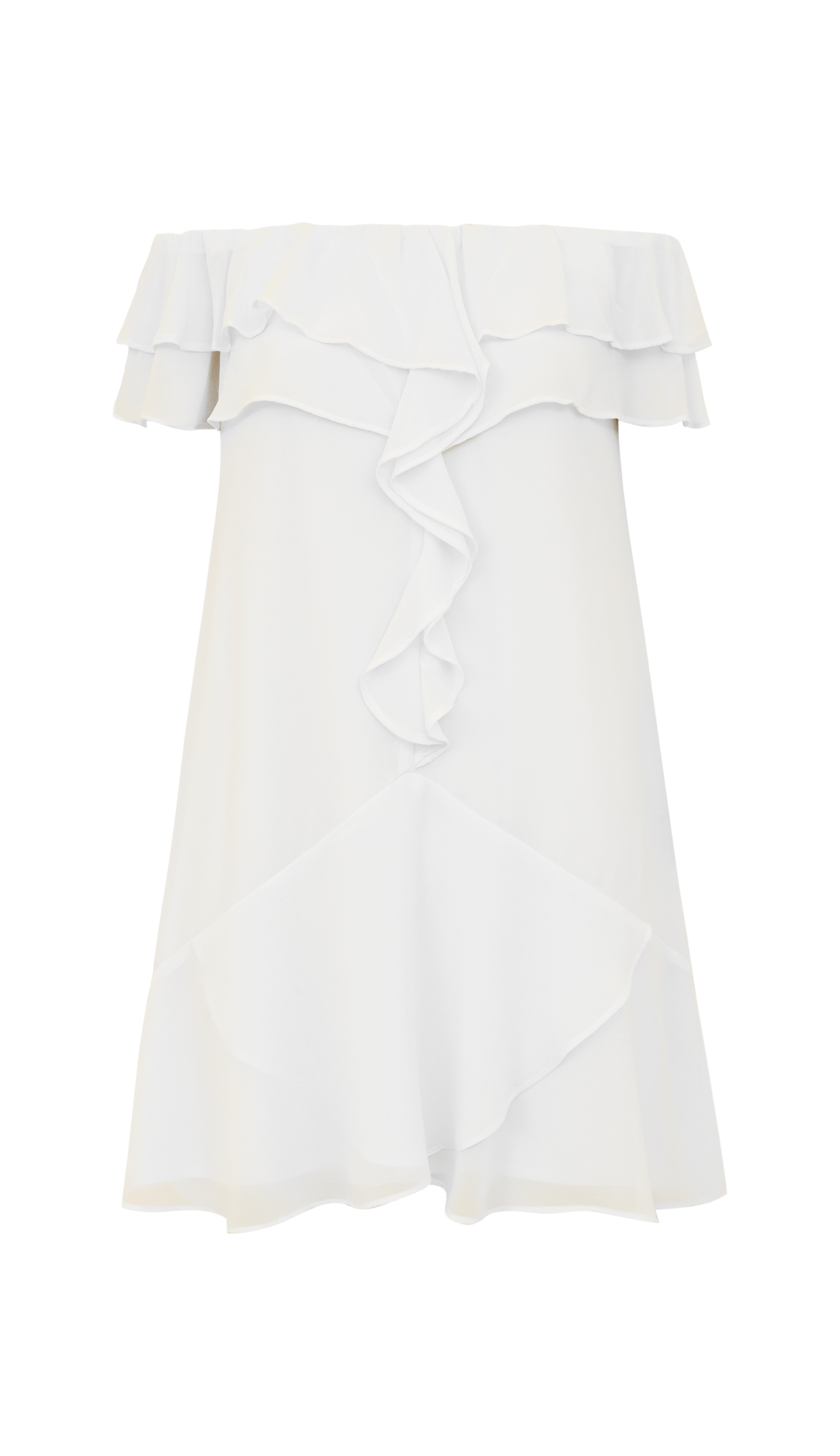 Vestido curto soltinho confeccionado em crepe leve com forro. Possui decote ciganinha com elástico interno franzido e aplicação de duas camadas de babadinhos sobrepostos nessa região, que se estendem até centro da peça, em cascata, até a altura do recorte assimétrico próximo à barra que, também tem babadinhos.