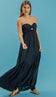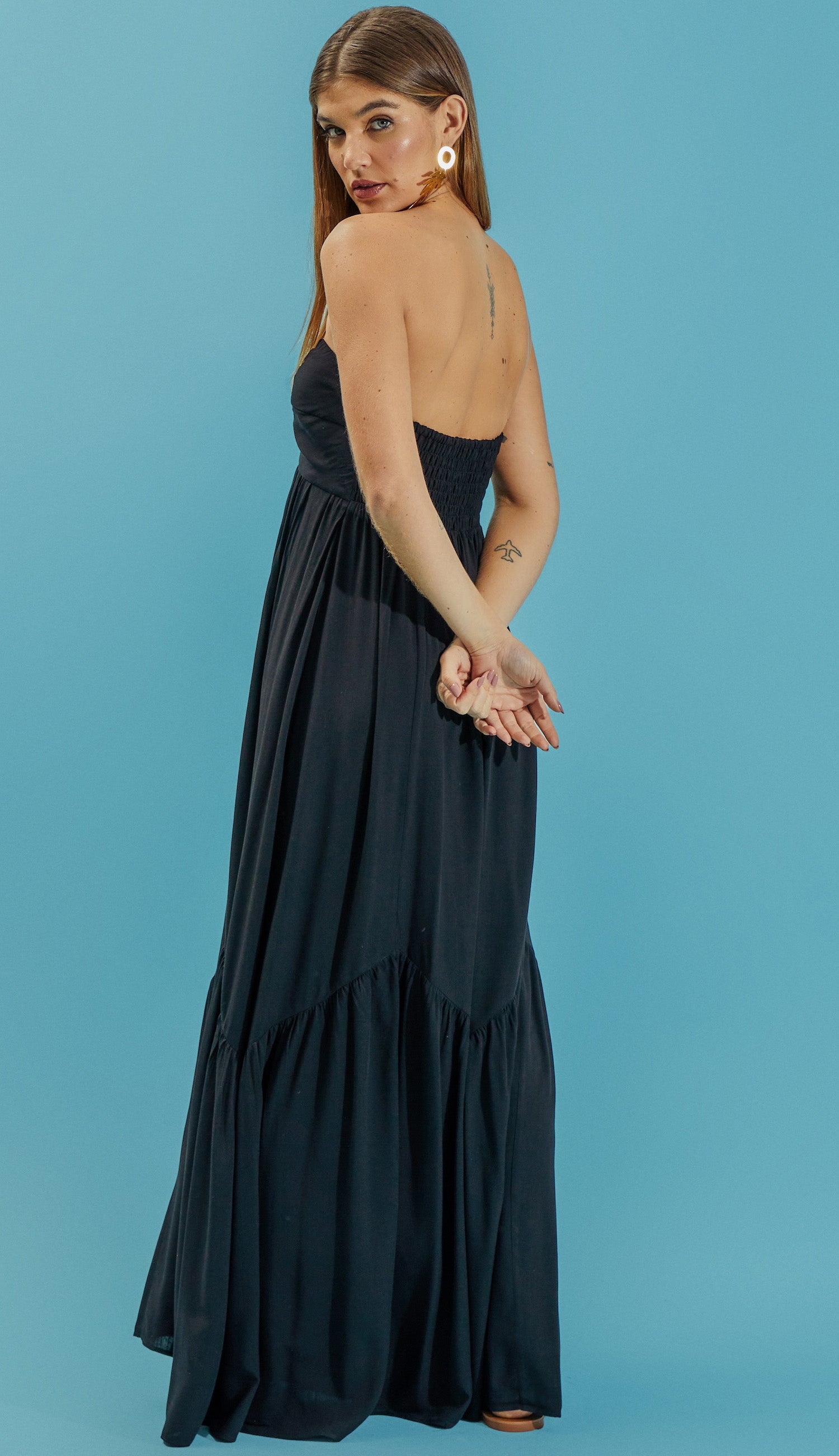 Vestido longo com forro, confeccionado em viscose com toque e aspecto de linho. Não possui mangas e conta com decote coração com silicone elástico interno para melhor sustentação, detalhe de torção em nó com vazado no centro busto, lastex nas costas e modelagem império com marcação logo abaixo do busto e saia soltinha logo em seguida, com franzidinhos e nesgas com recortes também franzidinhos na barra da saia.