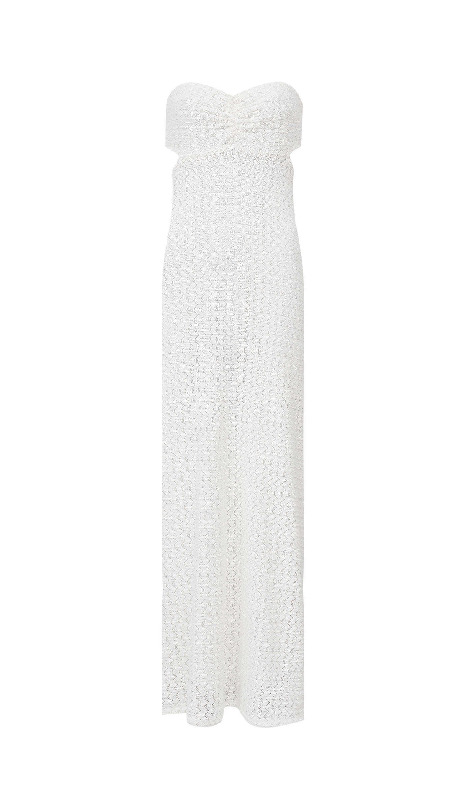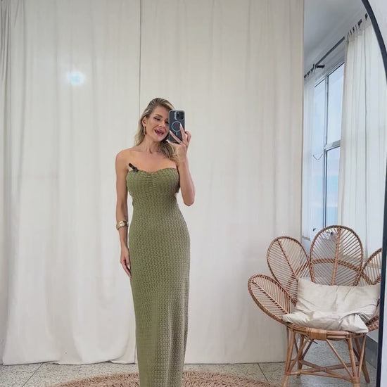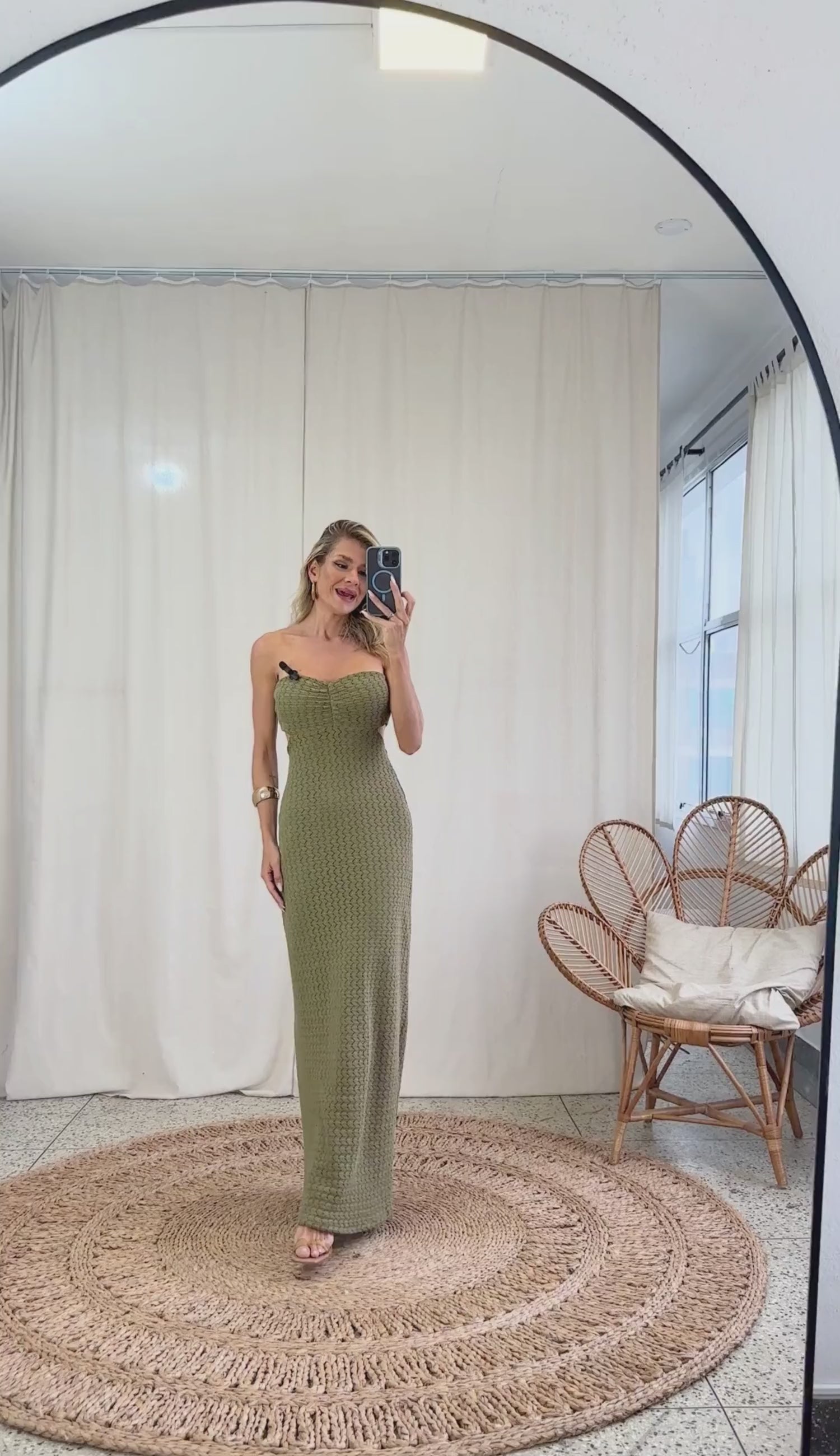 Vestido longo de tricô com forro sem mangas. Possui modelagem ajustada ao corpo e soltinha na saia, estilo sereia; decote coração com silicone elástico interno pra dar mais sustentação e detalhe de franzidinho no centro, parte do busto fixa apenas na frente, deixando toda a região da cintura à mostra; fechamento traseiro do busto por amarração por tiras fixas e elástico nas costas da saia para melhor ajuste ao corpo.