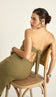 Vestido longo de tricô com forro sem mangas. Possui modelagem ajustada ao corpo e soltinha na saia, estilo sereia; decote coração com silicone elástico interno pra dar mais sustentação e detalhe de franzidinho no centro, parte do busto fixa apenas na frente, deixando toda a região da cintura à mostra; fechamento traseiro do busto por amarração por tiras fixas e elástico nas costas da saia para melhor ajuste ao corpo.
